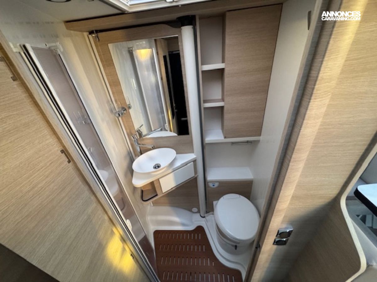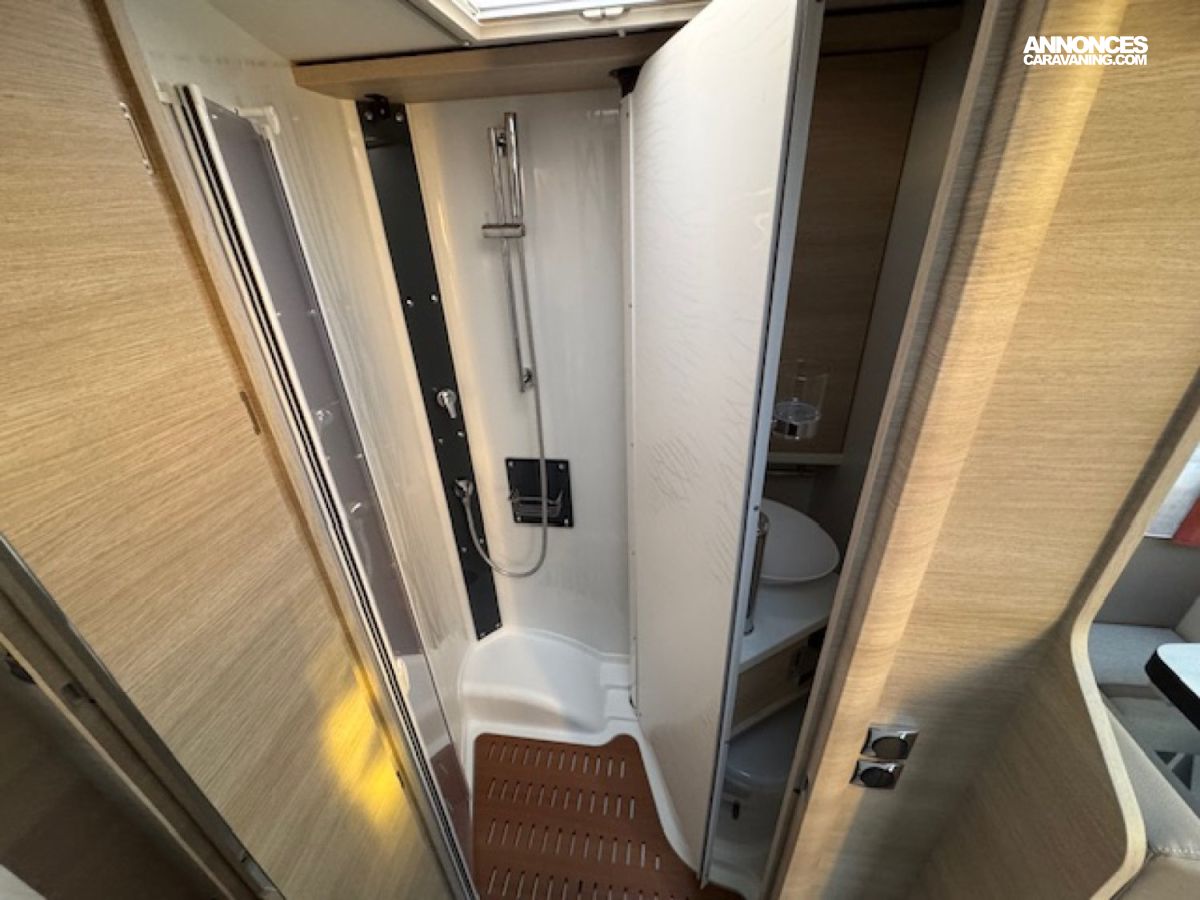 Le cabinet de toilette répond au standard Duo Space de la marque Rapido. Entendez par là qu un compartiment unique abrite la douche, le lavabo et les WC. On fait pivoter la paroi pour passer de l un à l autre. Enfin, le camping-car dispose d un toit vitré au-dessus du salon (de série) et d un lit de dînette.