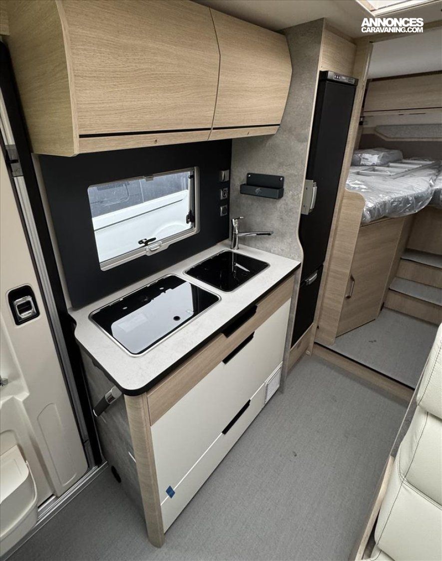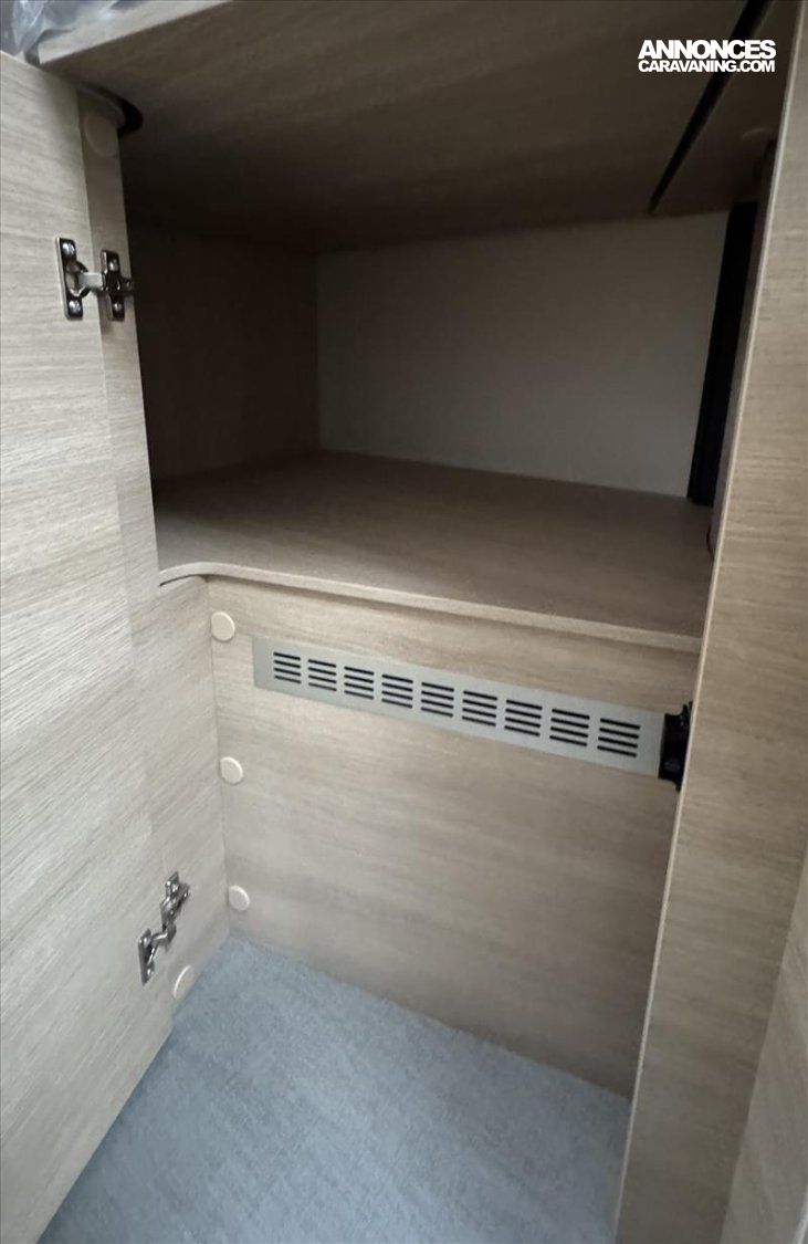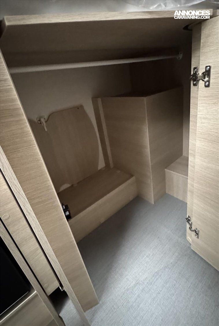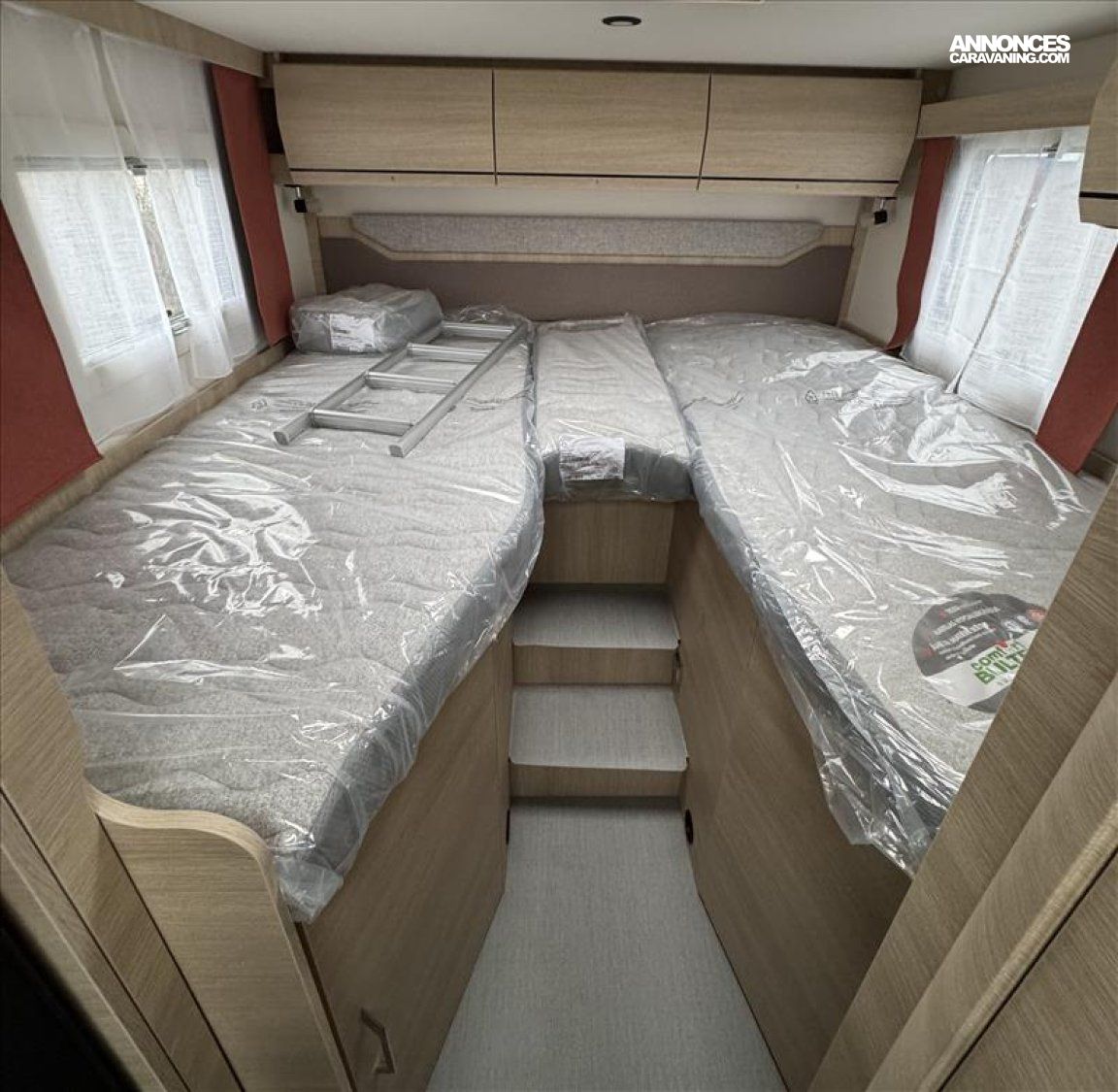 Réfrigérateur à compression 140 L, Hotte aspirante encastrée avec éclairage LED, Lits jumeaux (80 x 199 cm + 80 x 185 cm) transformables en l, Caillebotis douche type teck, Salon convertible en couchage d'appoint 1 place, Soute/garage chauffé