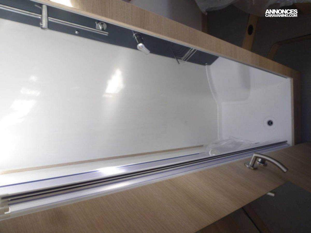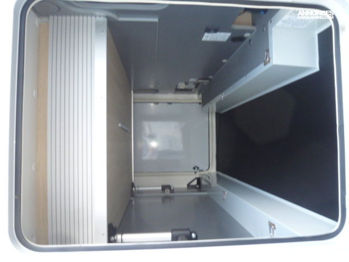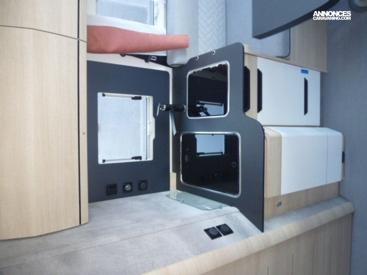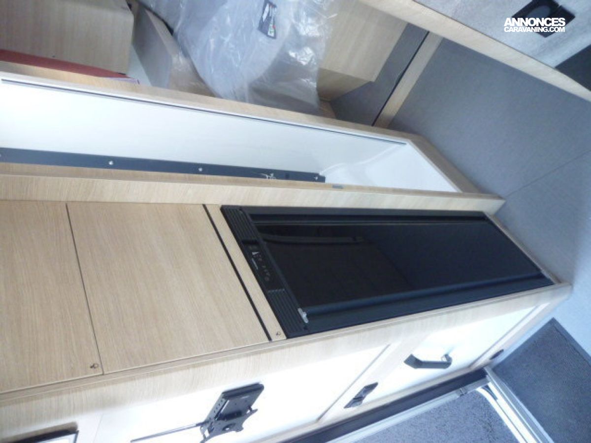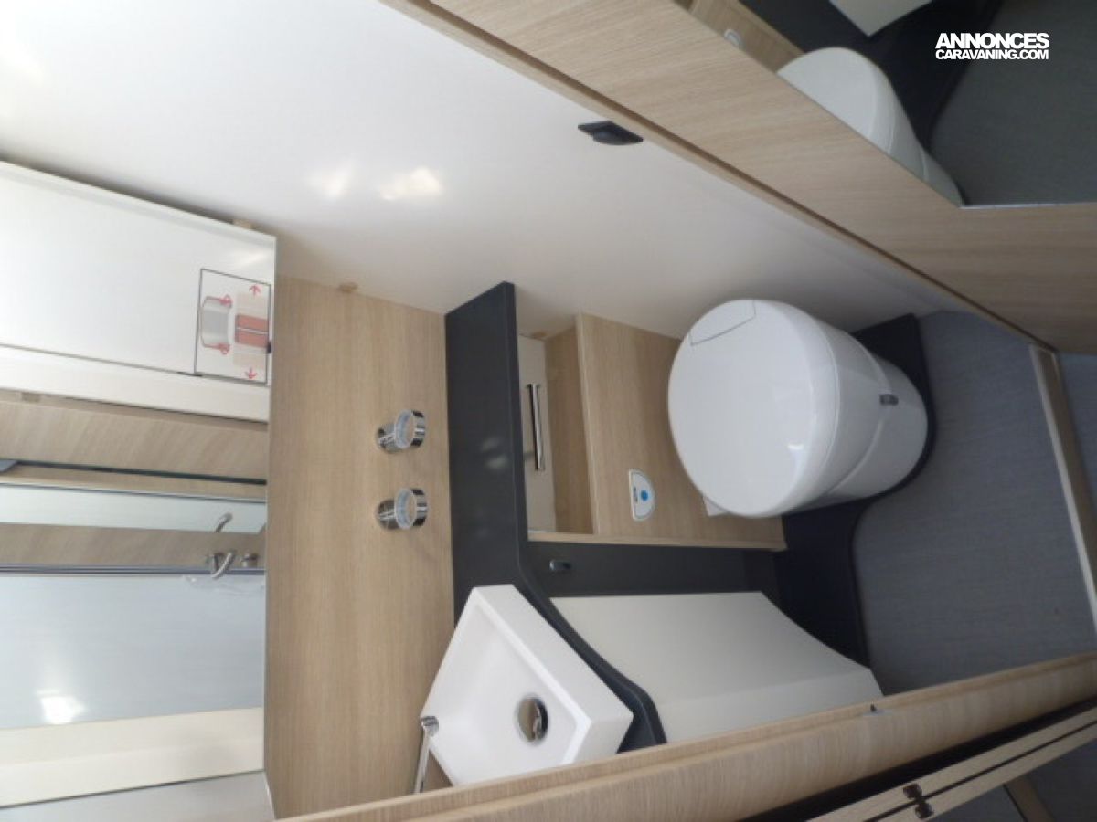 Cuisine en long, Douche indépendante, Lit central, Lit dînette avant, Salon avant banquettes face à face, Salon avant sièges pivotants, Soute réglable en hauteur, WC Cassette.