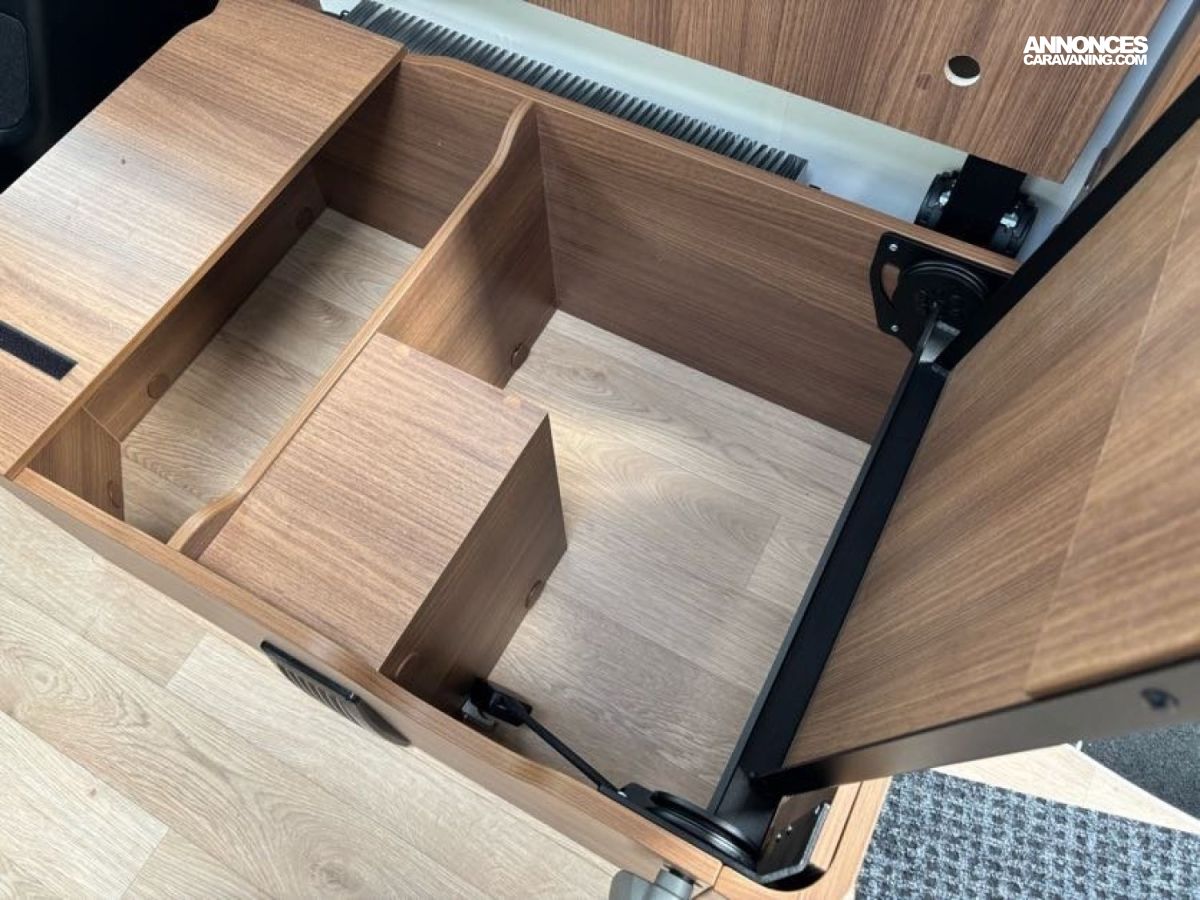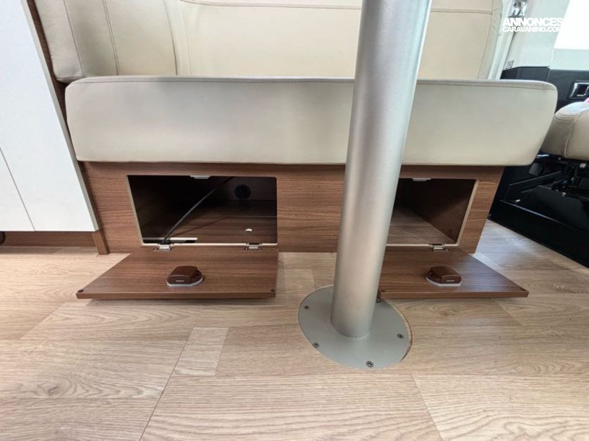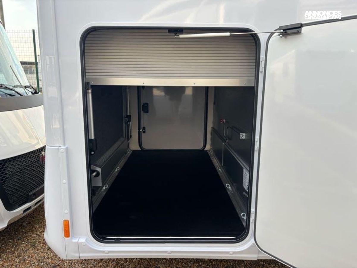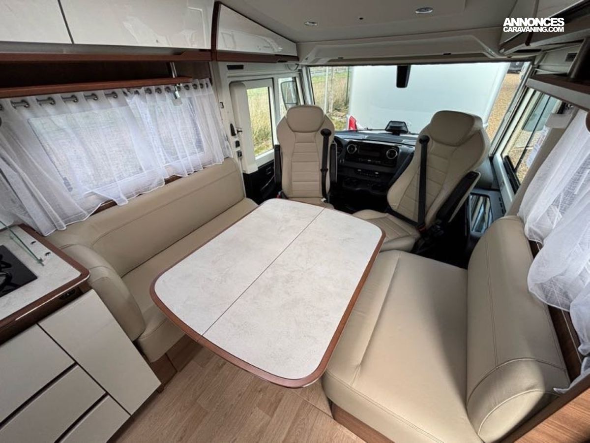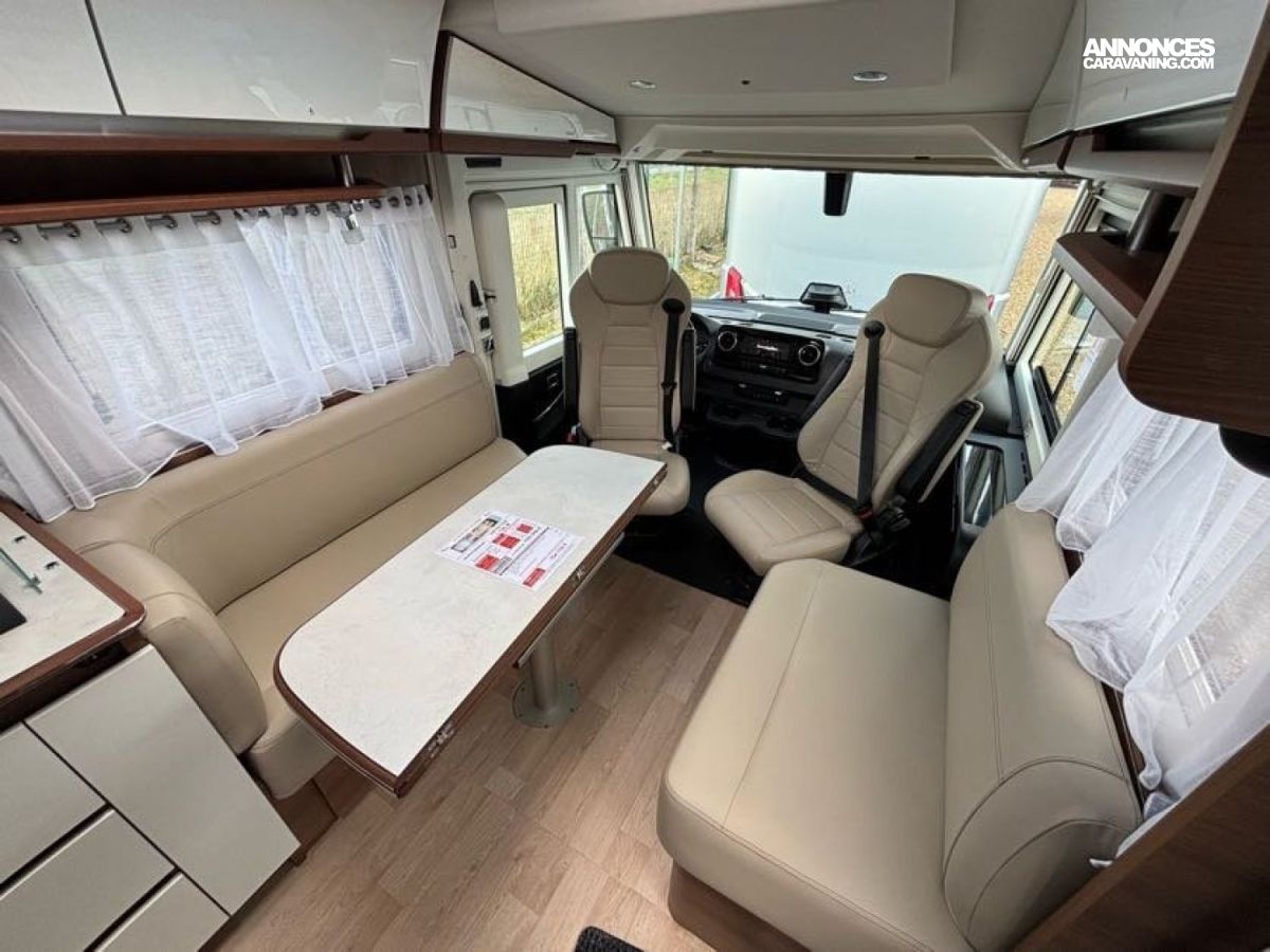 Cuisine en L, Douche indépendante, Grande soute, Lit central, lit pavillon cabine, Maxi salon, Salon avant banquettes face à face, Salon avant sièges pivotants, WC Cassette.