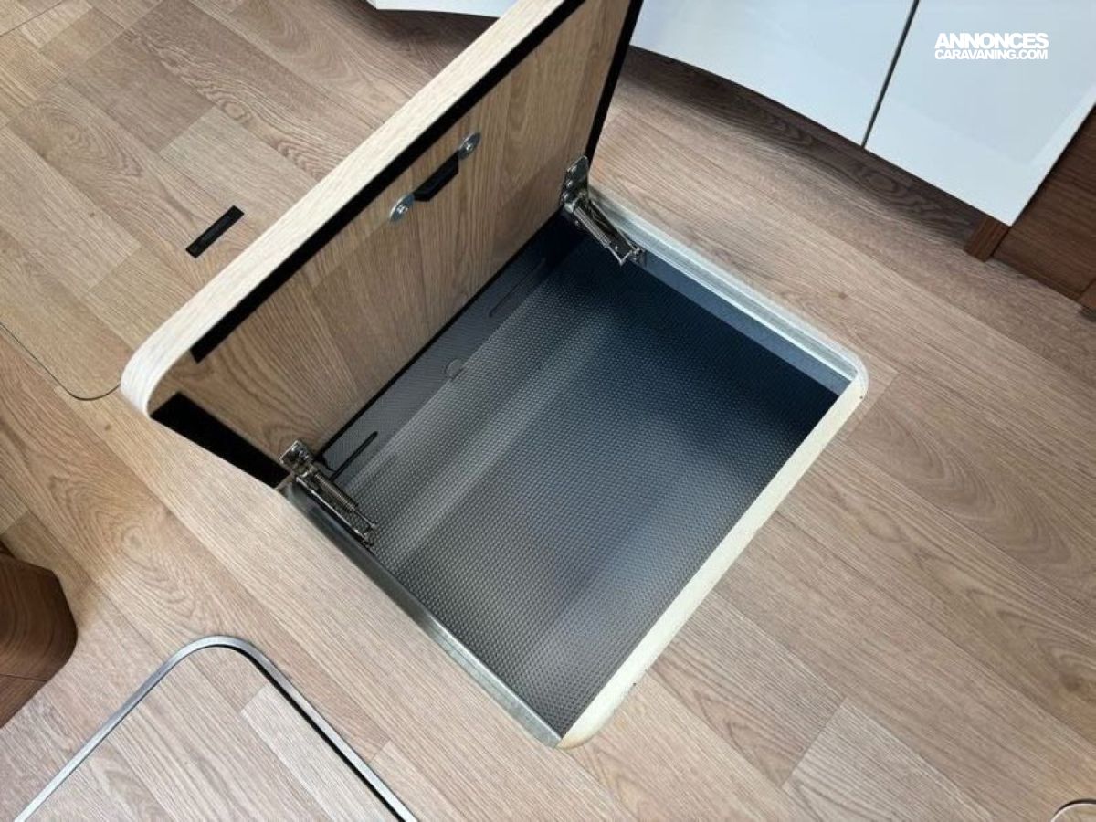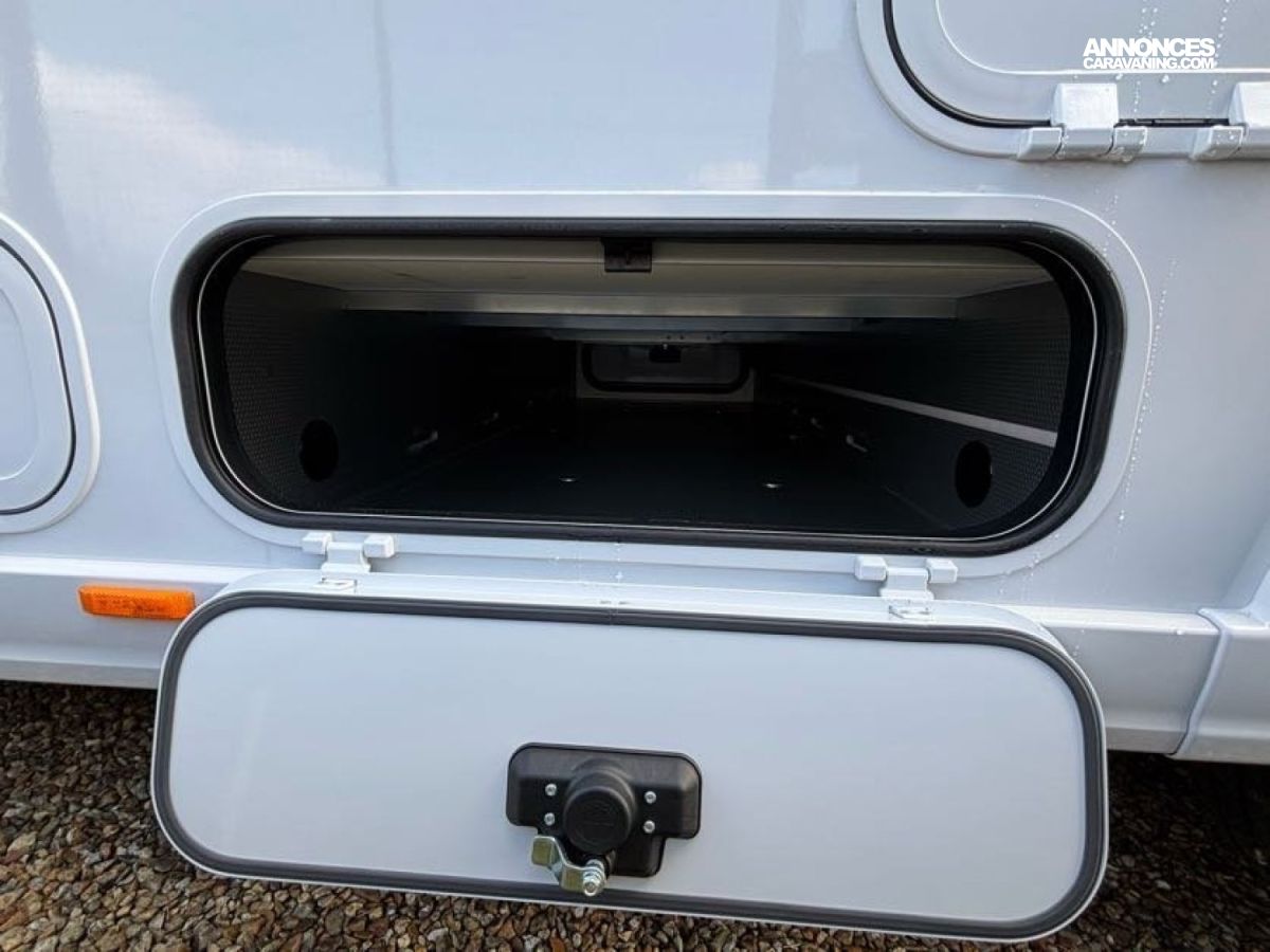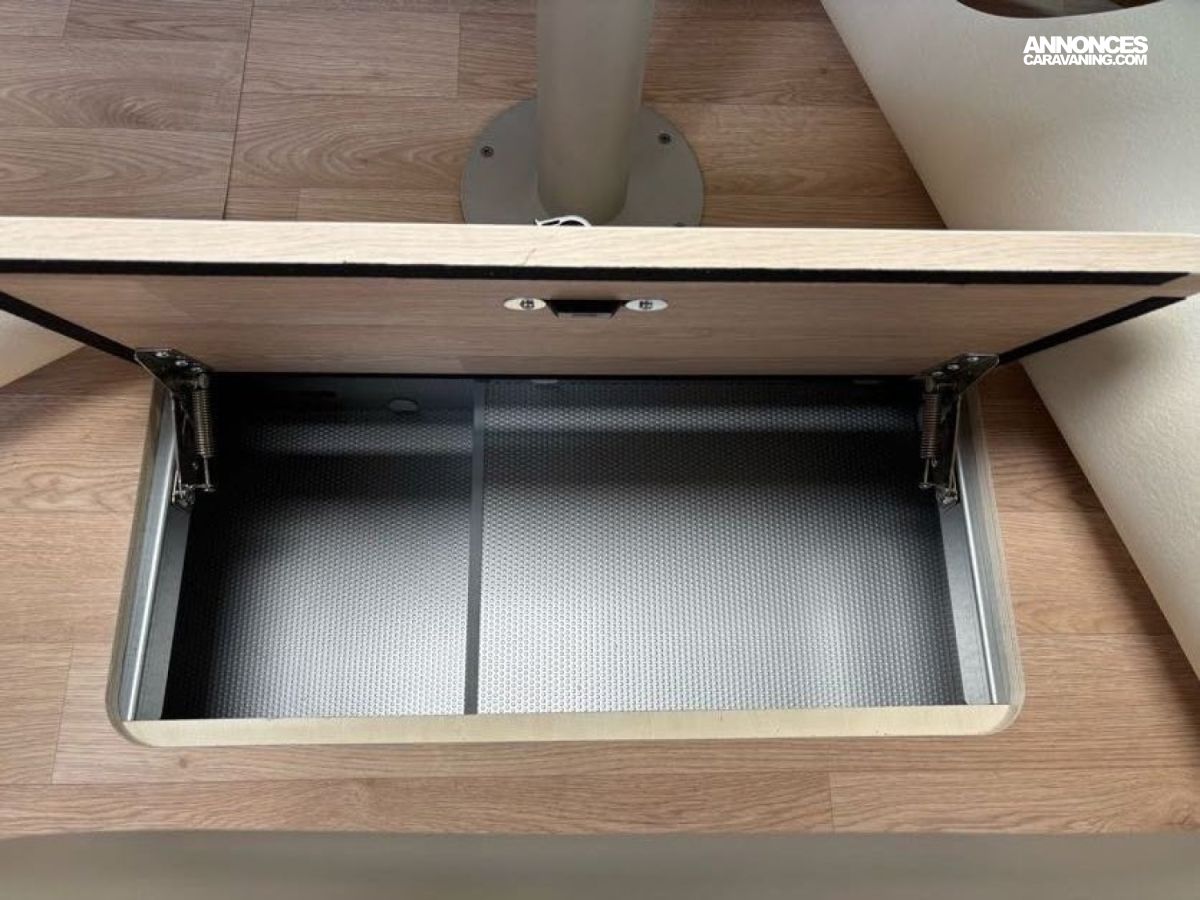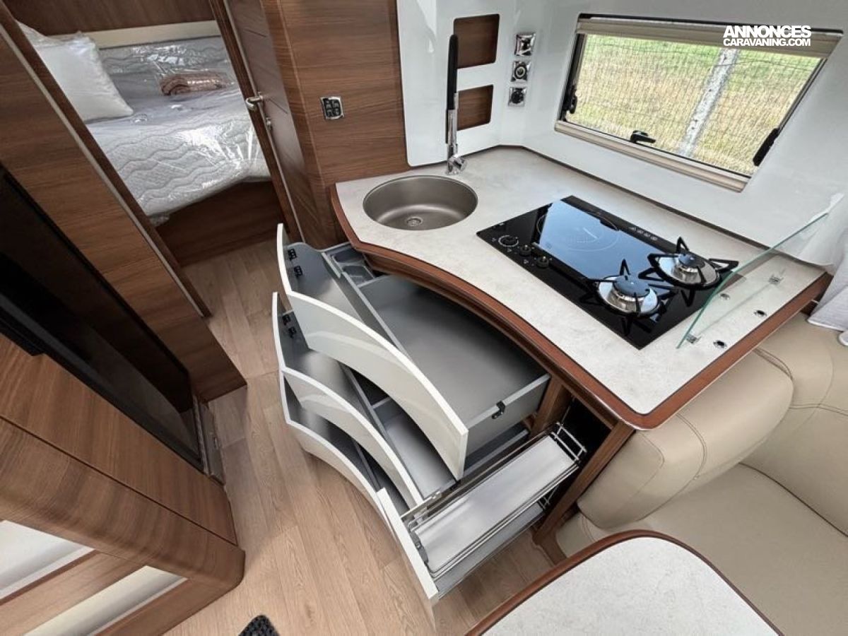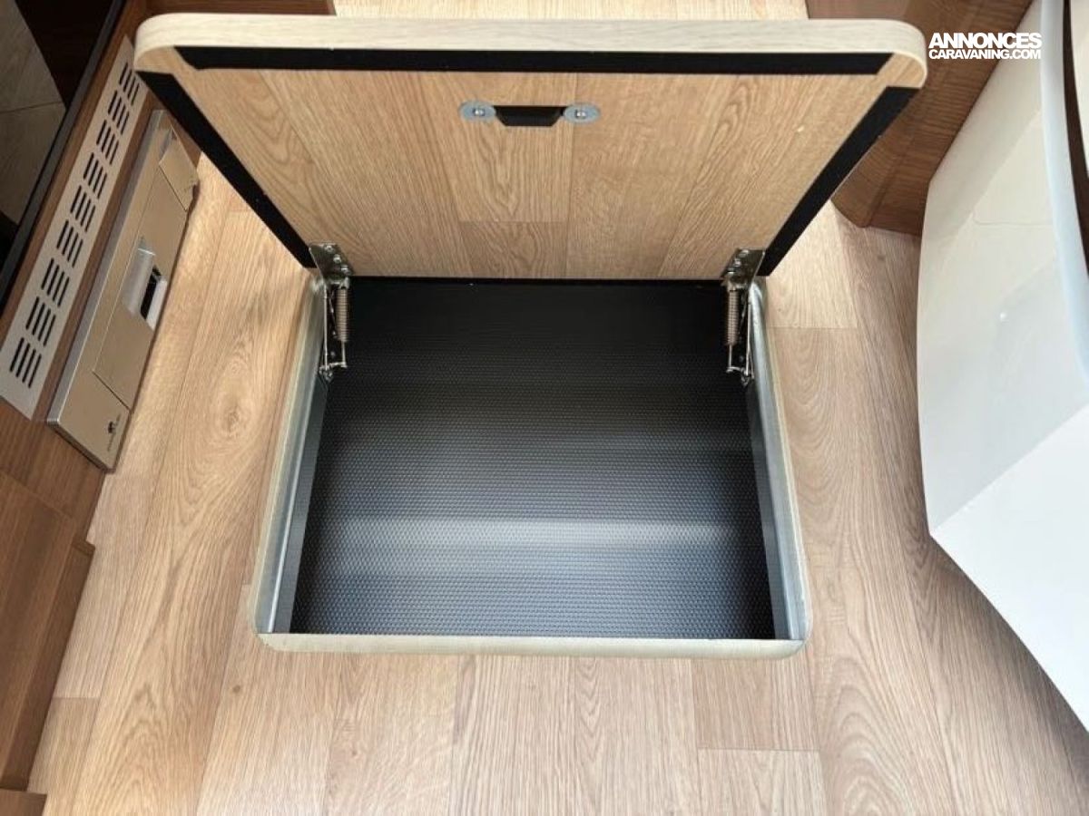 Cuisine en L, Douche indépendante, Grande soute, Lit central, lit pavillon cabine, Maxi salon, Salon avant banquettes face à face, Salon avant sièges pivotants, WC Cassette.