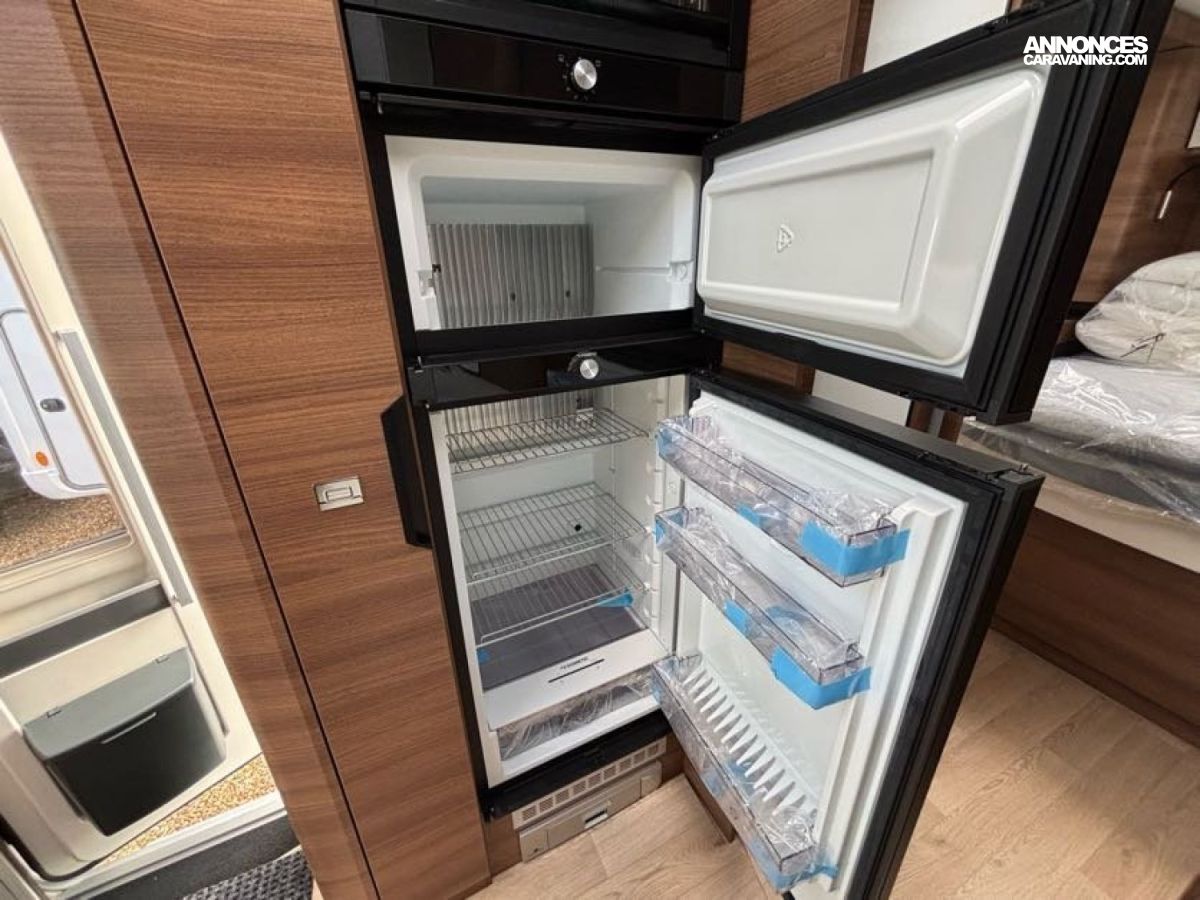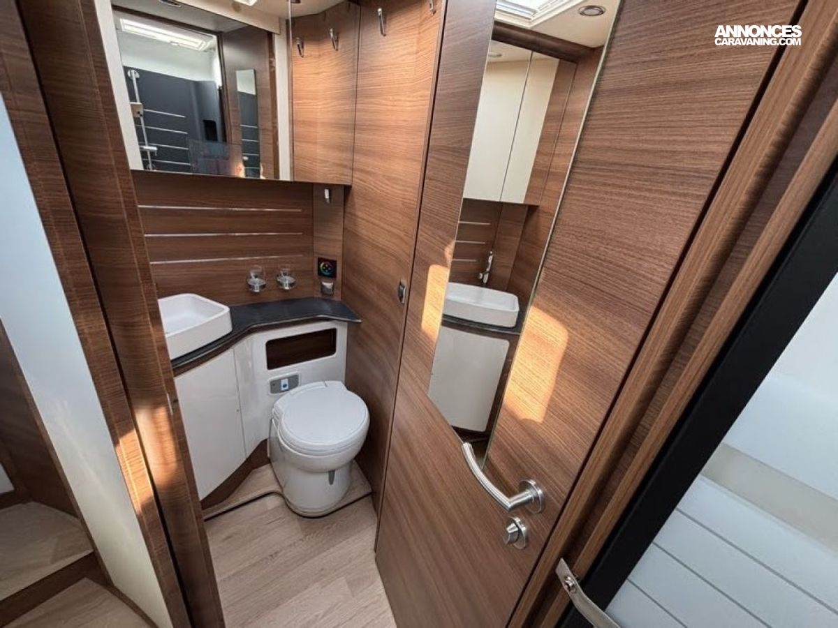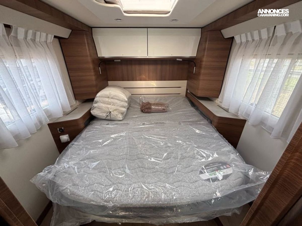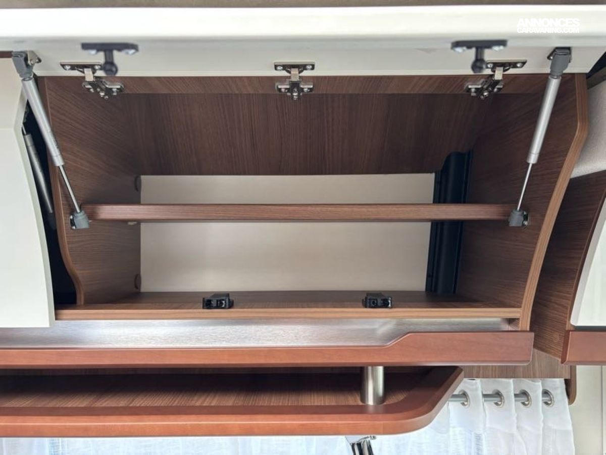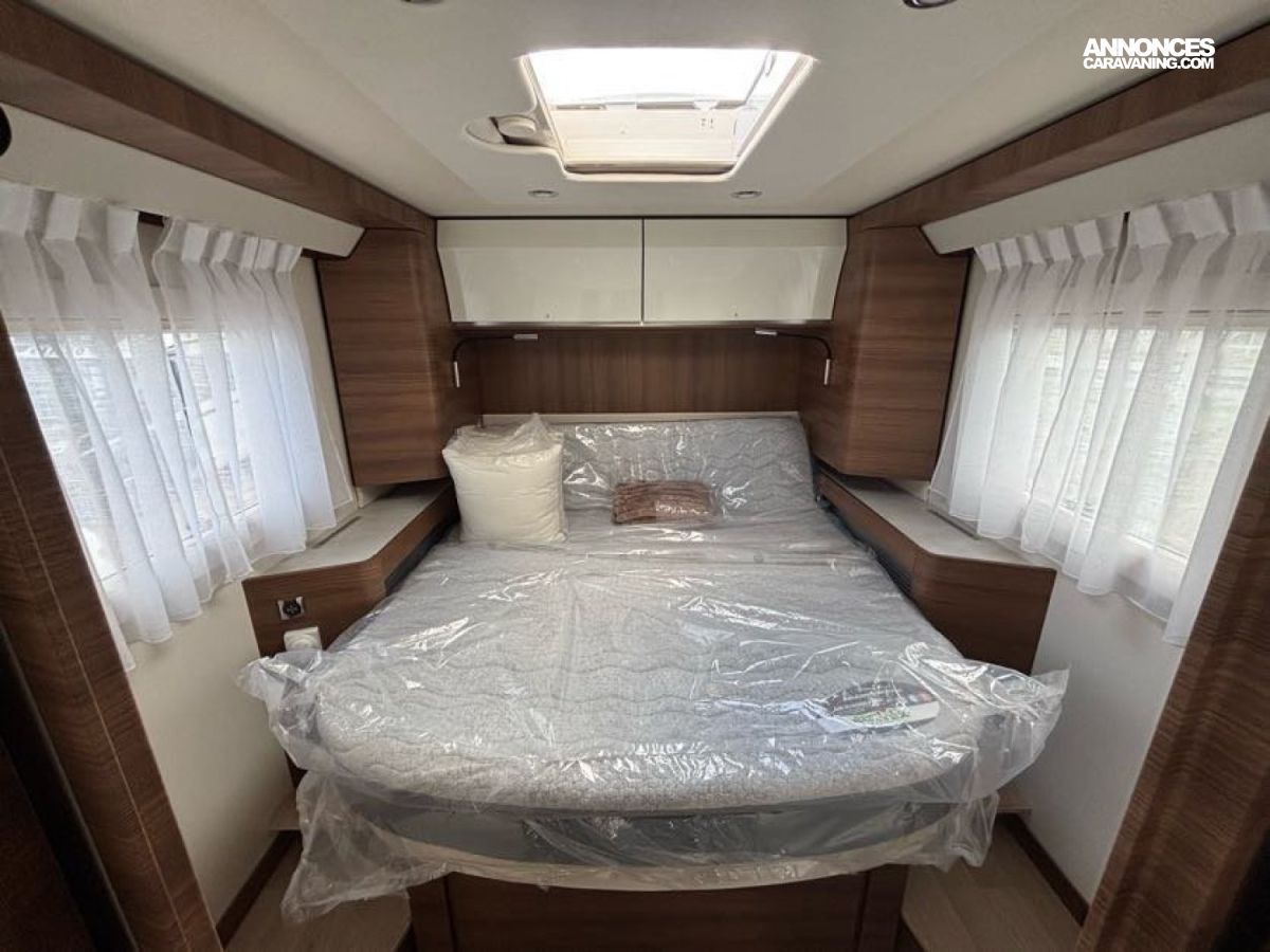 Cuisine en L, Douche indépendante, Grande soute, Lit central, lit pavillon cabine, Maxi salon, Salon avant banquettes face à face, Salon avant sièges pivotants, WC Cassette.