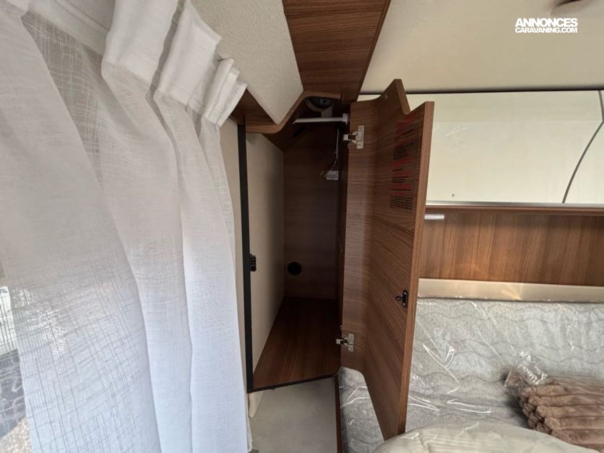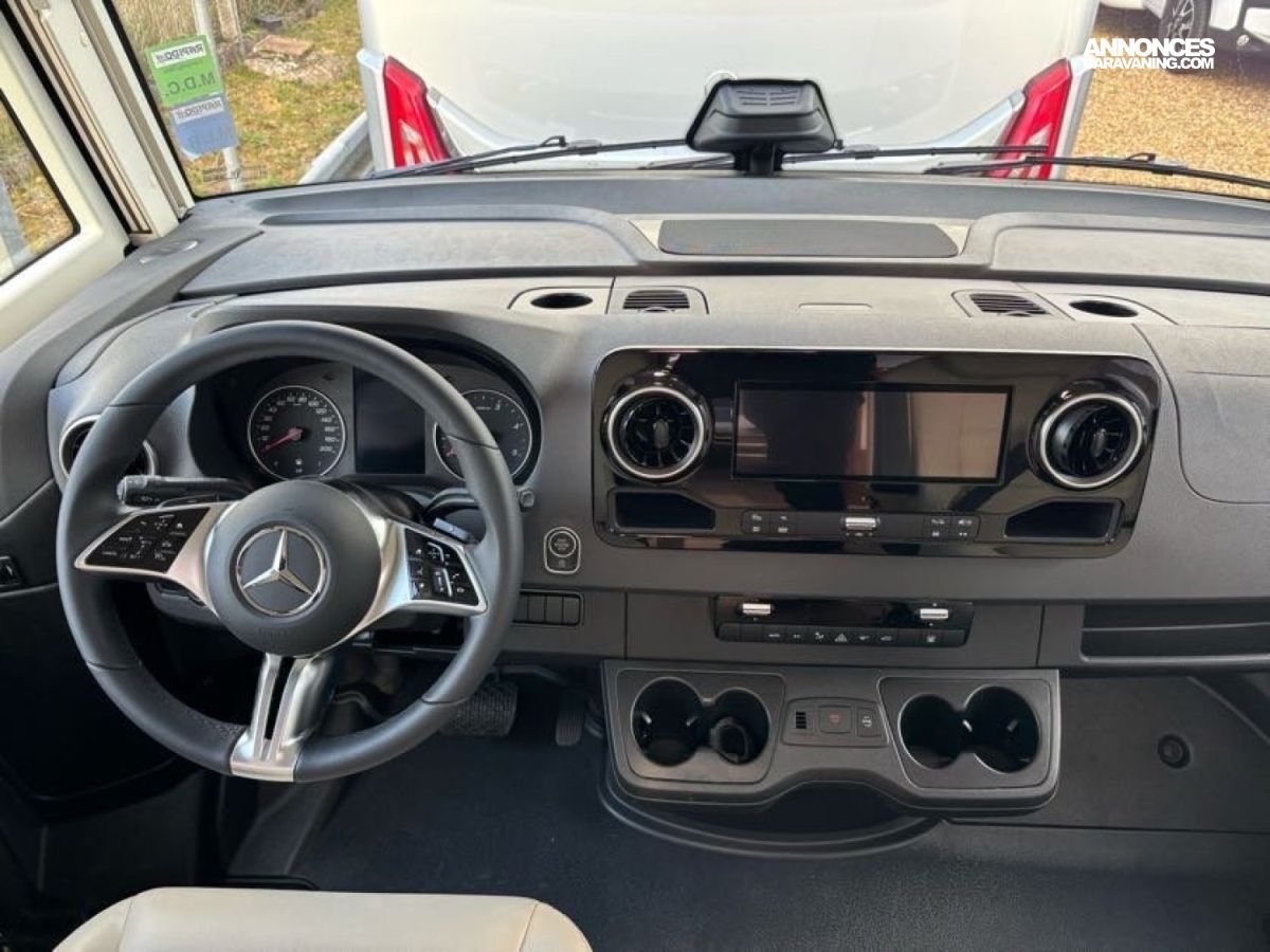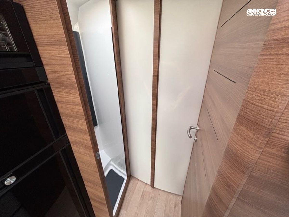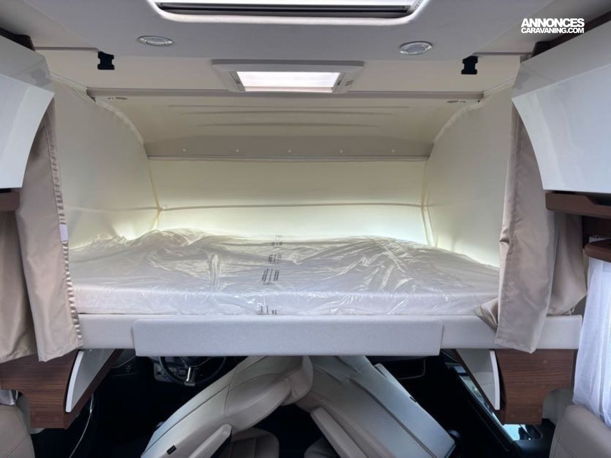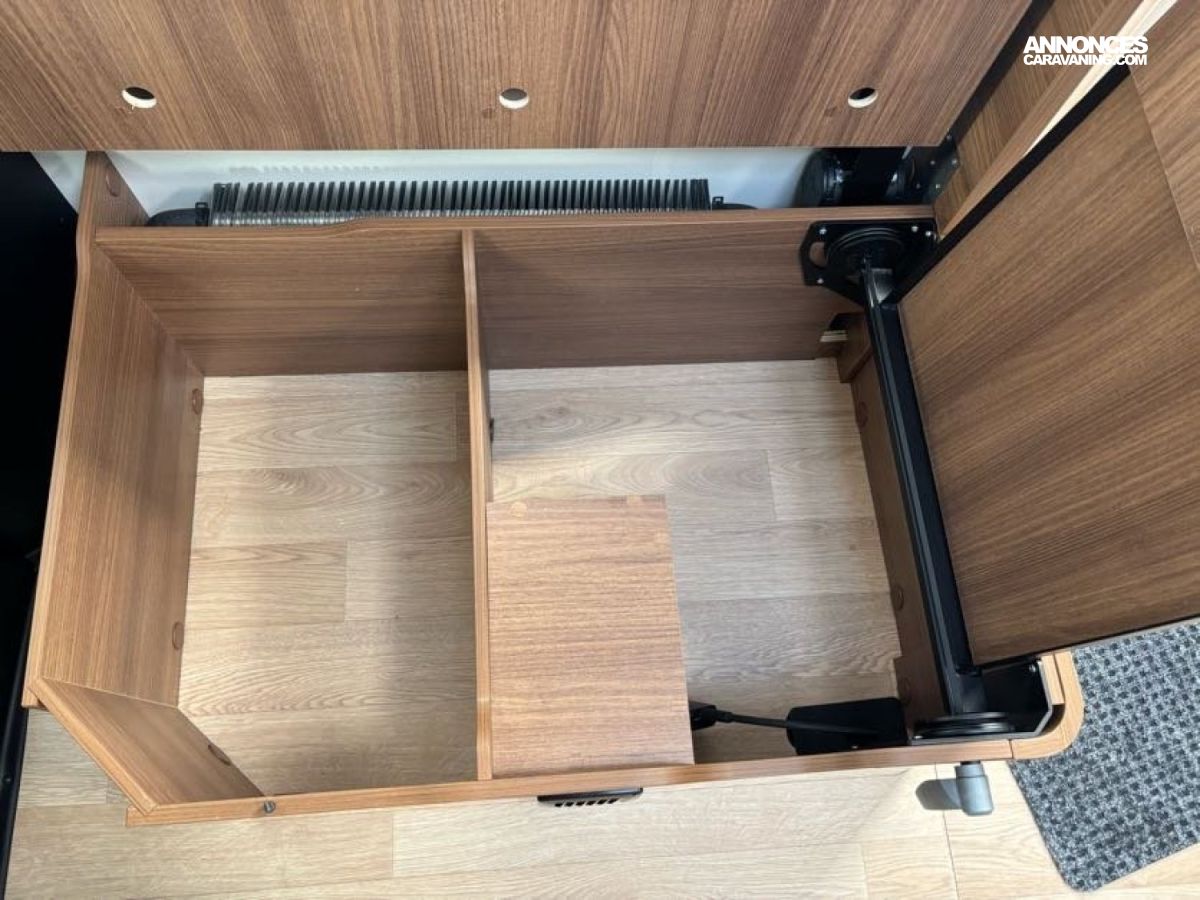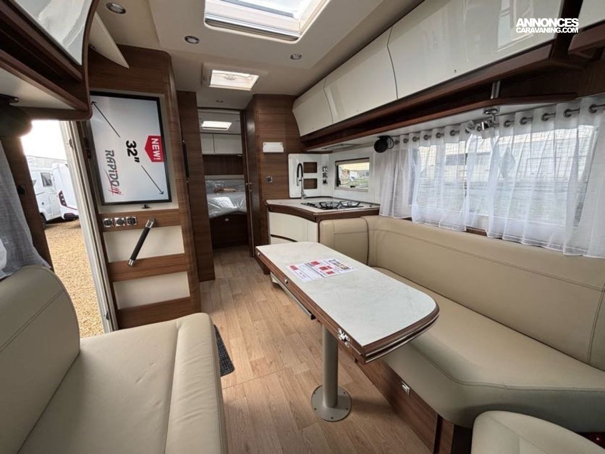 Cuisine en L, Douche indépendante, Grande soute, Lit central, lit pavillon cabine, Maxi salon, Salon avant banquettes face à face, Salon avant sièges pivotants, WC Cassette.