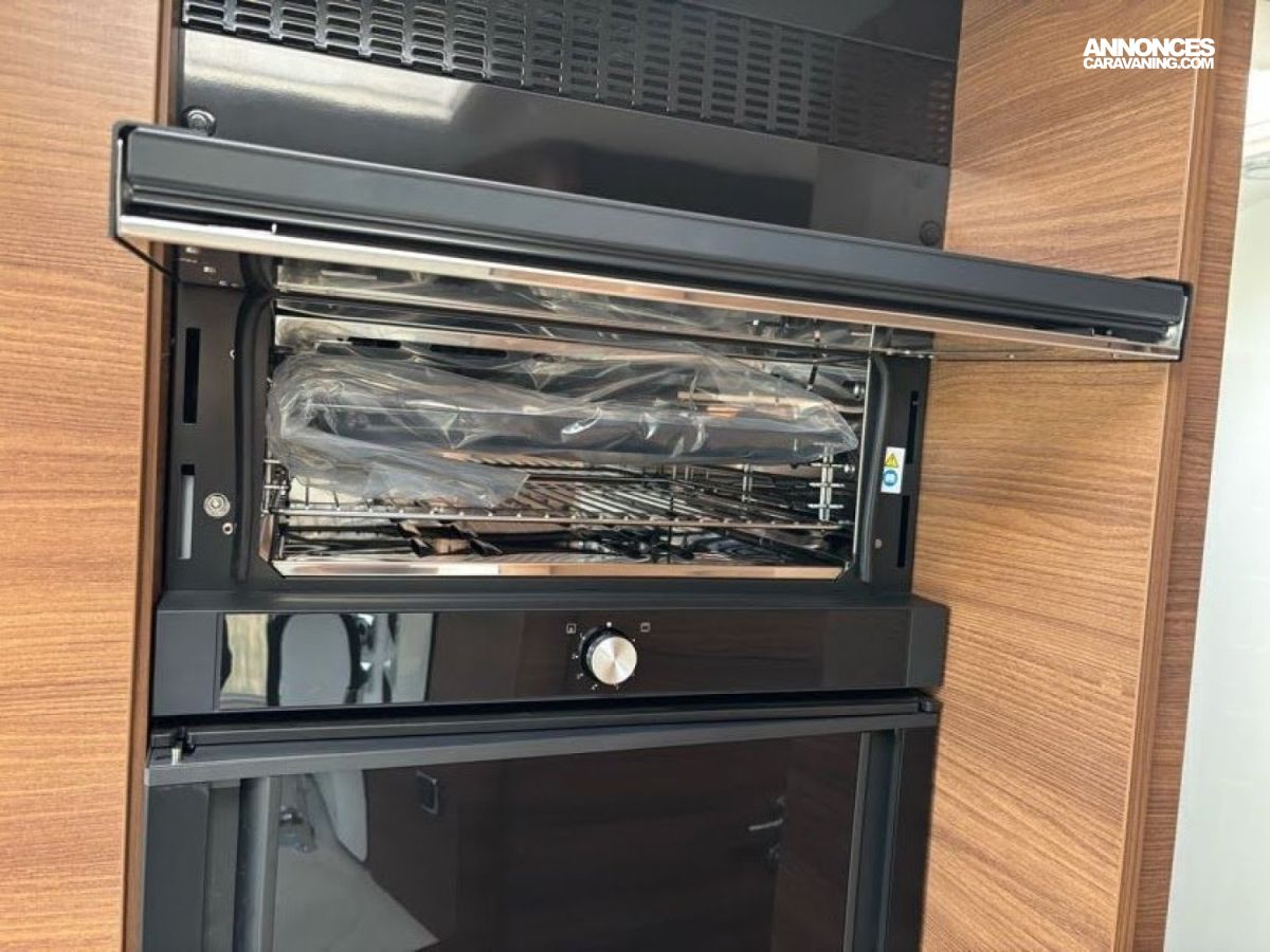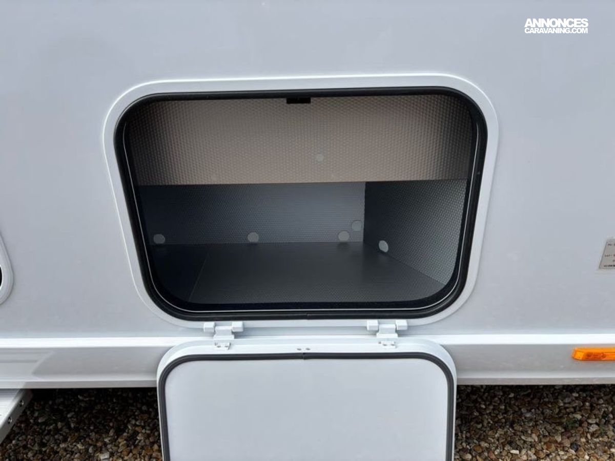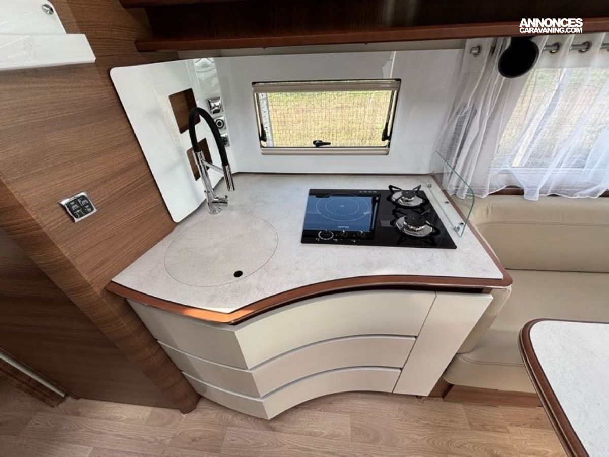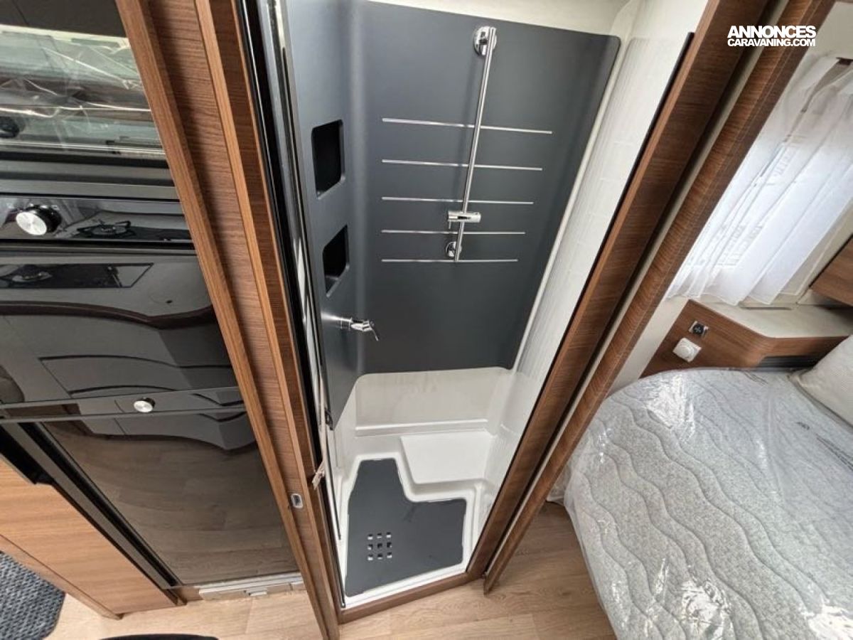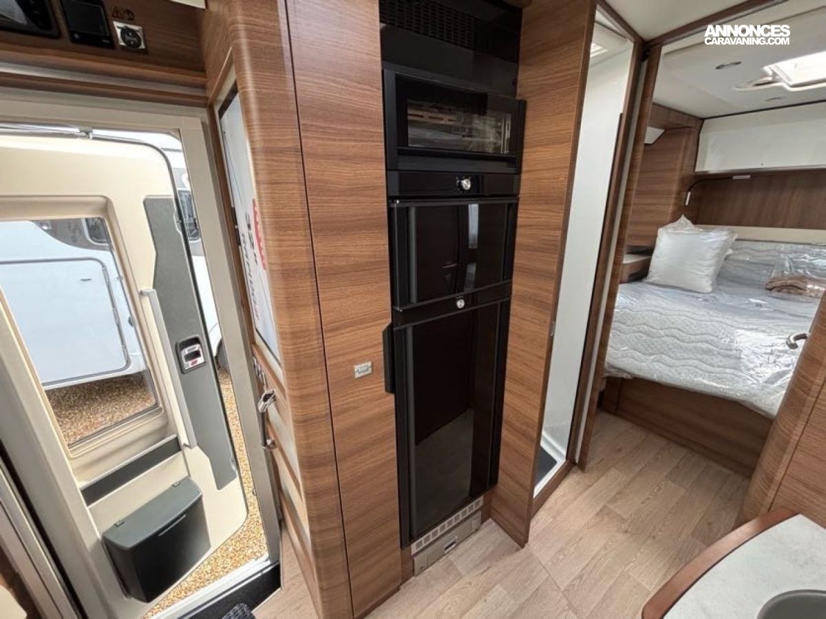 Cuisine en L, Douche indépendante, Grande soute, Lit central, lit pavillon cabine, Maxi salon, Salon avant banquettes face à face, Salon avant sièges pivotants, WC Cassette.