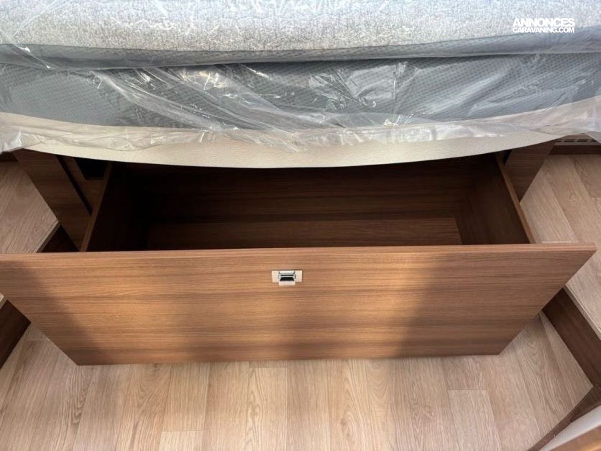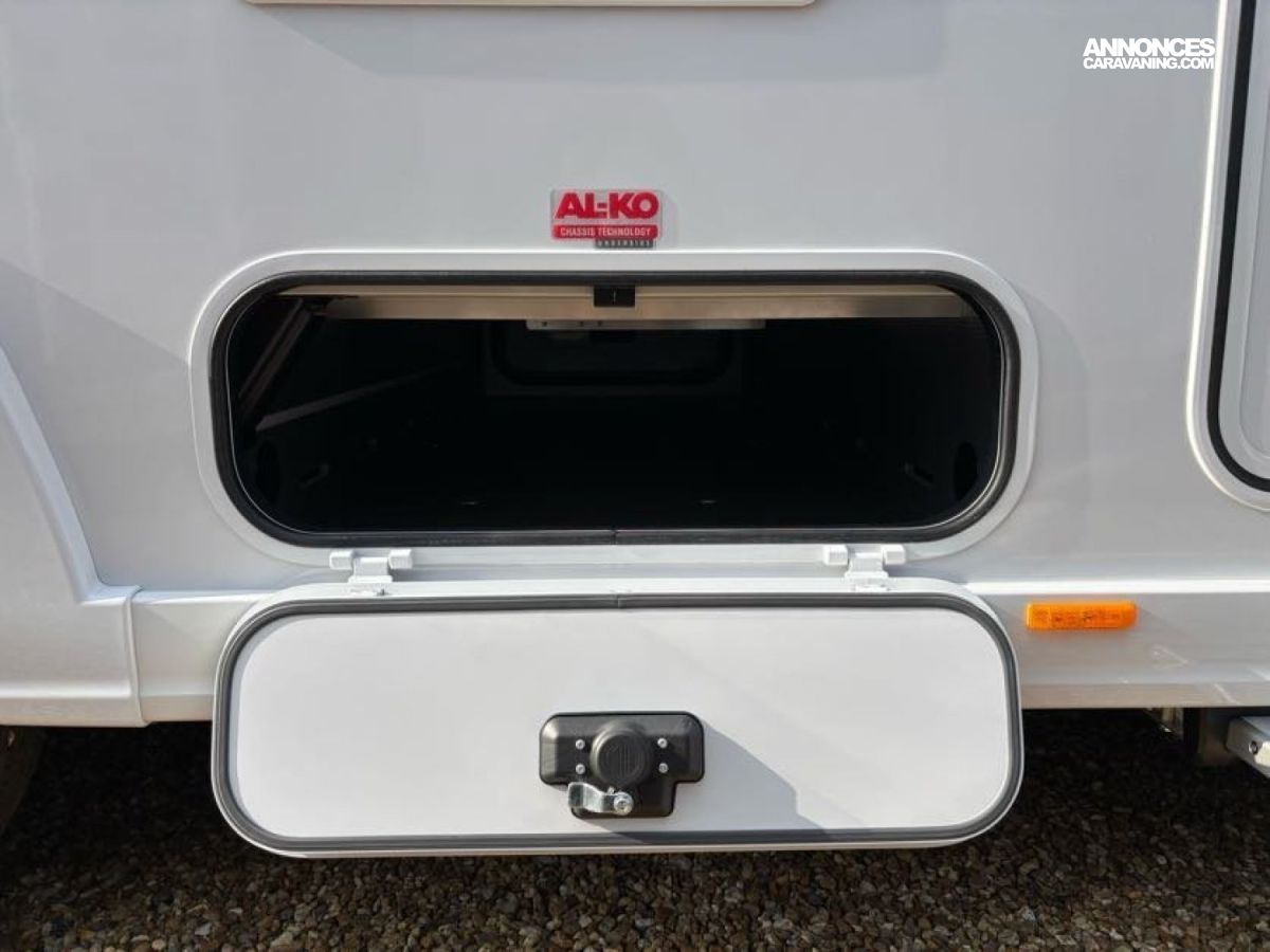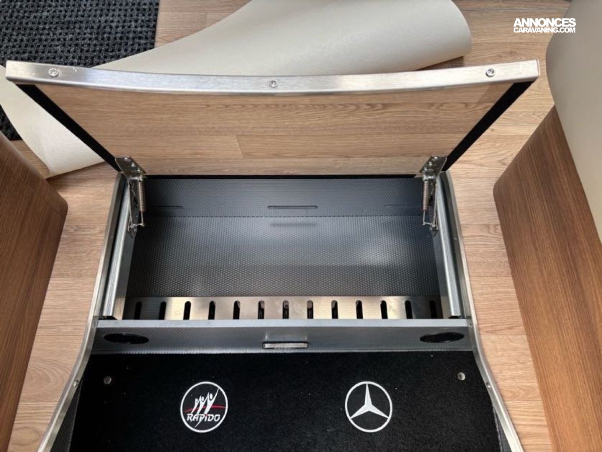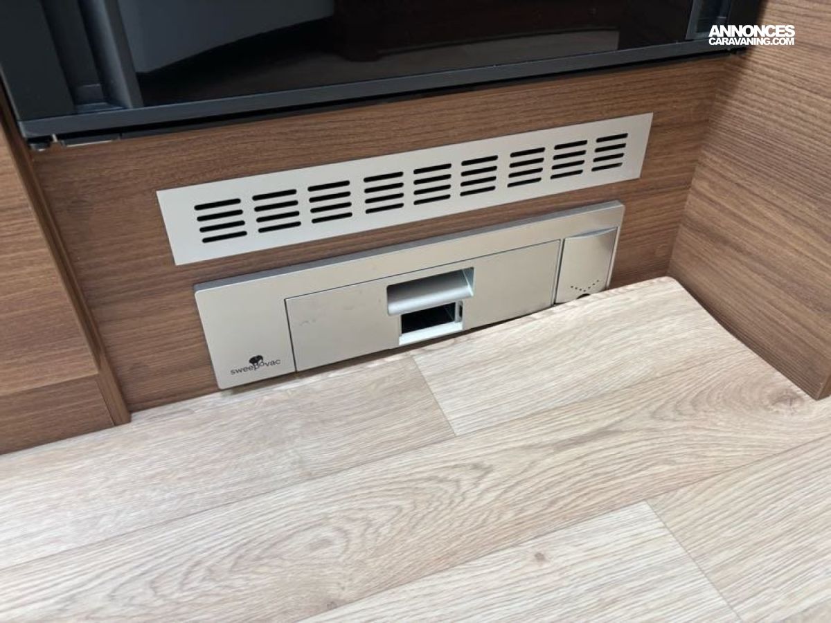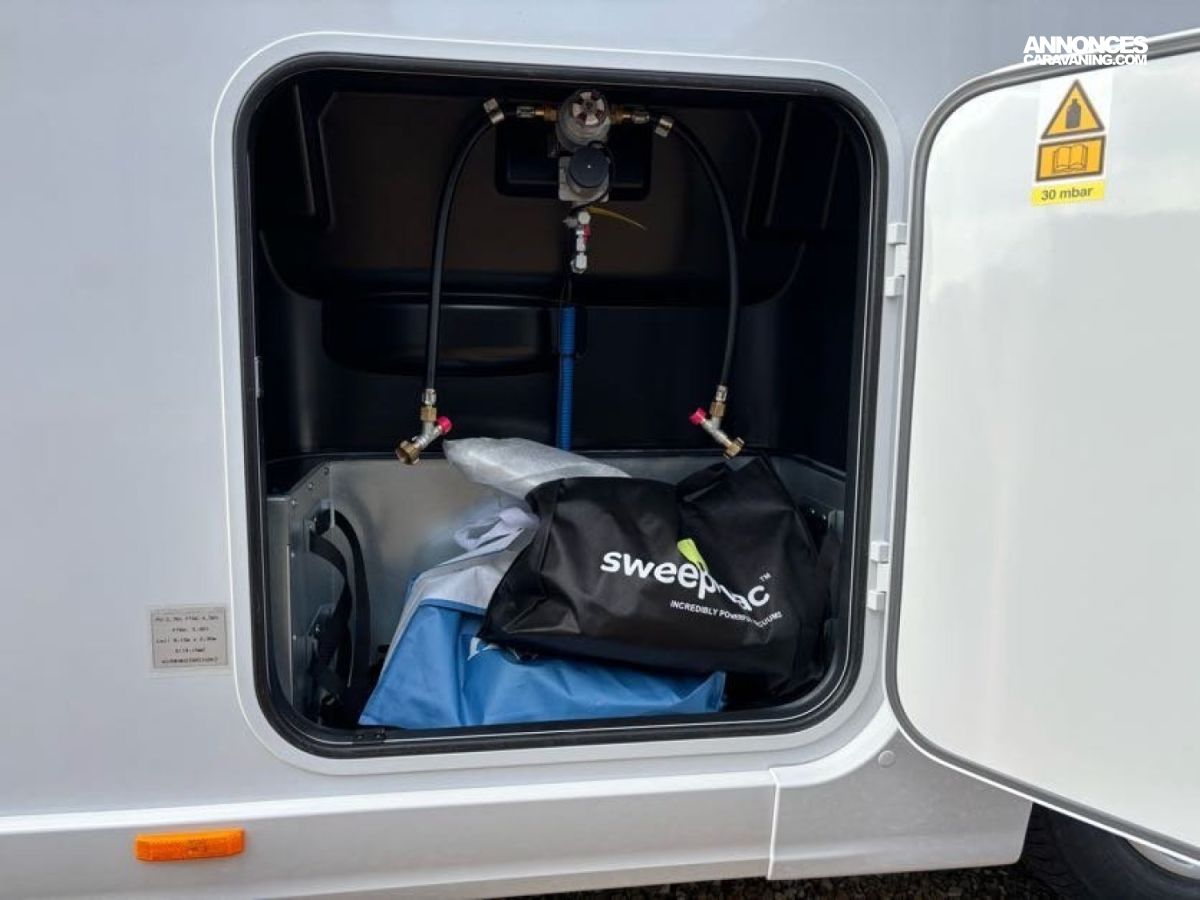 Cuisine en L, Douche indépendante, Grande soute, Lit central, lit pavillon cabine, Maxi salon, Salon avant banquettes face à face, Salon avant sièges pivotants, WC Cassette.