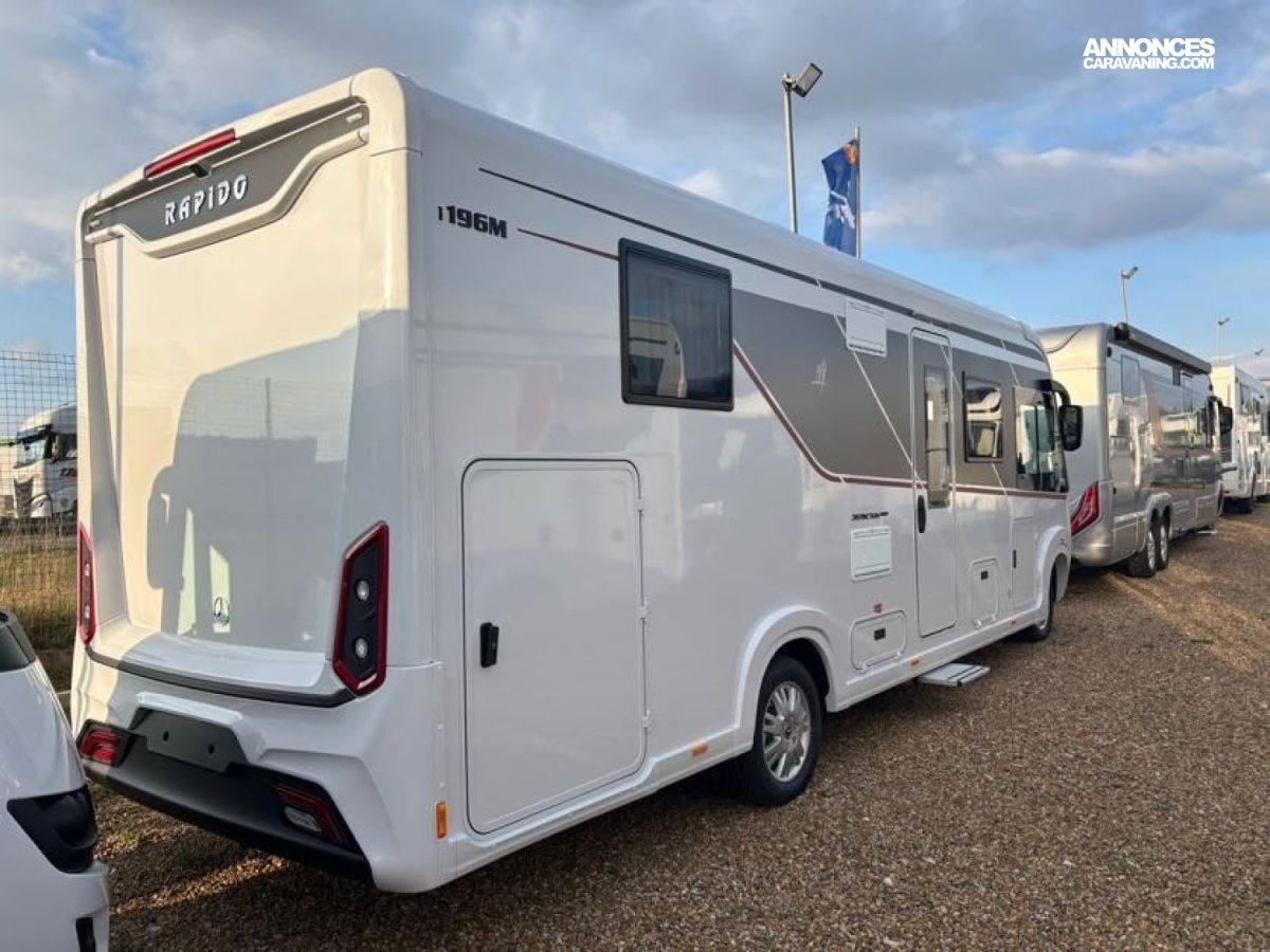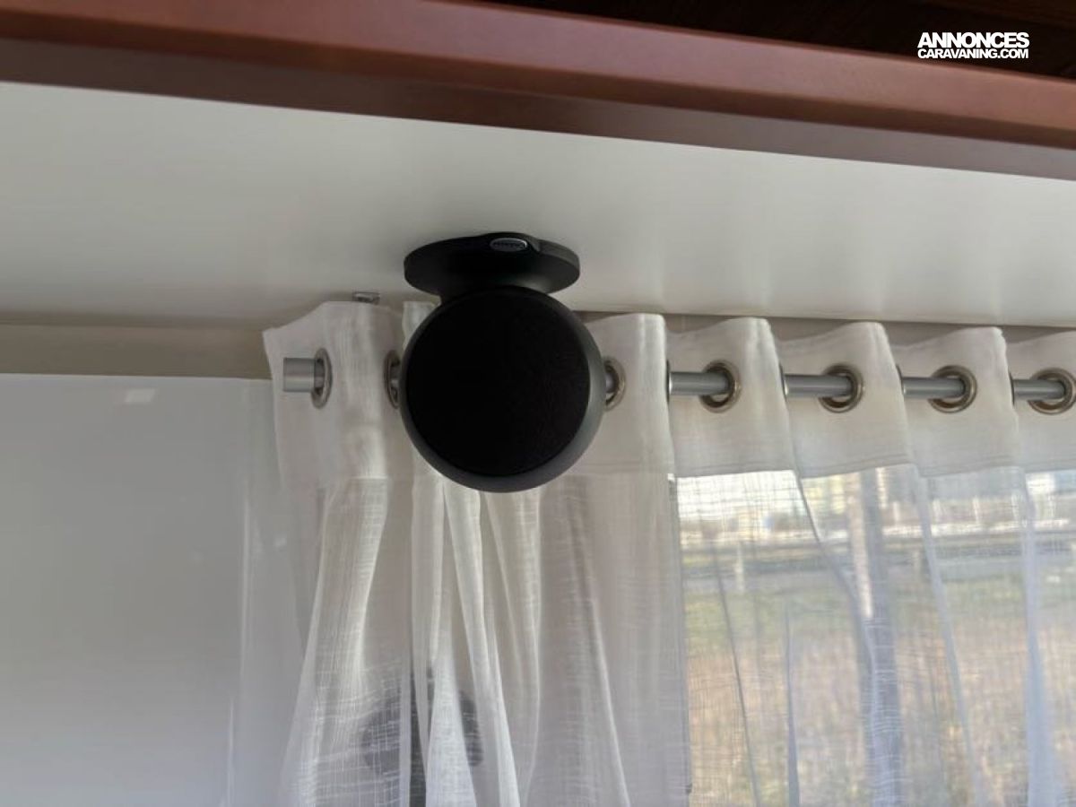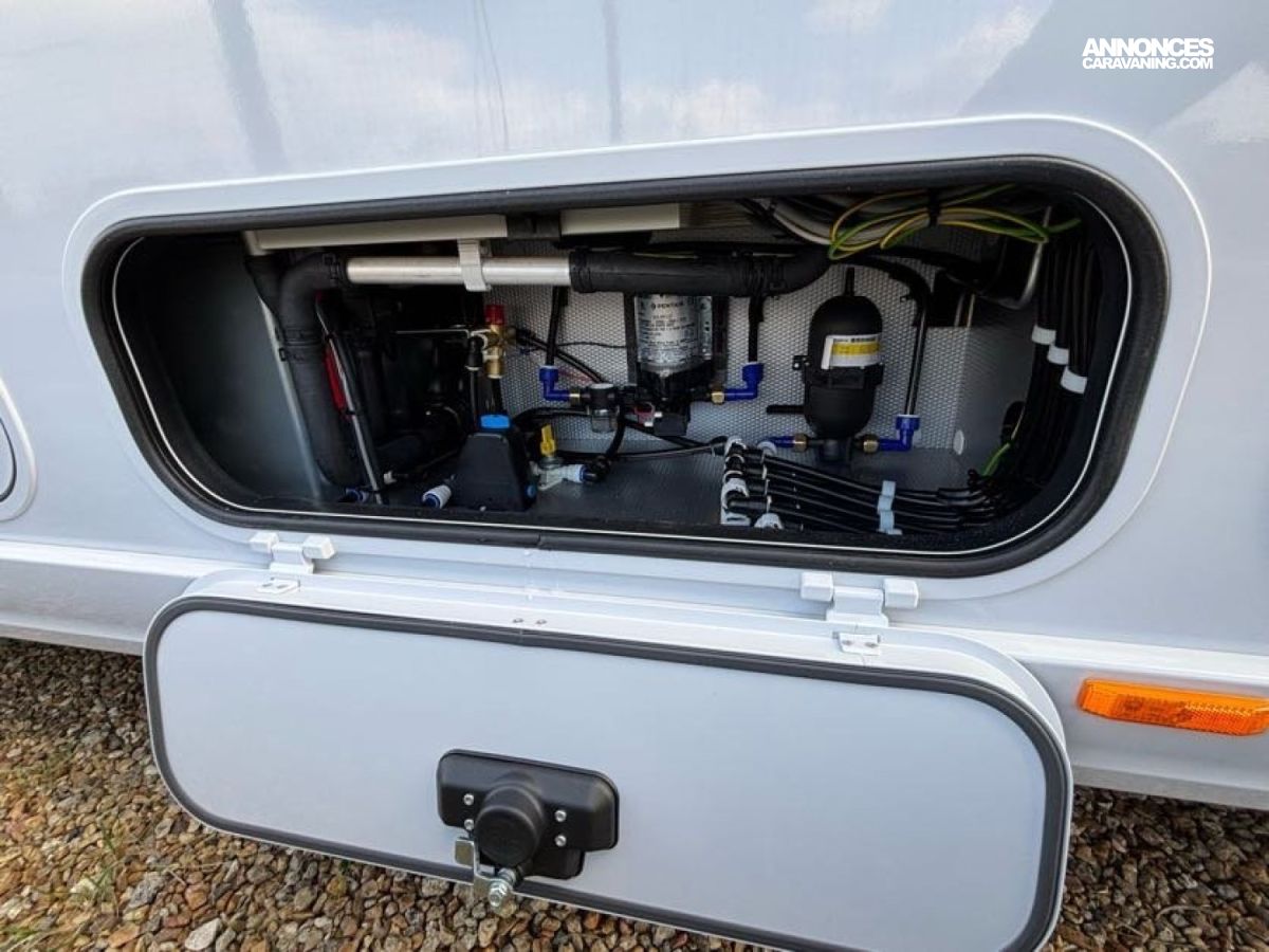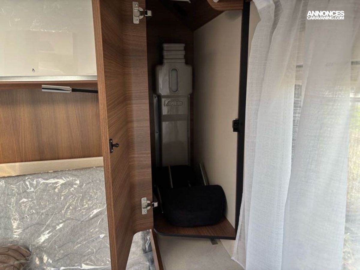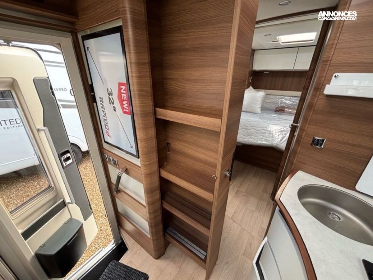 Cuisine en L, Douche indépendante, Grande soute, Lit central, lit pavillon cabine, Maxi salon, Salon avant banquettes face à face, Salon avant sièges pivotants, WC Cassette.