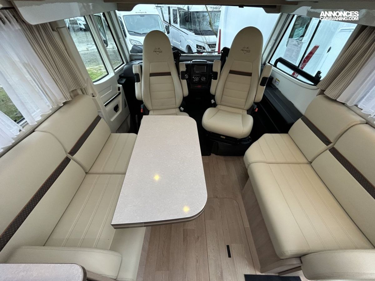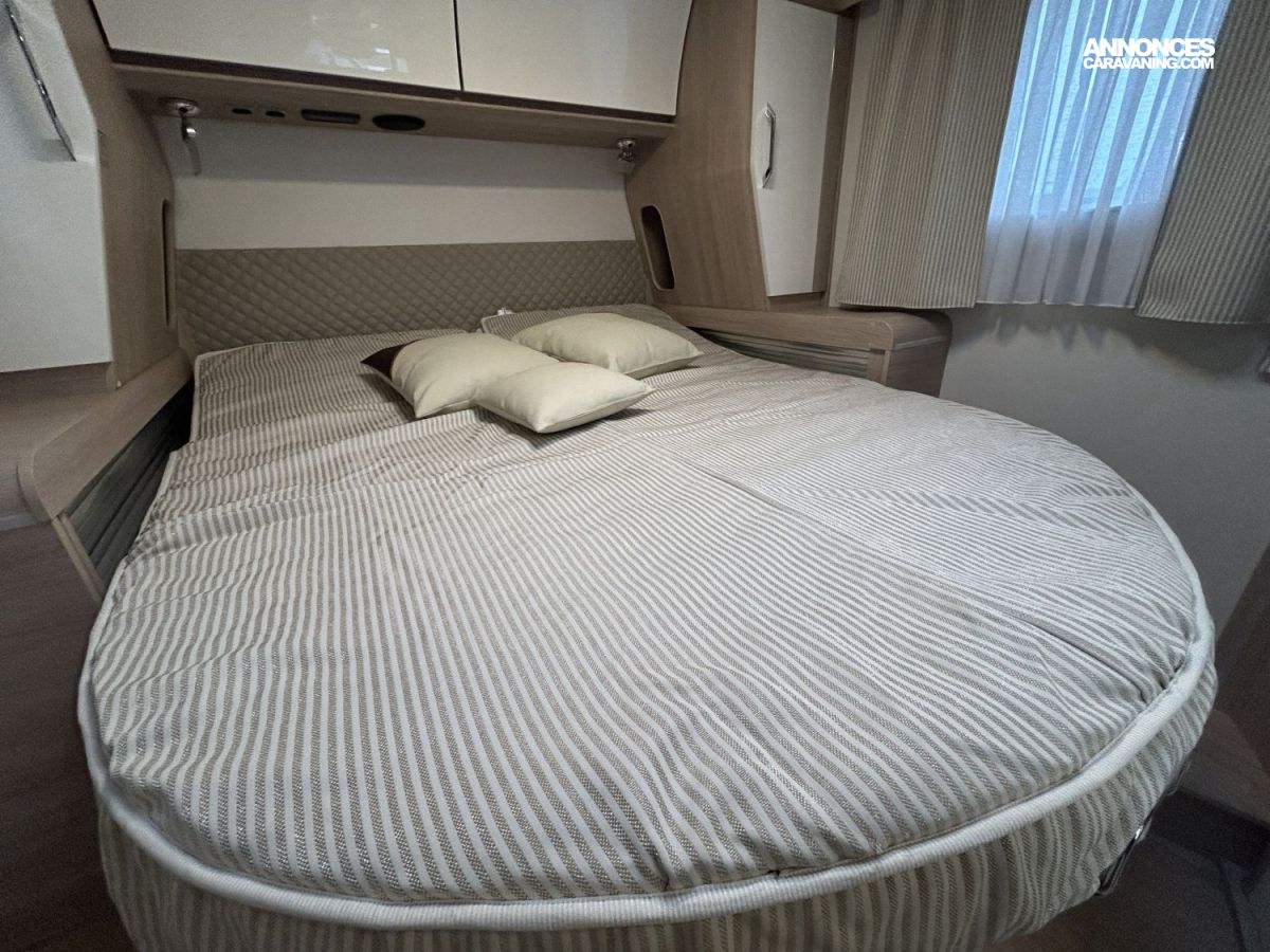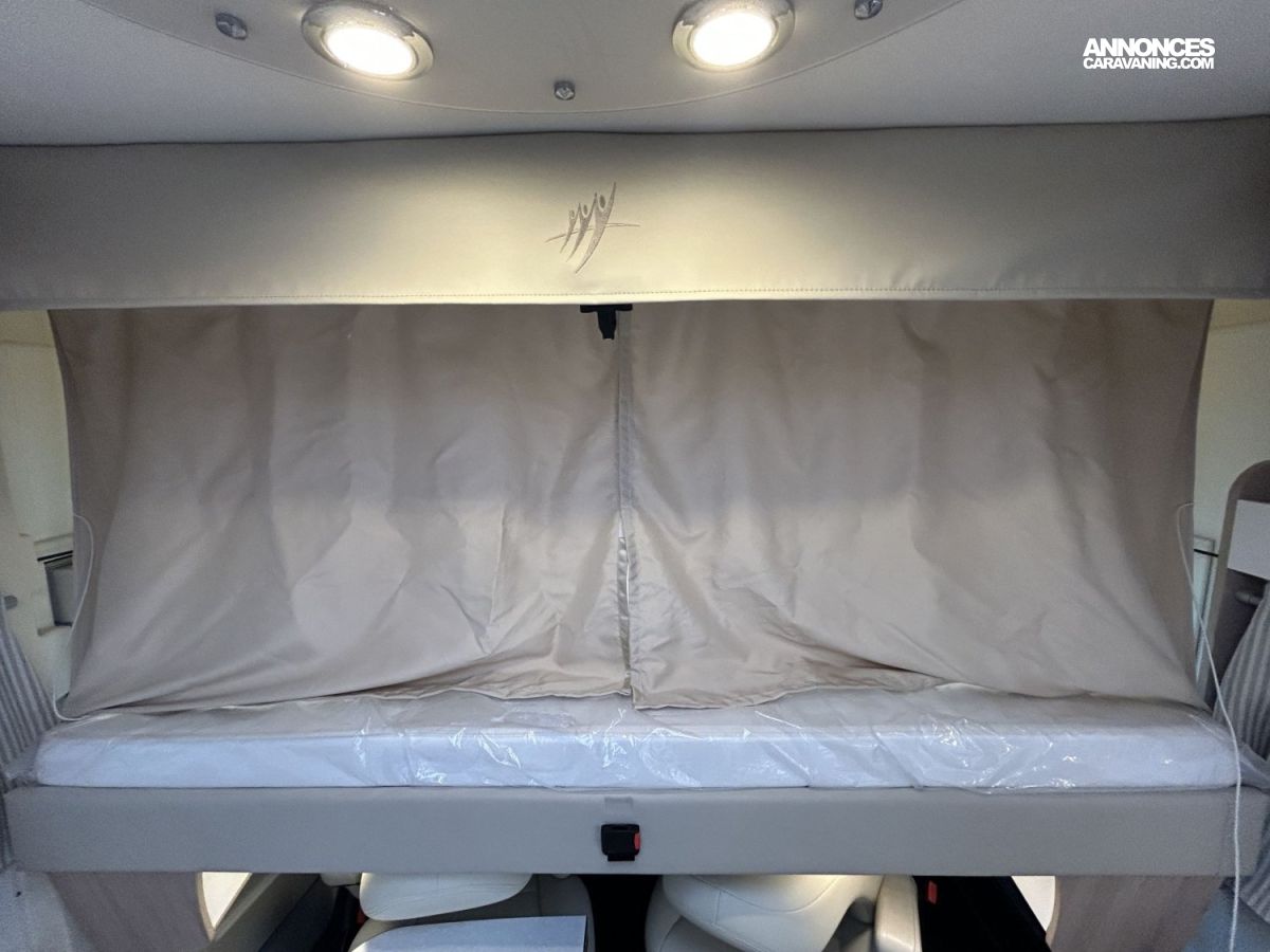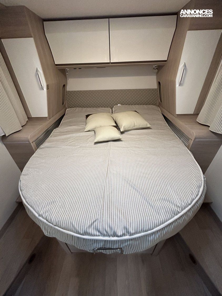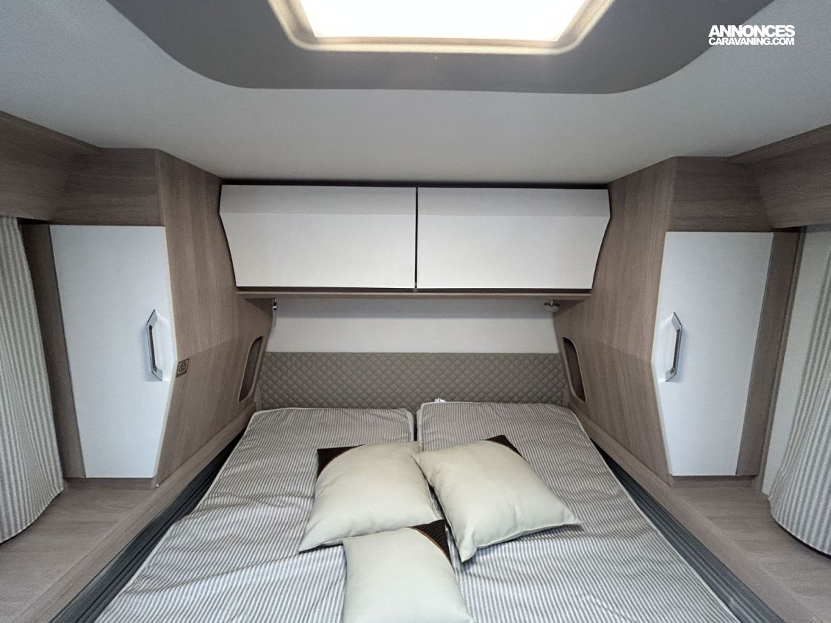 Avec ses 7,54 m, cet intégral propose un aménagement très apprécié : lit central réglable en hauteur avec surmatelas à mémoire de forme, lit pavillon électrique, jusqu’à 4 couchages et 3 places carte grise, dans un espace de vie spacieux, lumineux et parfaitement équilibré.