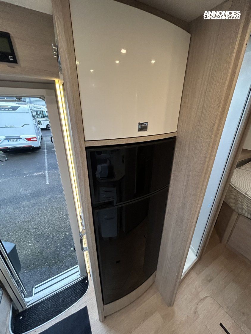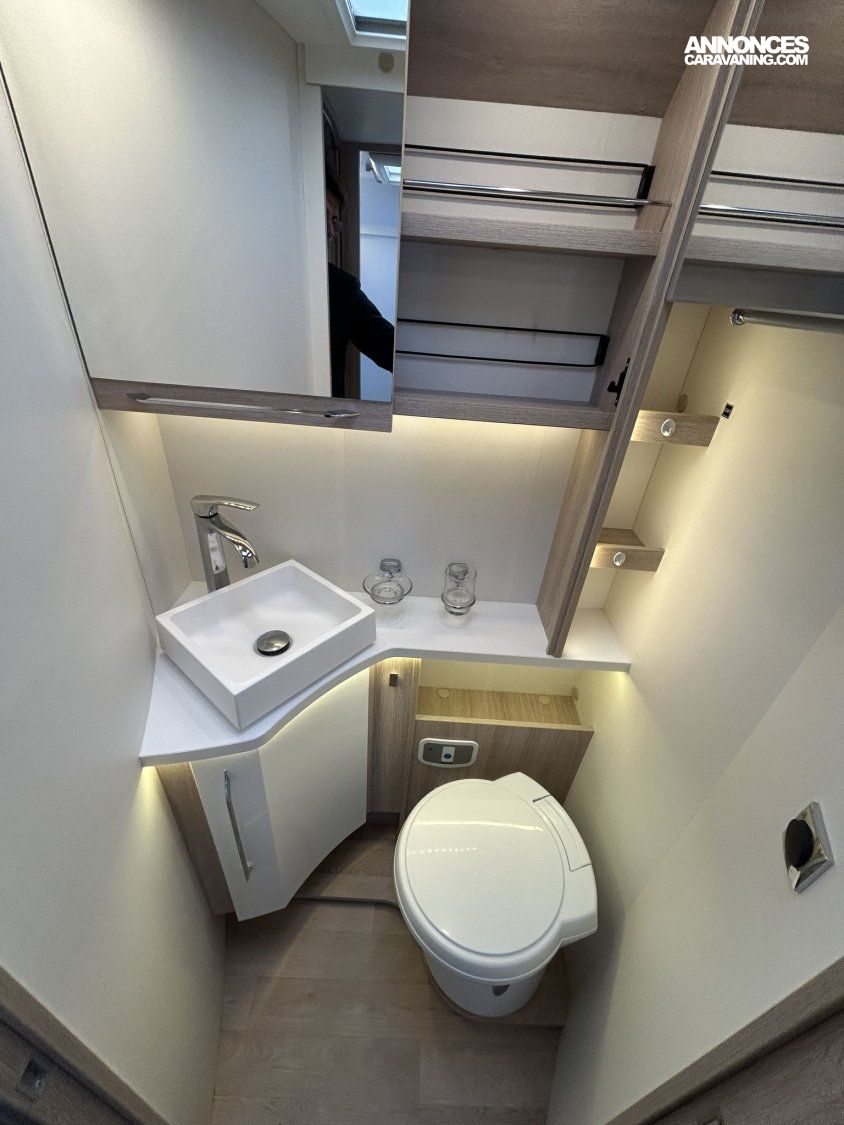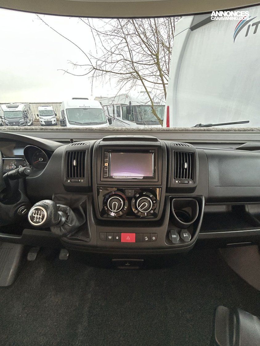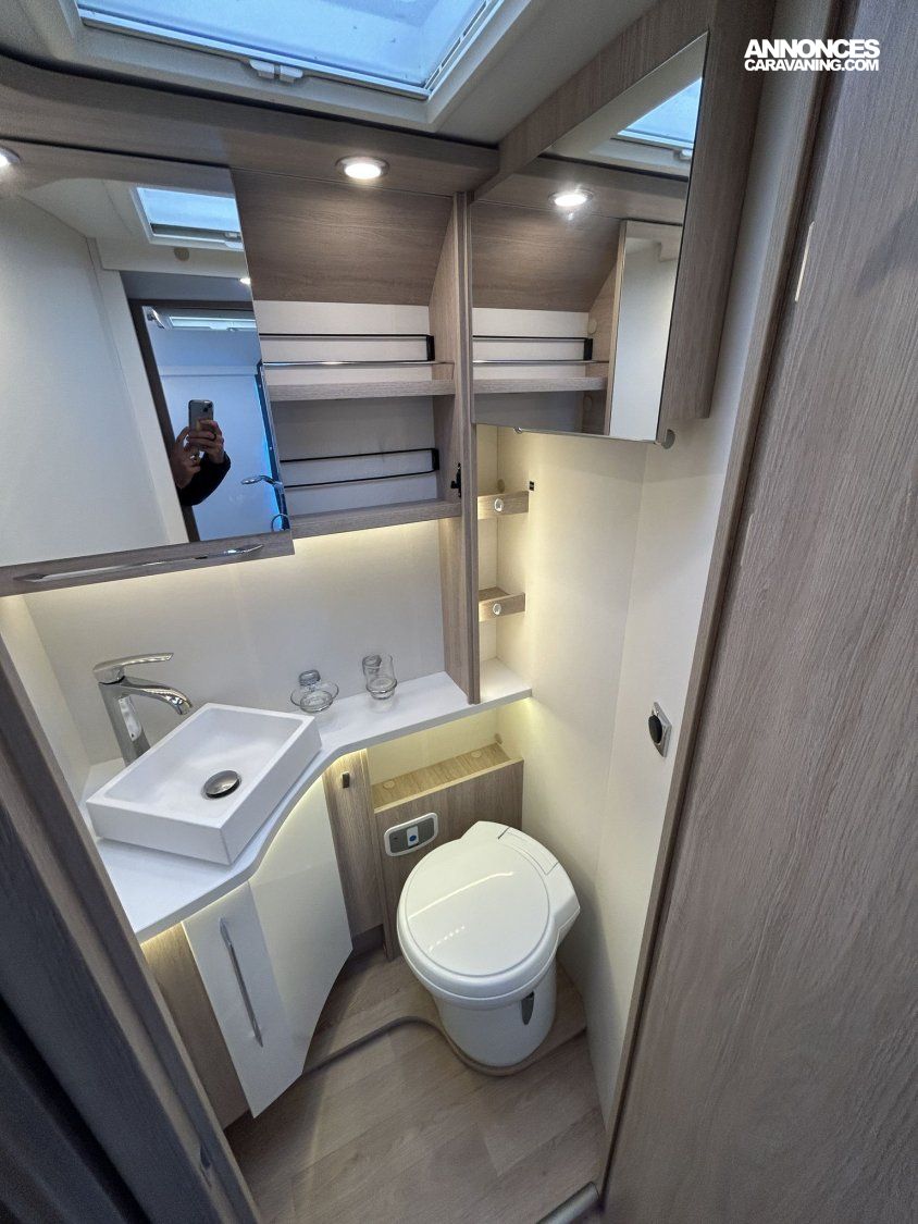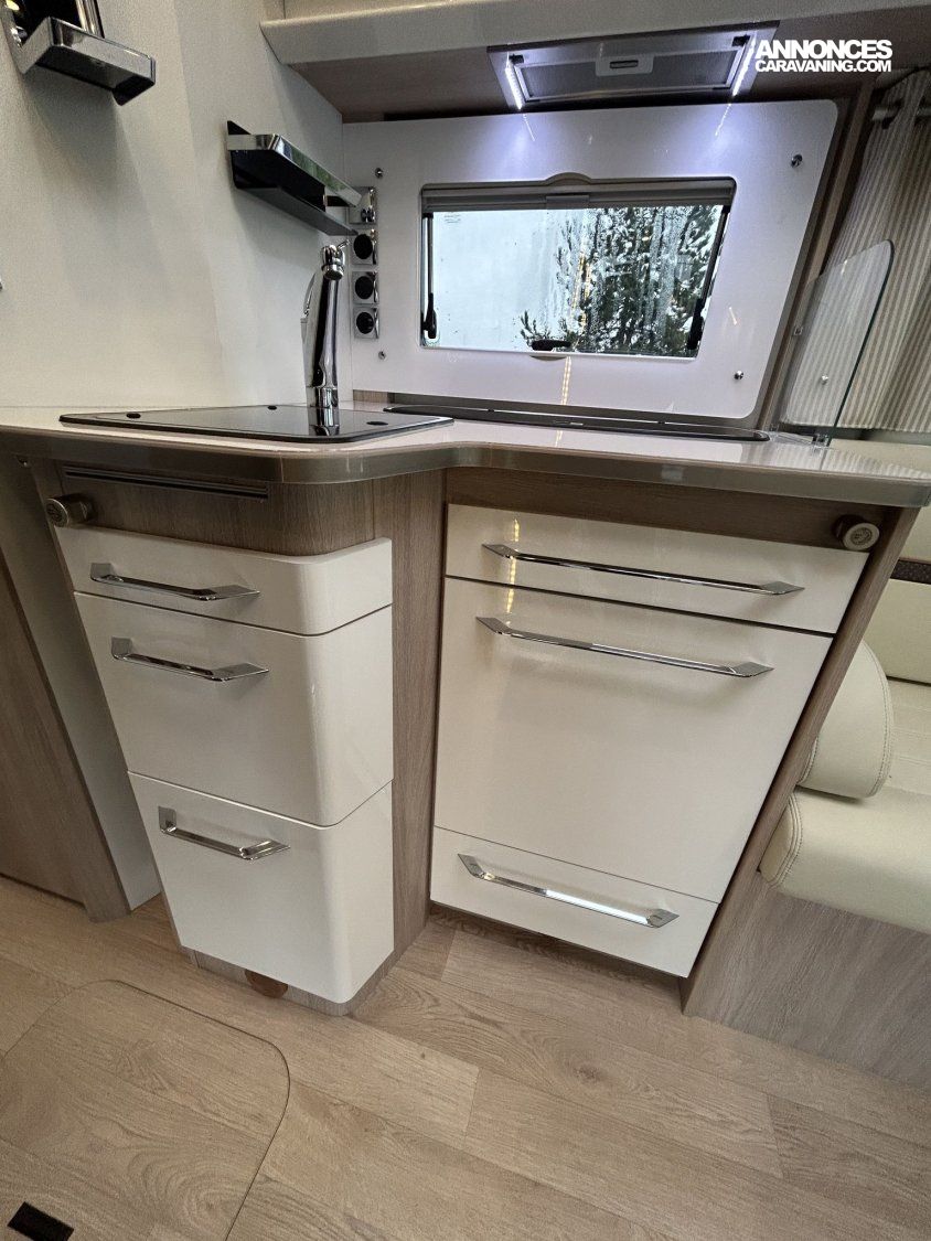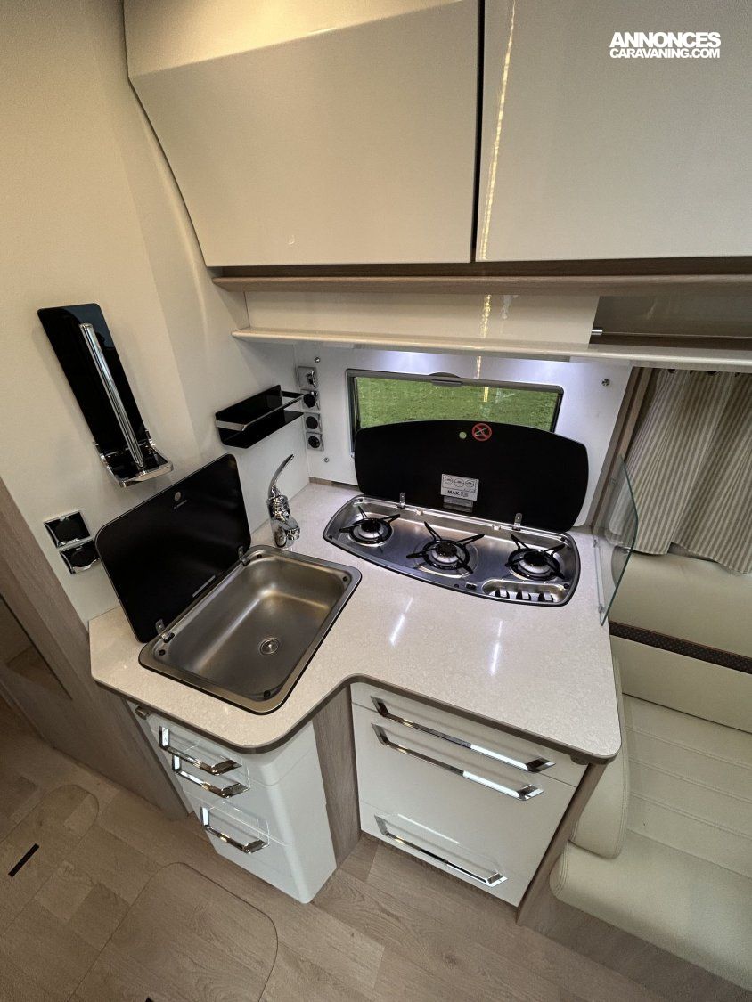Avec ses 7,54 m, cet intégral propose un aménagement très apprécié : lit central réglable en hauteur avec surmatelas à mémoire de forme, lit pavillon électrique, jusqu’à 4 couchages et 3 places carte grise, dans un espace de vie spacieux, lumineux et parfaitement équilibré.