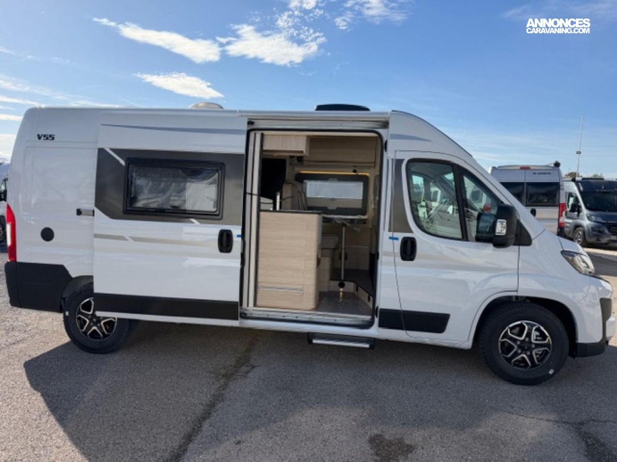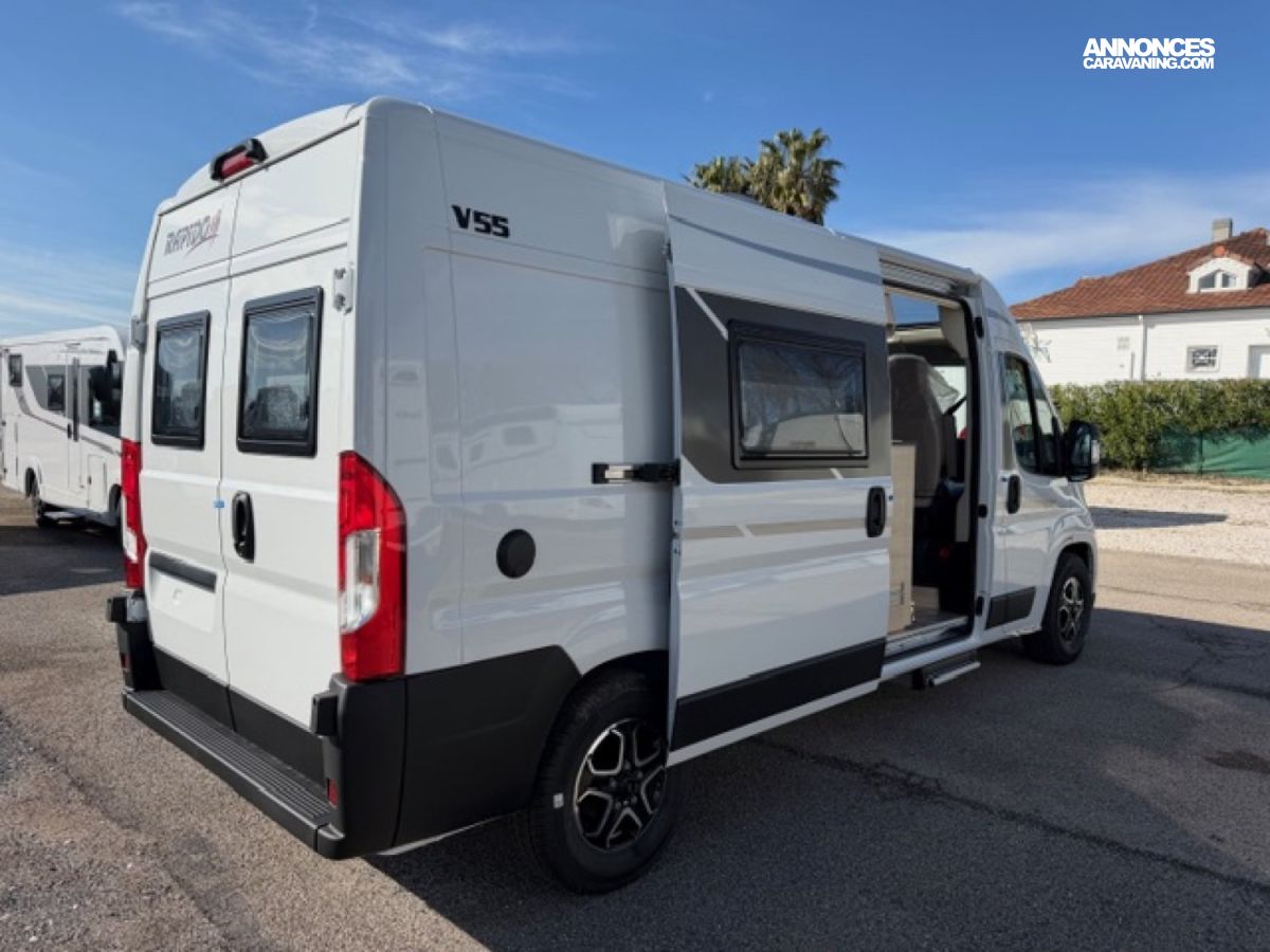 Conçu idéalement pour un usage à deux, le Rapido V55 compte 4 places route et 3 couchages ; le lit de dînette étant fourni sans supplément.