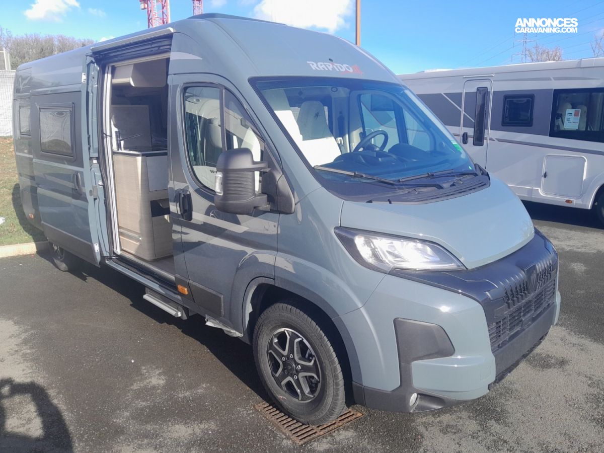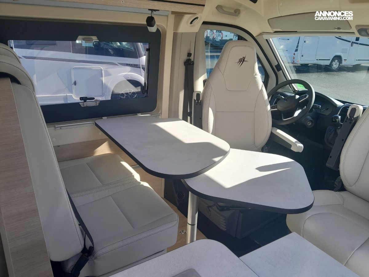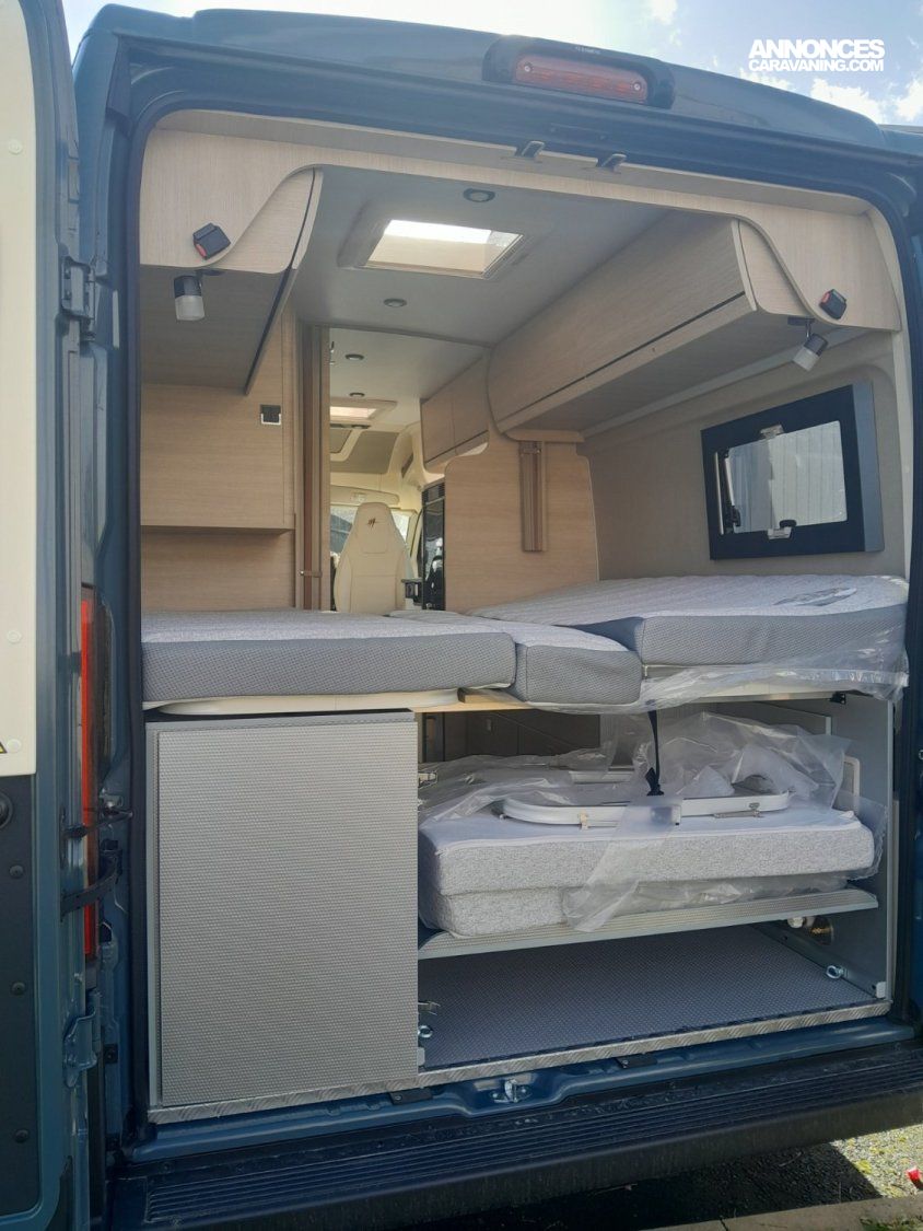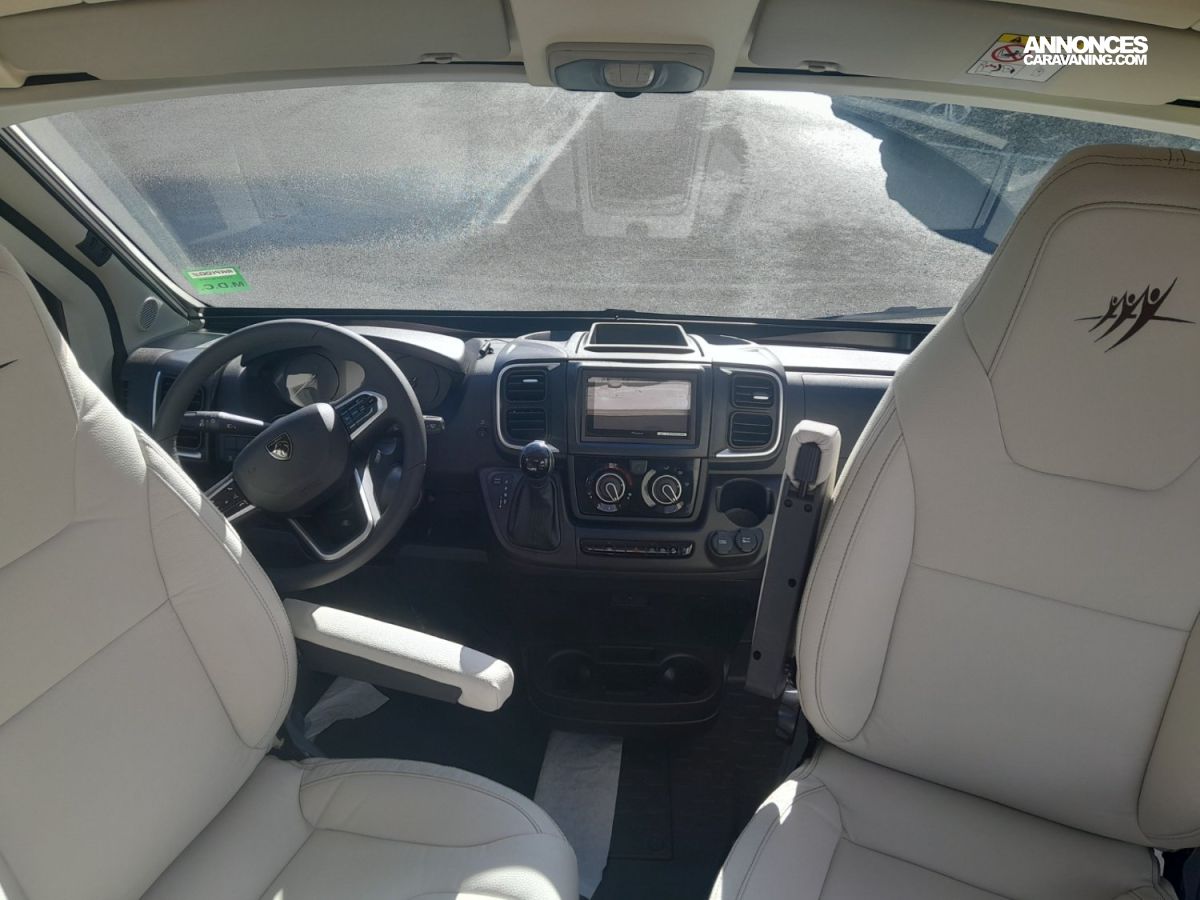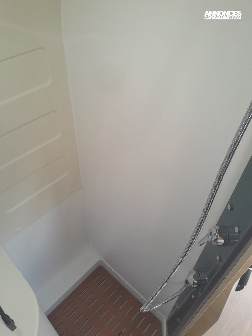 Boîte automatique, frigo à compression 146L, occultants et moustiquaires, support TV, double DIN Pioneer, commandes au volant et volant cuir, salle d'eau Duo'Space, LED extérieure, douchette extérieure, caméra de recul, peinture Lanzarote Grey, jantes alu 16", Traction+, pneus 4 saisons, chauffage gaz, freins de tiroirs, caillebotis salle d'eau, tissu Milan.