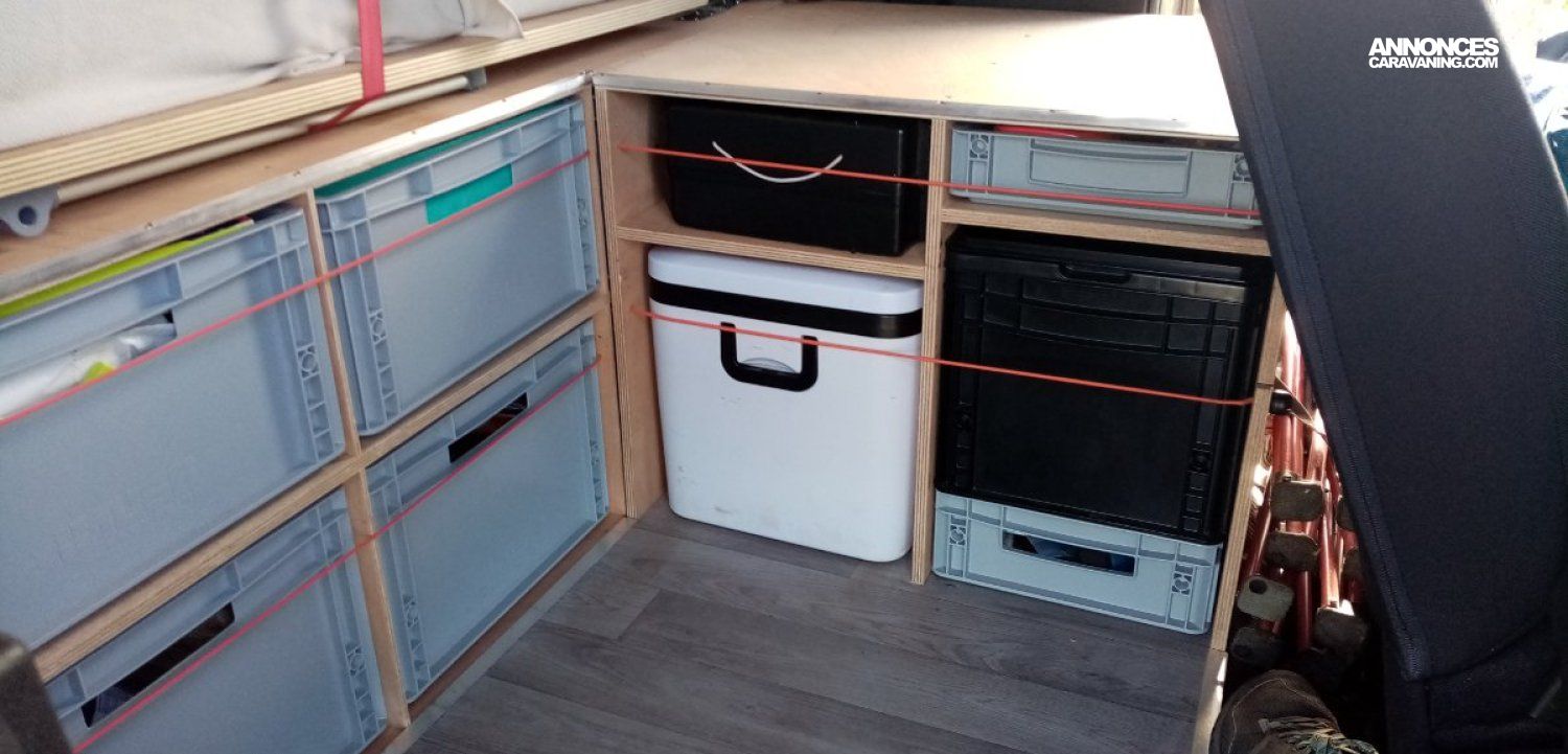 – un rangement pratique composé de 2 meubles amovibles et de 18 bacs plastiques accessibles de l’extérieur et/ou de l’intérieur ainsi que de plusieurs espaces de rangements prévus notamment pour une glacière à compression, des toilettes sèches, une valise de camping gaz et du matériel de camping.