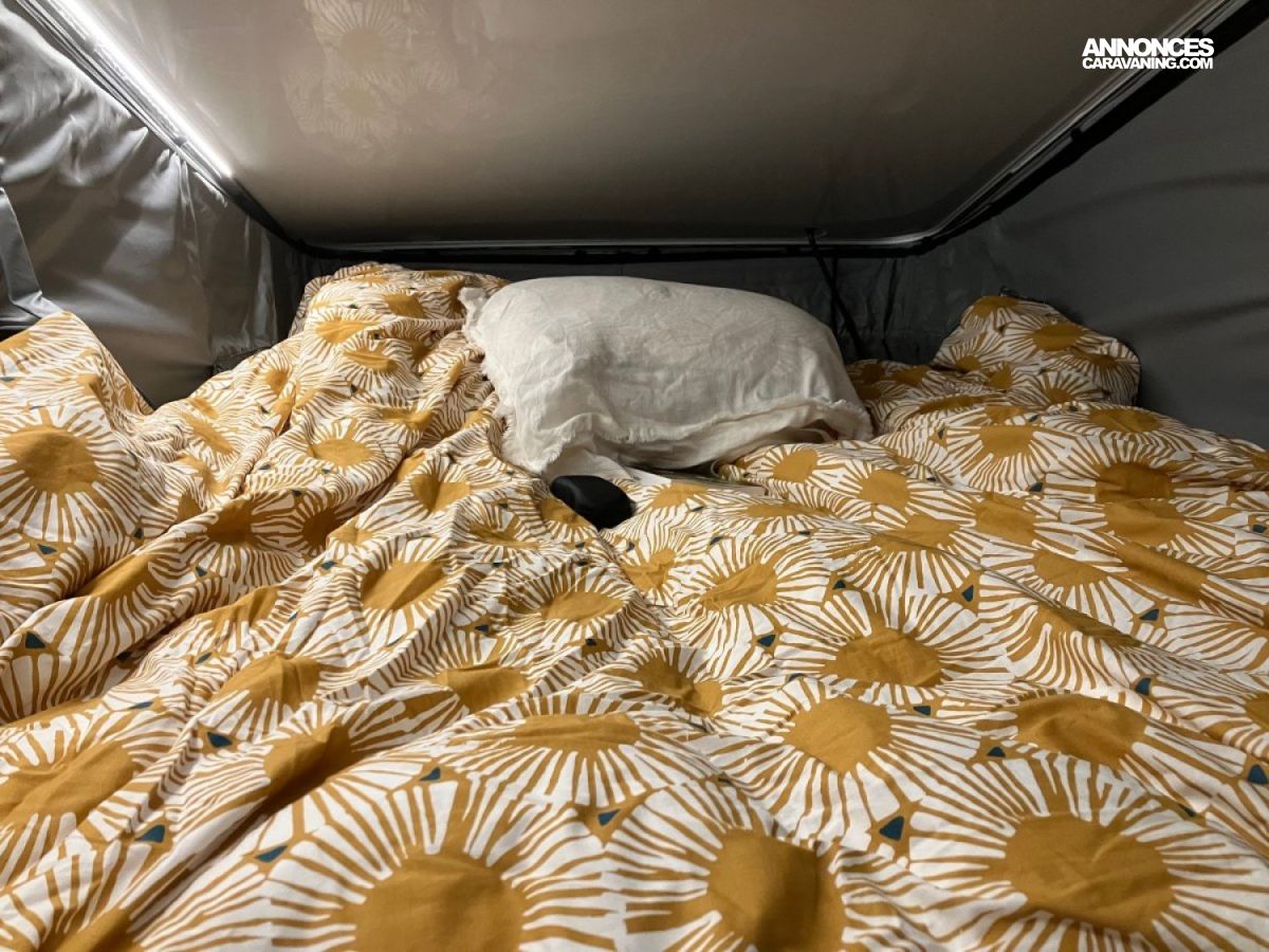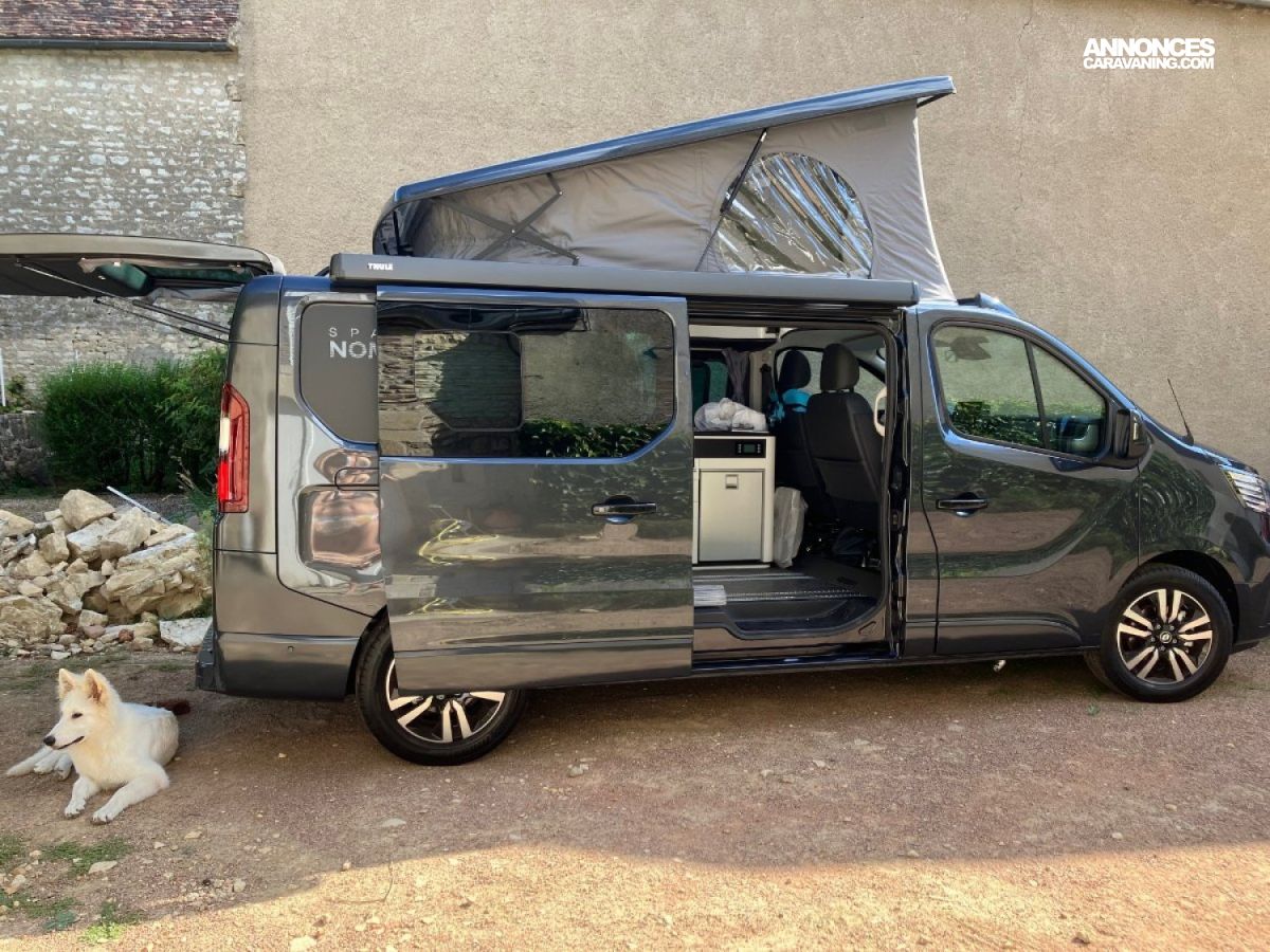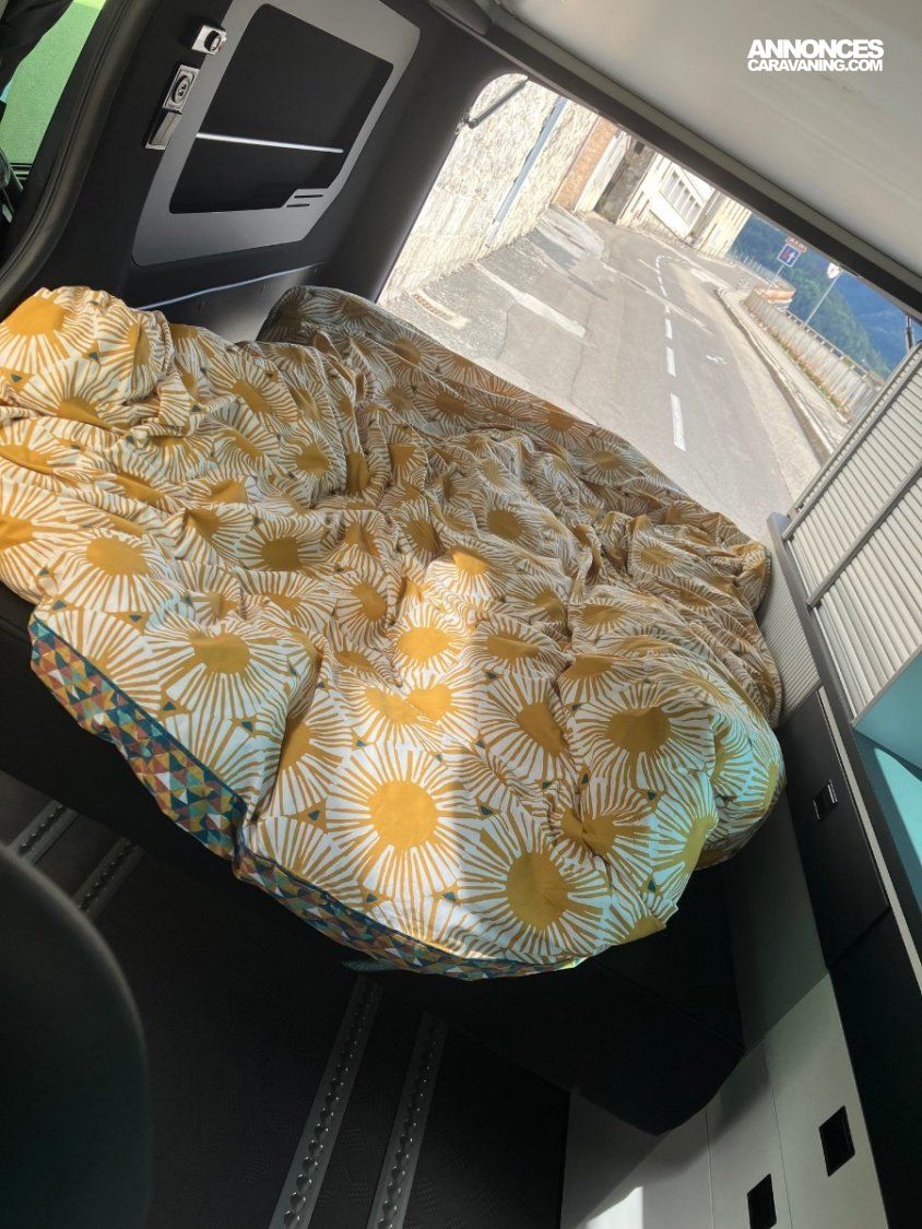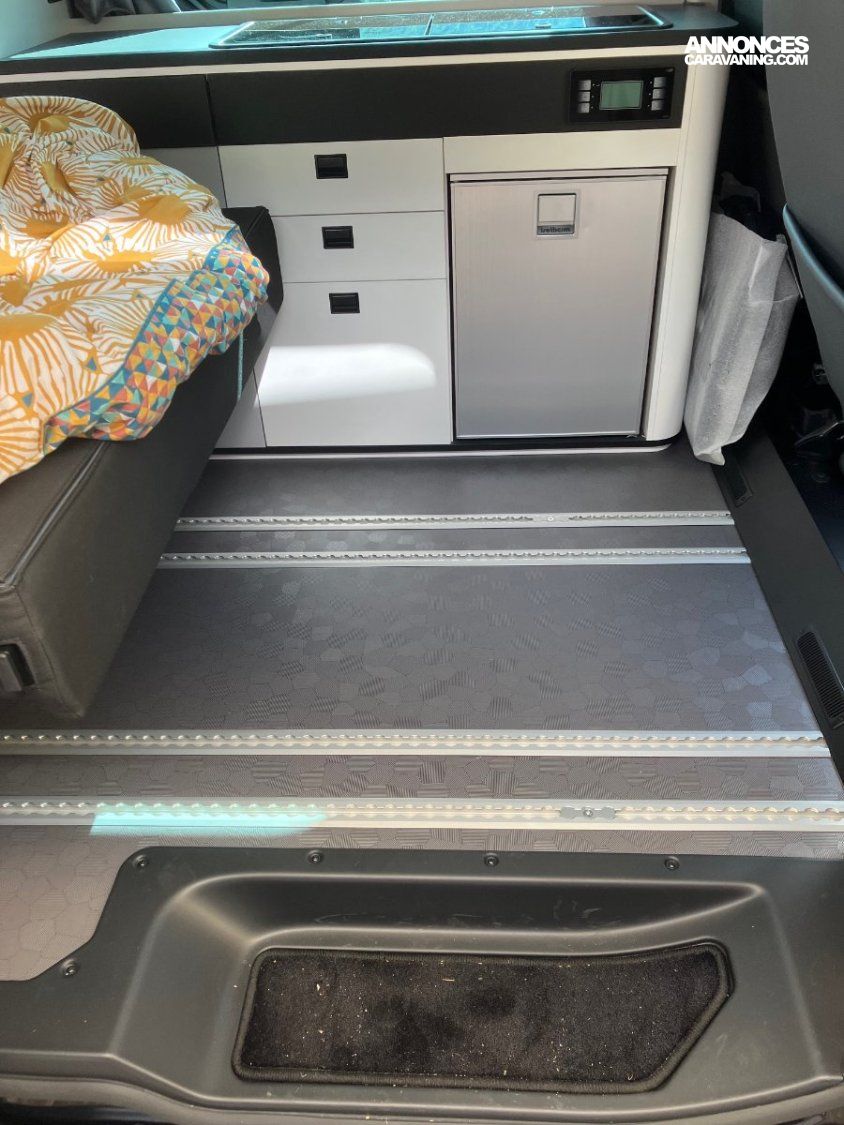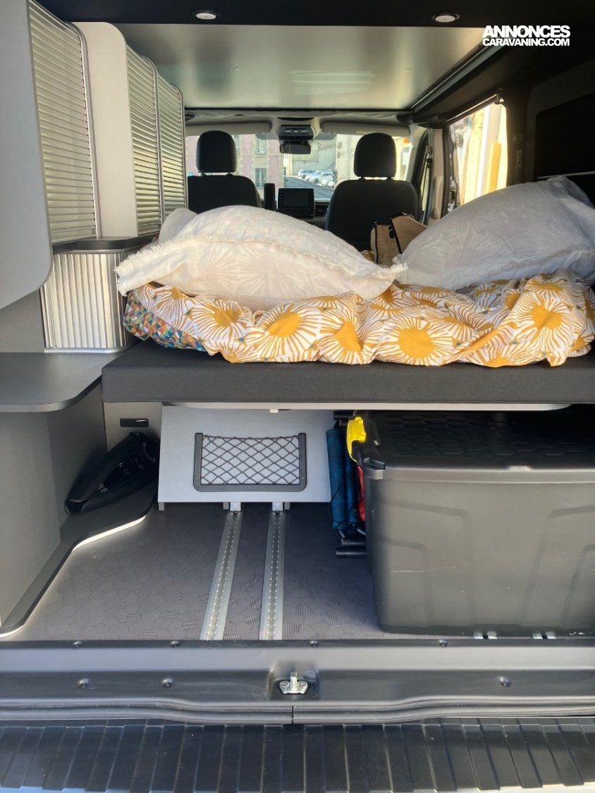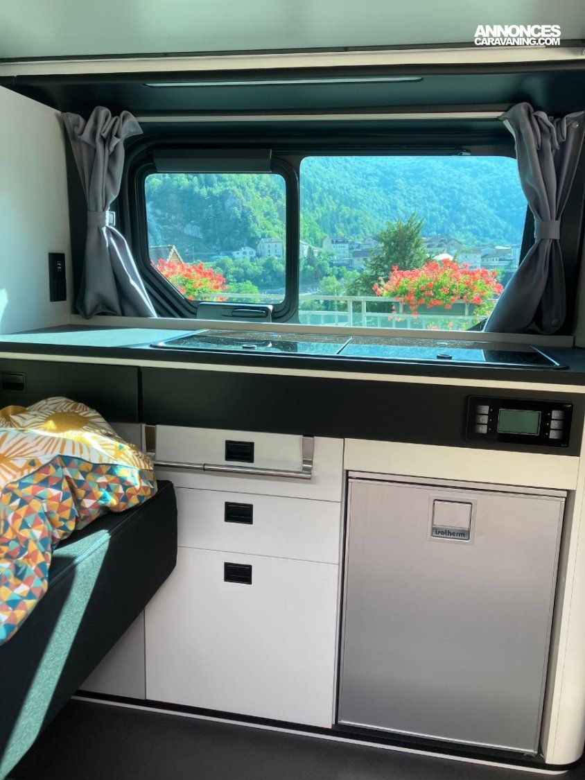 5,48m de long, 2,07m de haut. 5 places en conduite, 2 couchages de 140x190cm. Evier, cuisinière gaz 2 feux, douchette extérieure, chauffage (alimenté par le réservoir de gasoil du van) thermostatique, climatisation du poste de conduite, ventilation de l’habitacle, nombreux éclairages led et prises USB, nombreux rangements, réservoir d’eau potable 60l, réfrigérateur 49l et compartiment glace.