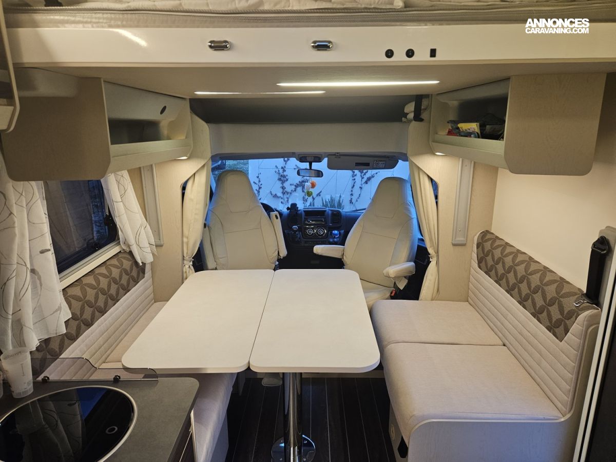 Aménagement haut de gamme avec 6 places repas, 4 places CG et 4 couchages.
