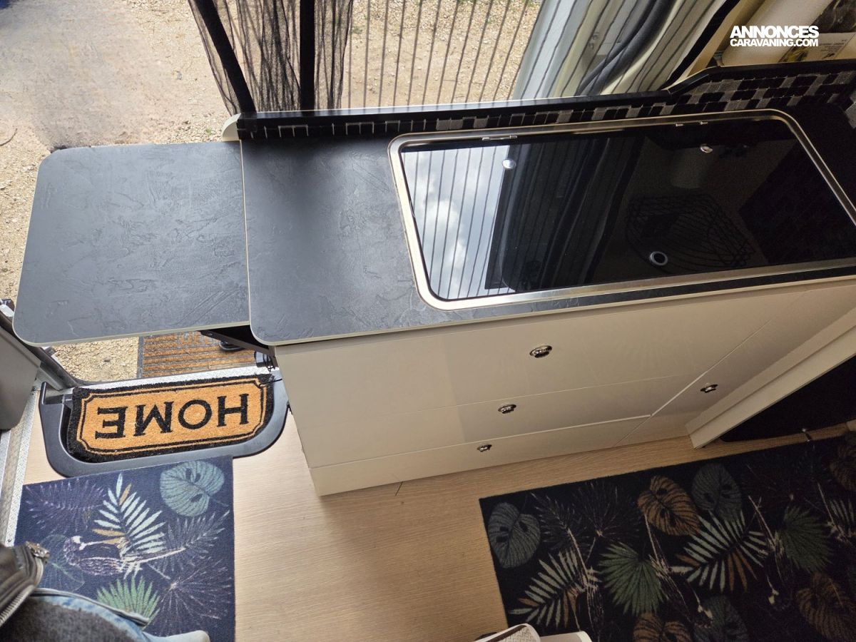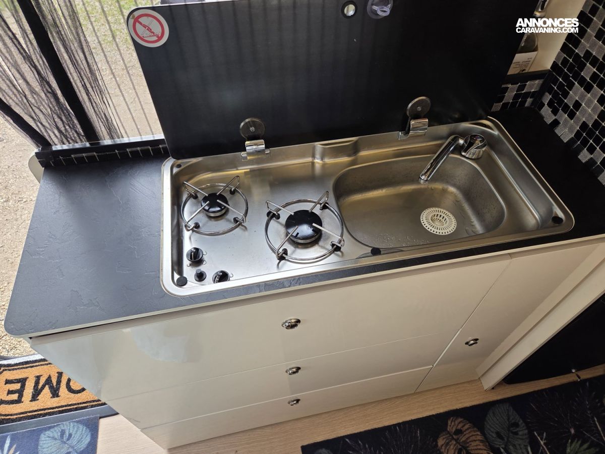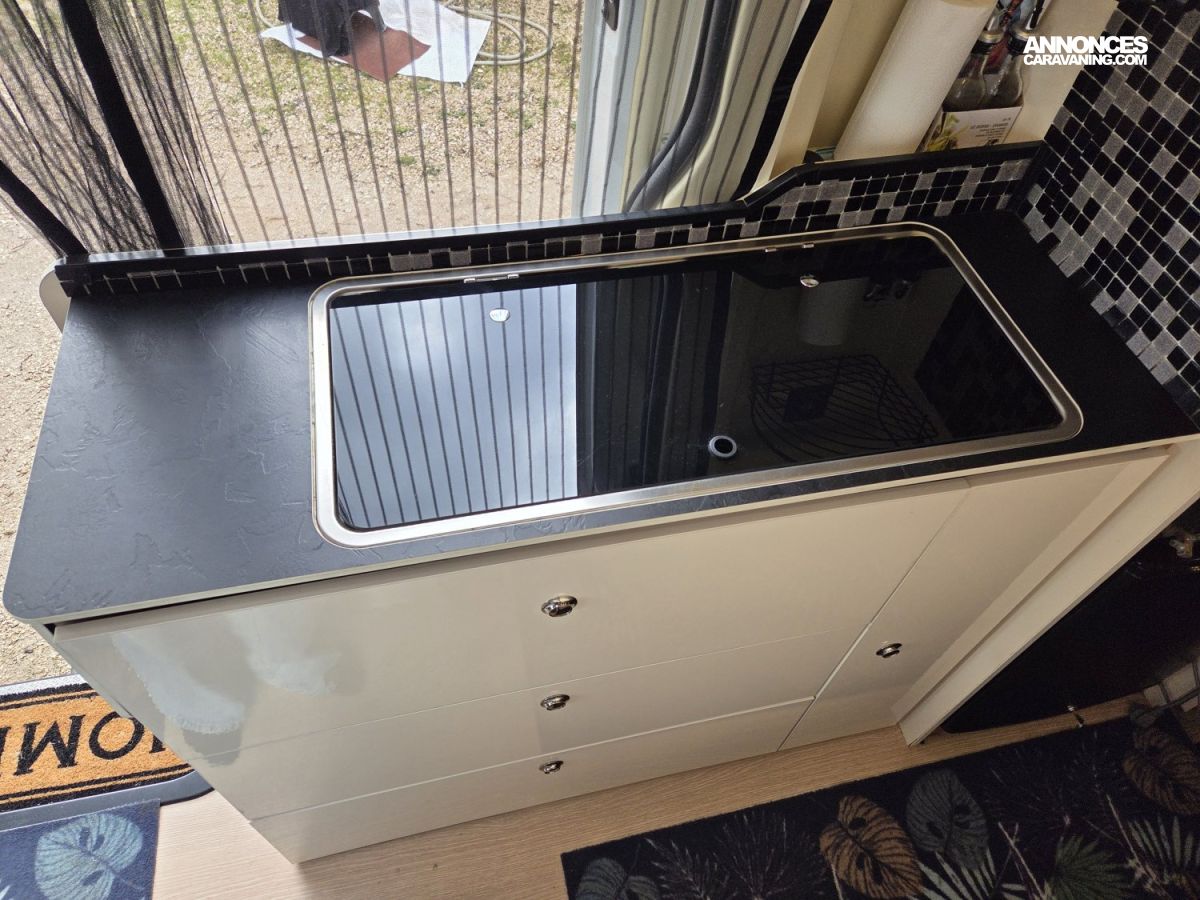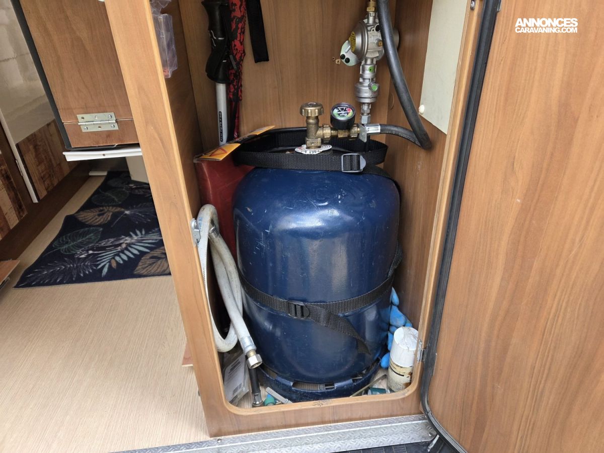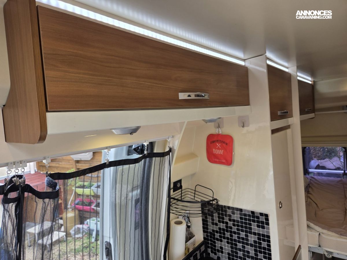 CHAUFFAGE CARBURANT, STORE EXTERIEUR 3M, GAZINIERE 2 FEUX, FENETRE SDB, ECLAIRAGE LED, PORTE VELO, REFRIGERATEUR 12V A COMPRESSION, CHAUFFE-EAU GAZ