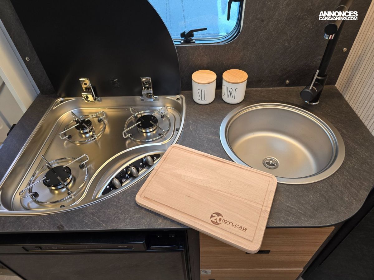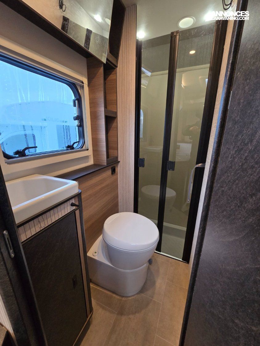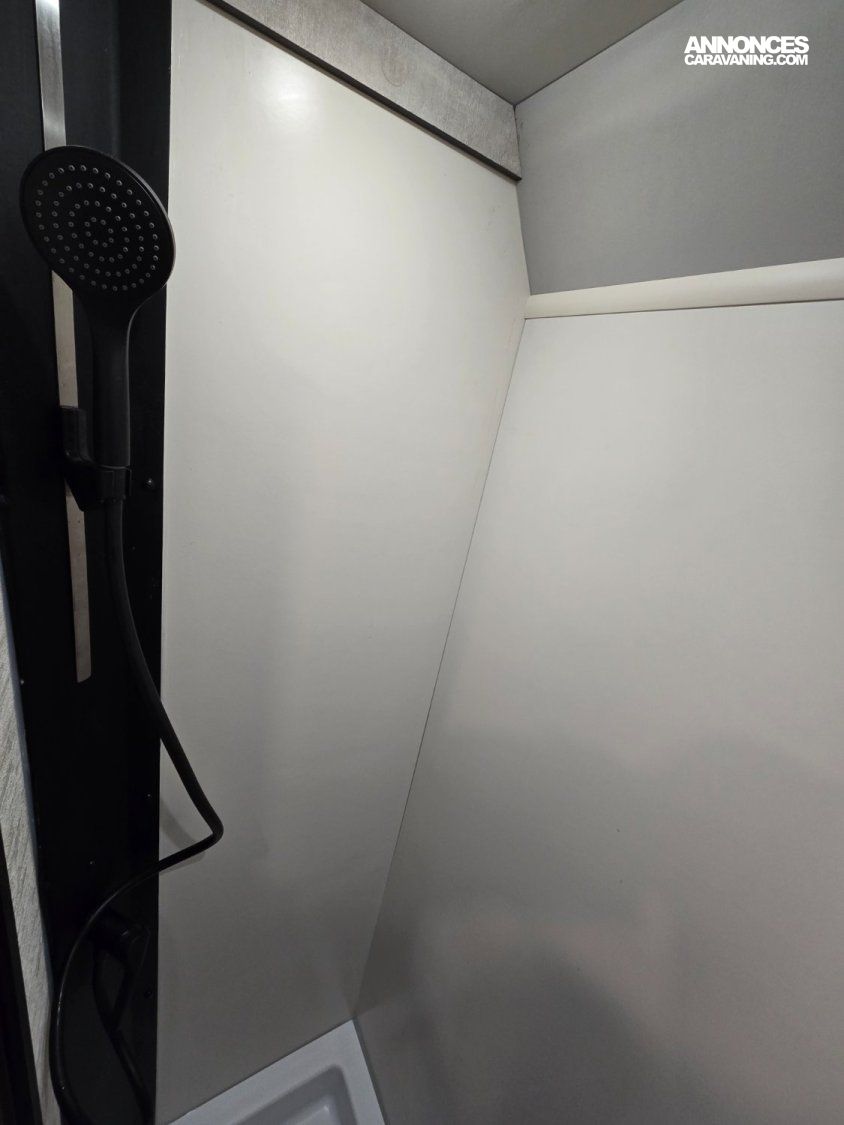En outre, ce camping car dispose d'une salle de bain avec douche séparée, d'une cuisine avec d'une plaque de cuisson à trois feux, d'une penderie et nombreux rangements