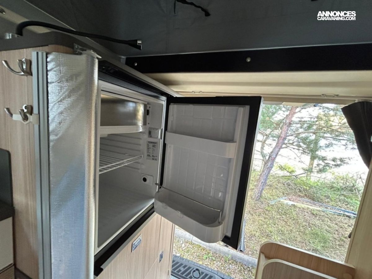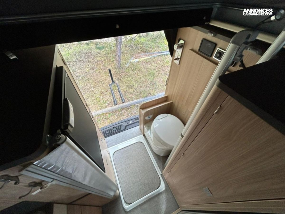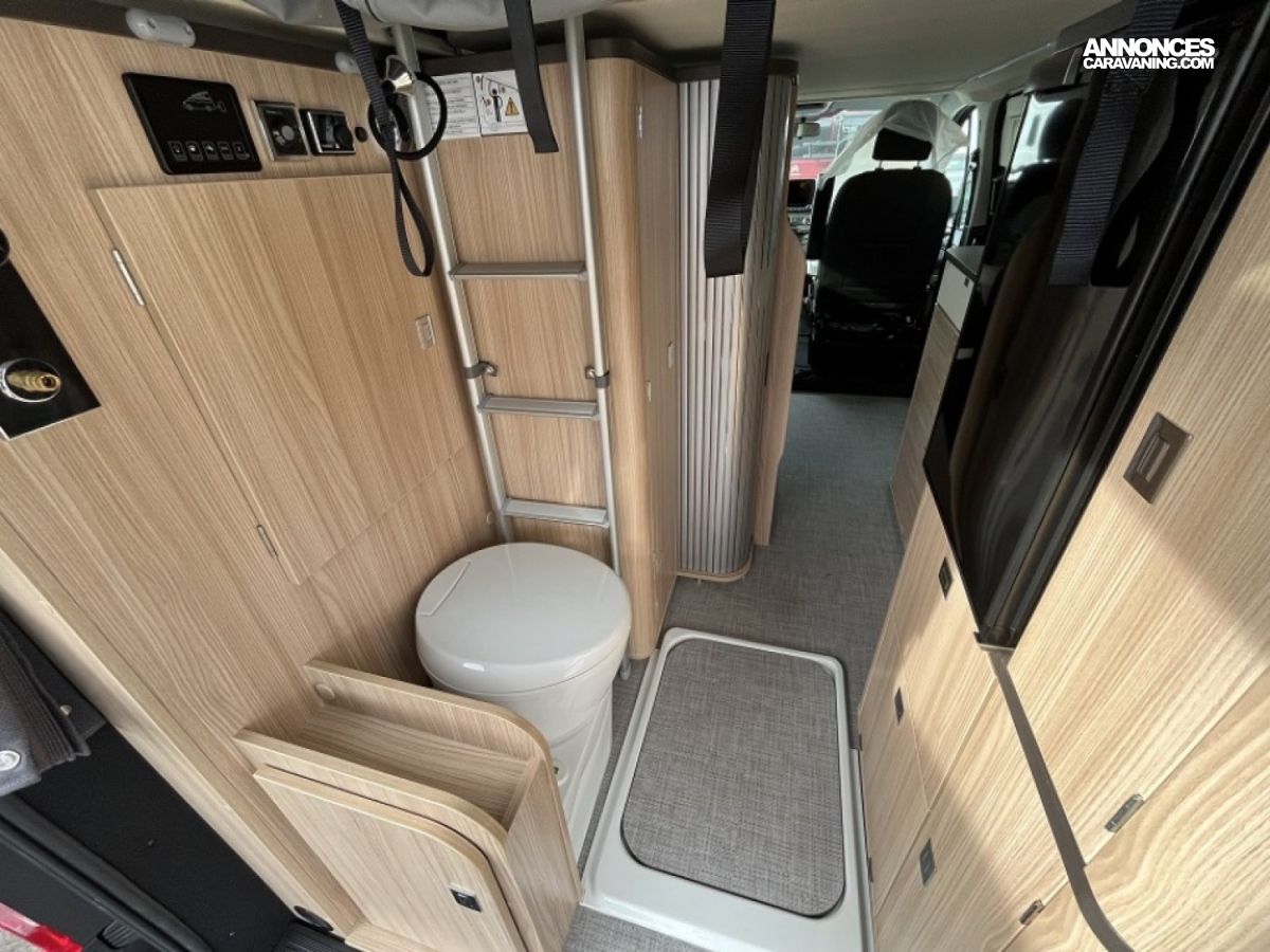 Accessoires : Alarme, occultant avant, tapis avant, bouteille de gaz, jantes alu 16 pouces, caméra de recul, douchette intérieure avec bac et rideau, douchette extérieure, réservoir eau propre 50L, réservoir eau usée 36L, WC fixe à cassette, éclairage LED avec spots et bandeaux lumineux, chauffage et chauffe eau Webasto
