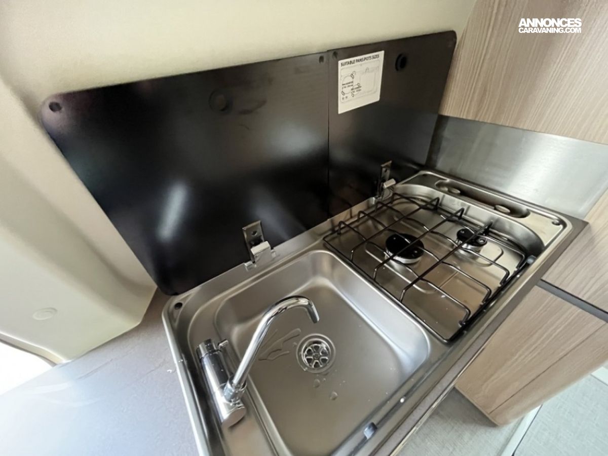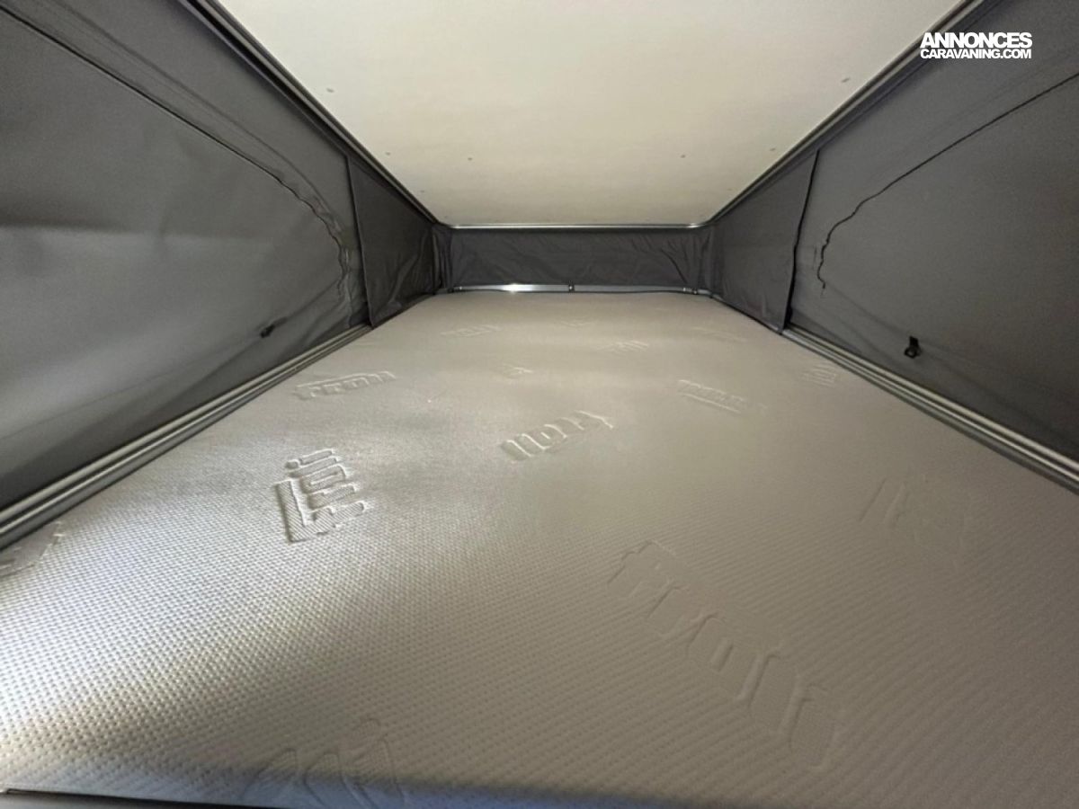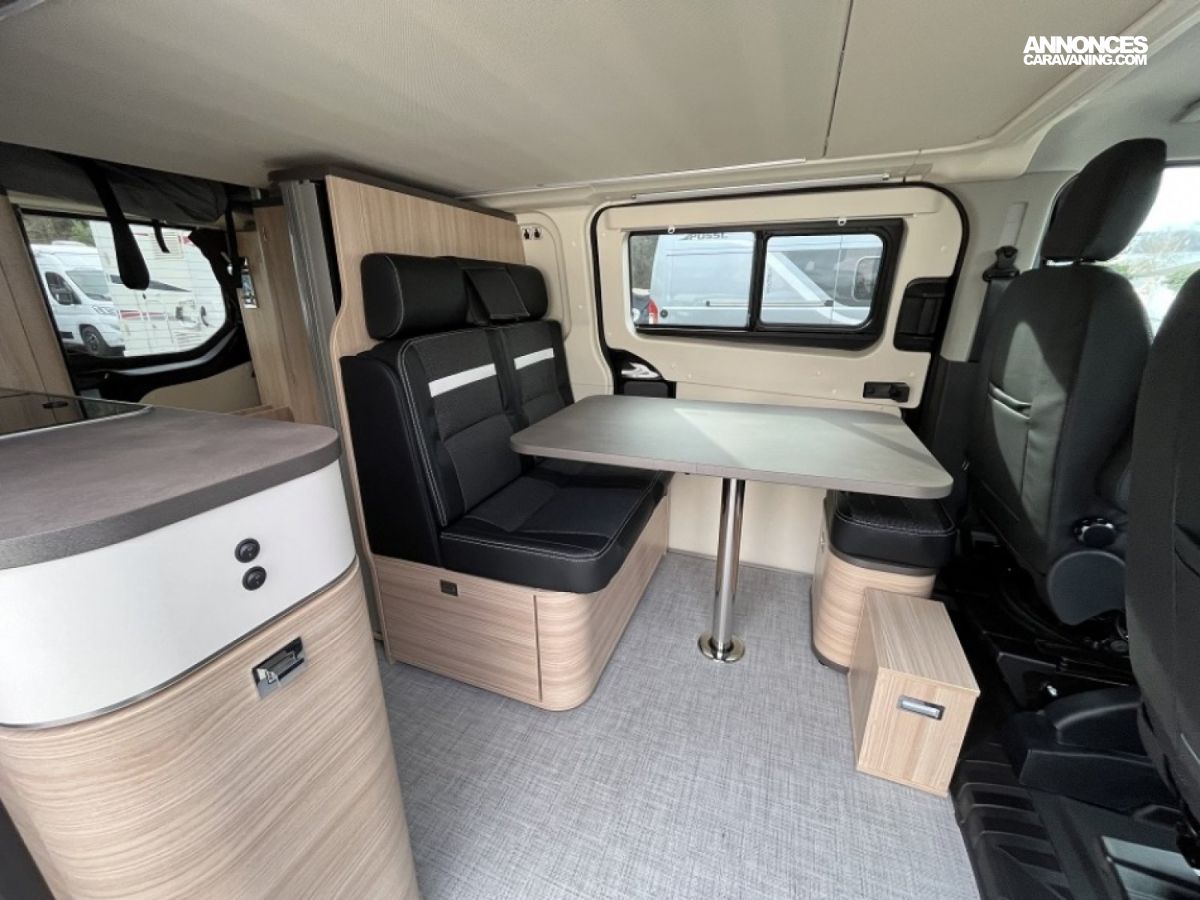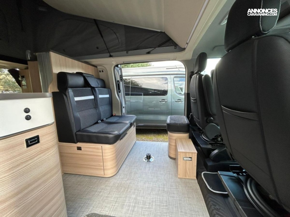 Accessoires : Alarme, occultant avant, tapis avant, bouteille de gaz, jantes alu 16 pouces, caméra de recul, douchette intérieure avec bac et rideau, douchette extérieure, réservoir eau propre 50L, réservoir eau usée 36L, WC fixe à cassette, éclairage LED avec spots et bandeaux lumineux, chauffage et chauffe eau Webasto
