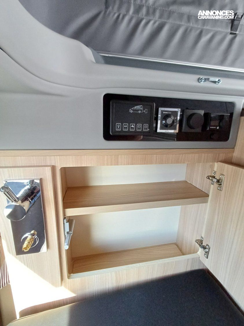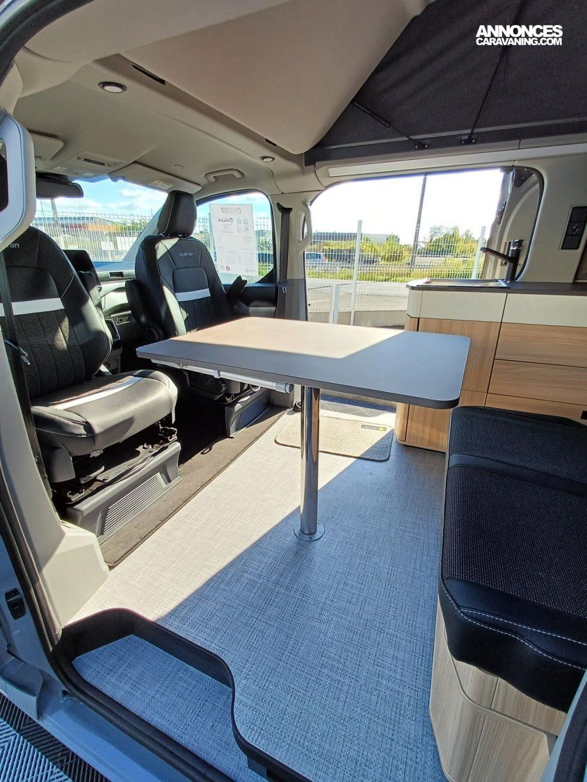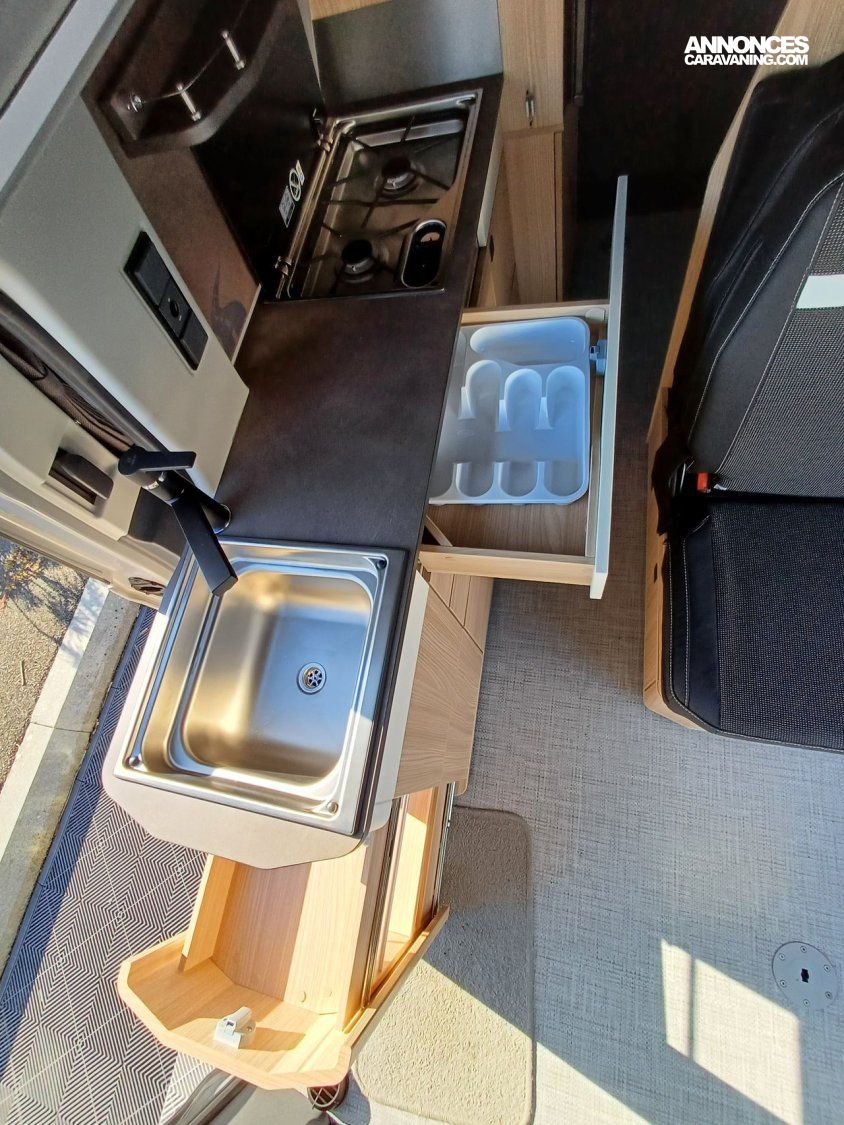 - Pack Custom : Pré-disposition solaire, banquette BZ électrique, chauffe-eau (avec boiler 10 l) Truma, batterie cellule AGM 92 AH, sacoche avec 2 fauteuils et table camping, tapis cabine, variateur de luminosité, 2ème porte latérale vitrée à gauche, rideaux opacifiants.