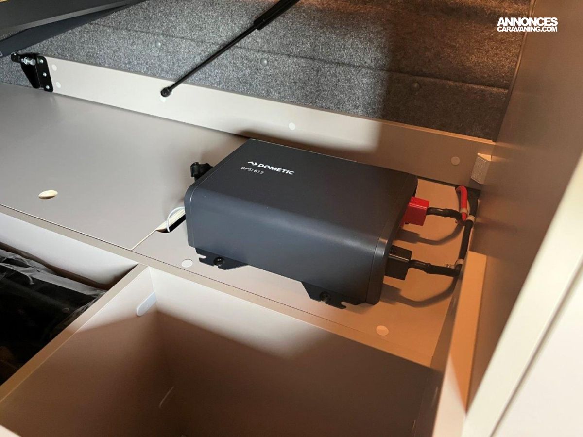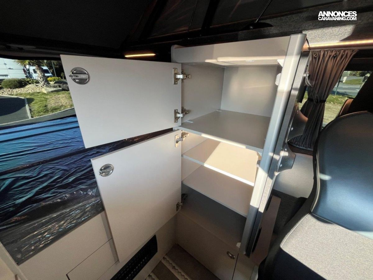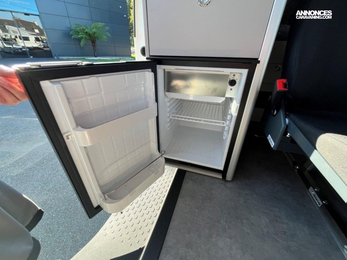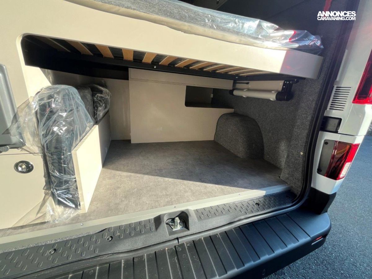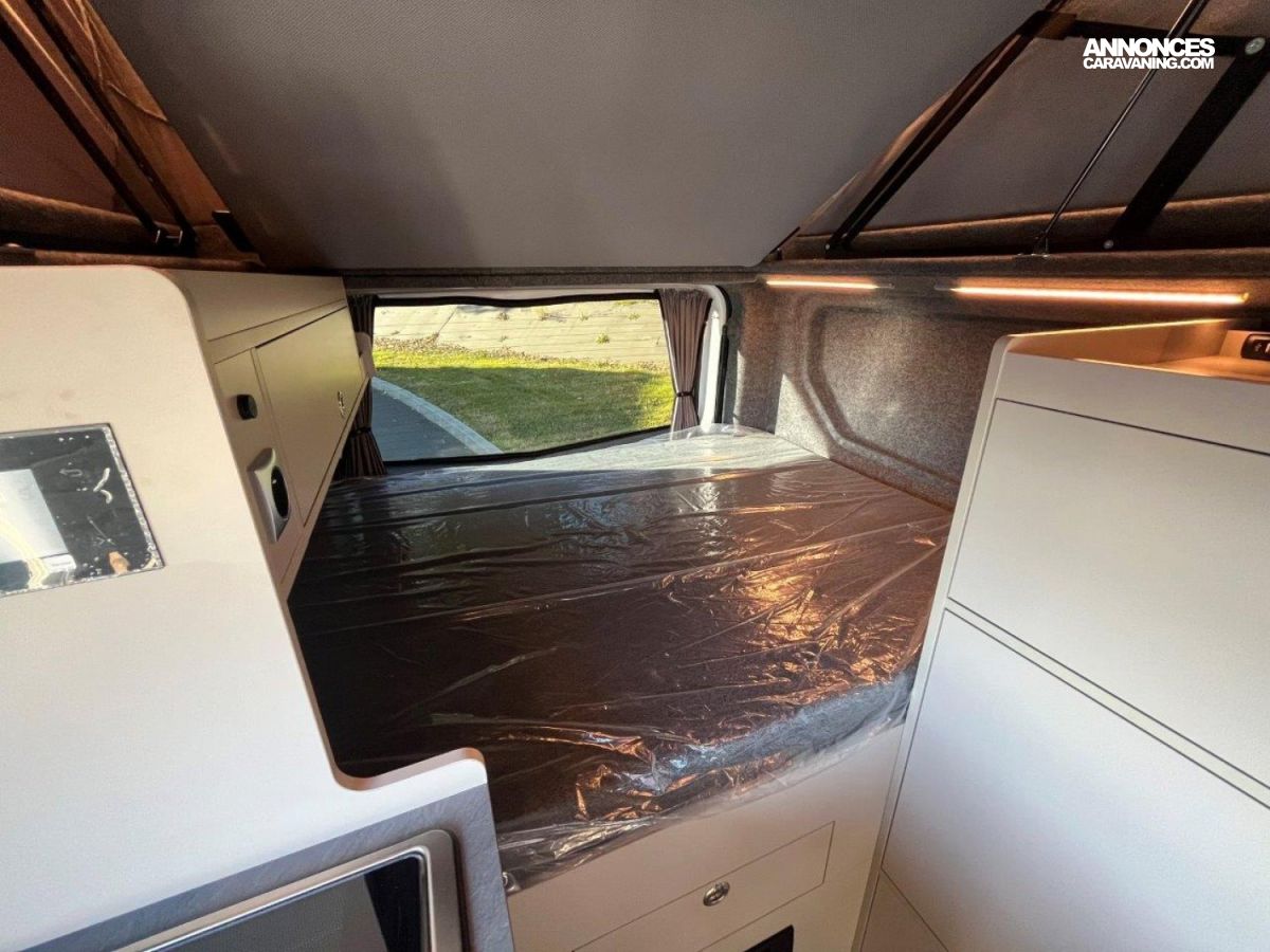 Et pour cause, il concilie un lit permanent transversal à l’arrière, un WC portatif accessible à tout moment et vous pourrez même vous doucher à l’arrière du van avec eau chaude et 80L d’eau propre en réserve.