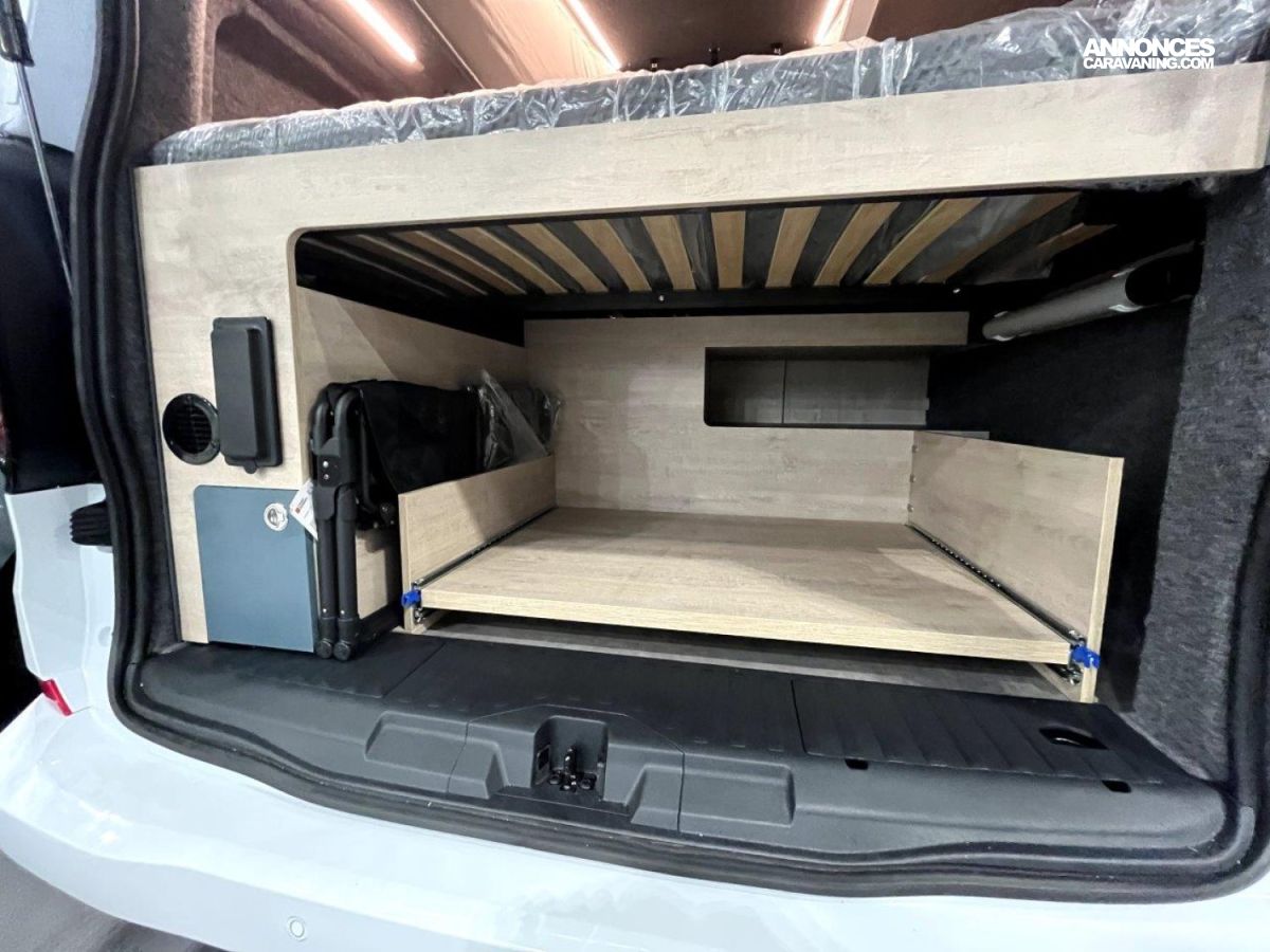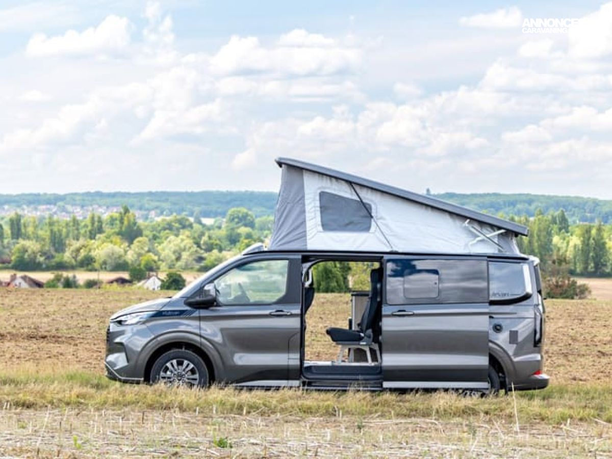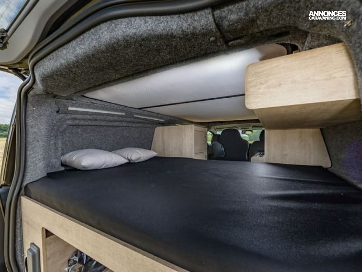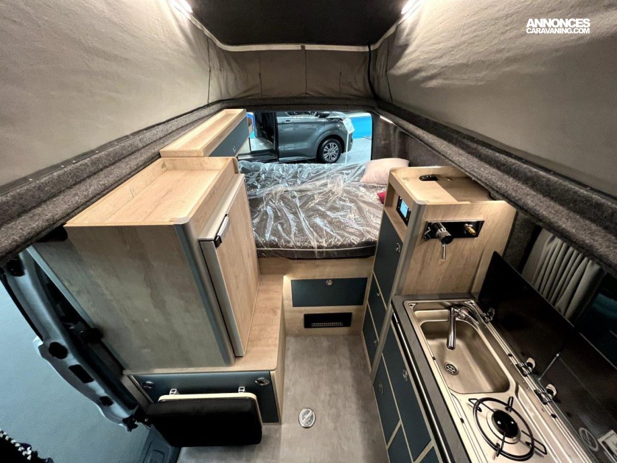 - Couchage permanent : lit transversal arrière (135 x 188 cm) + option lit dans le toit relevable.