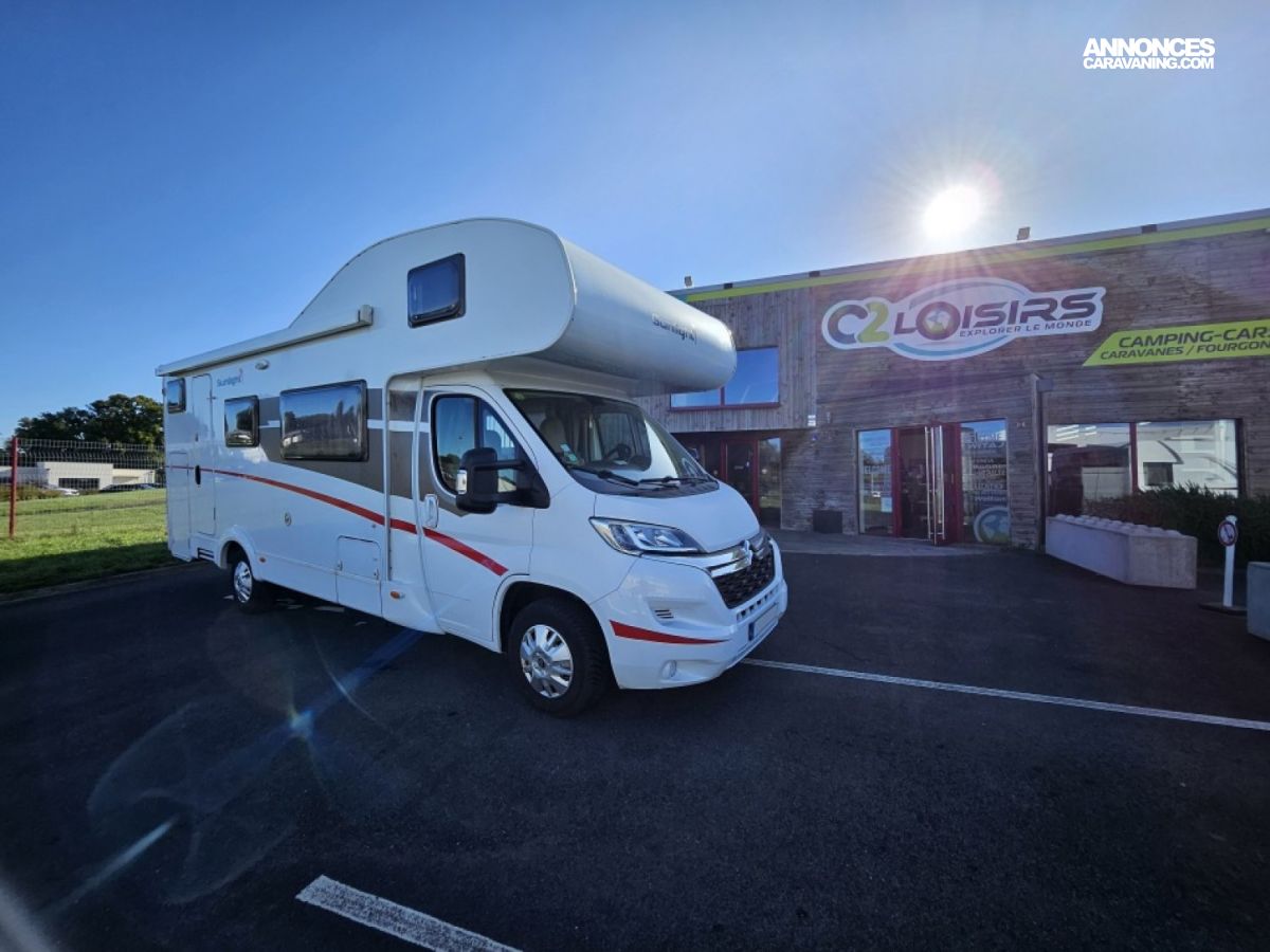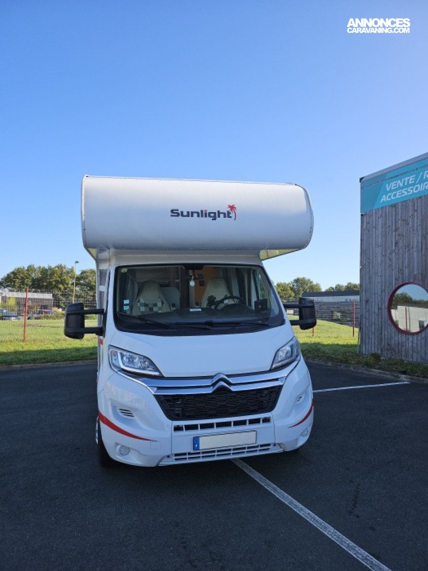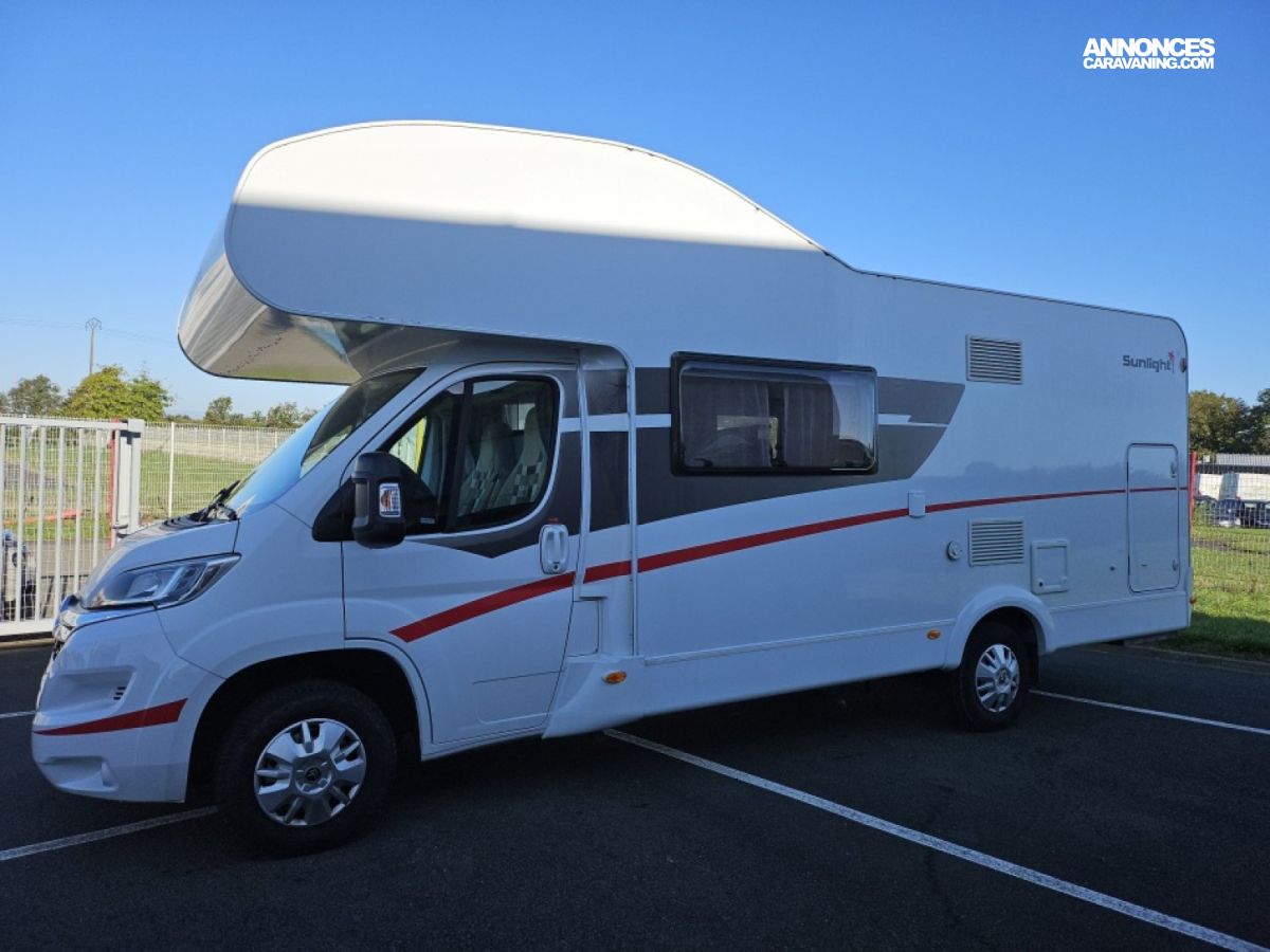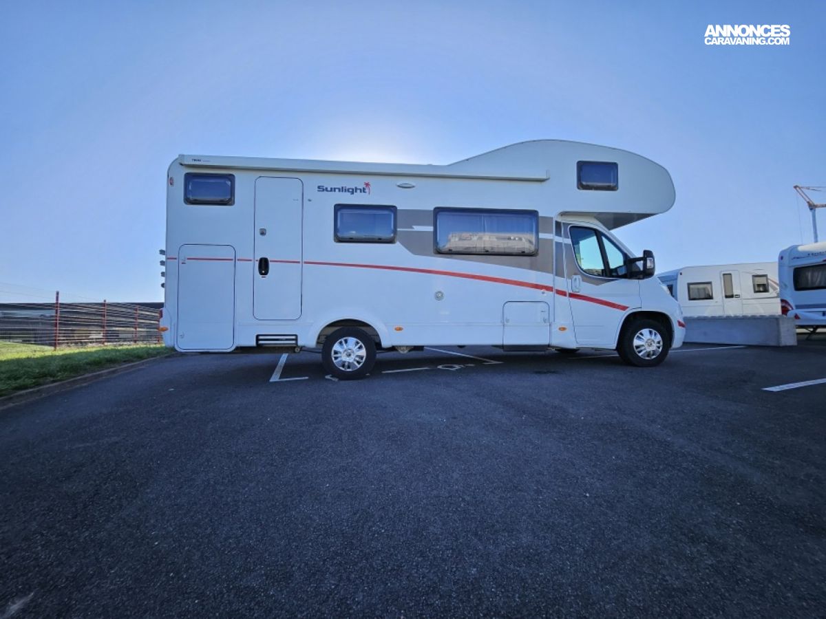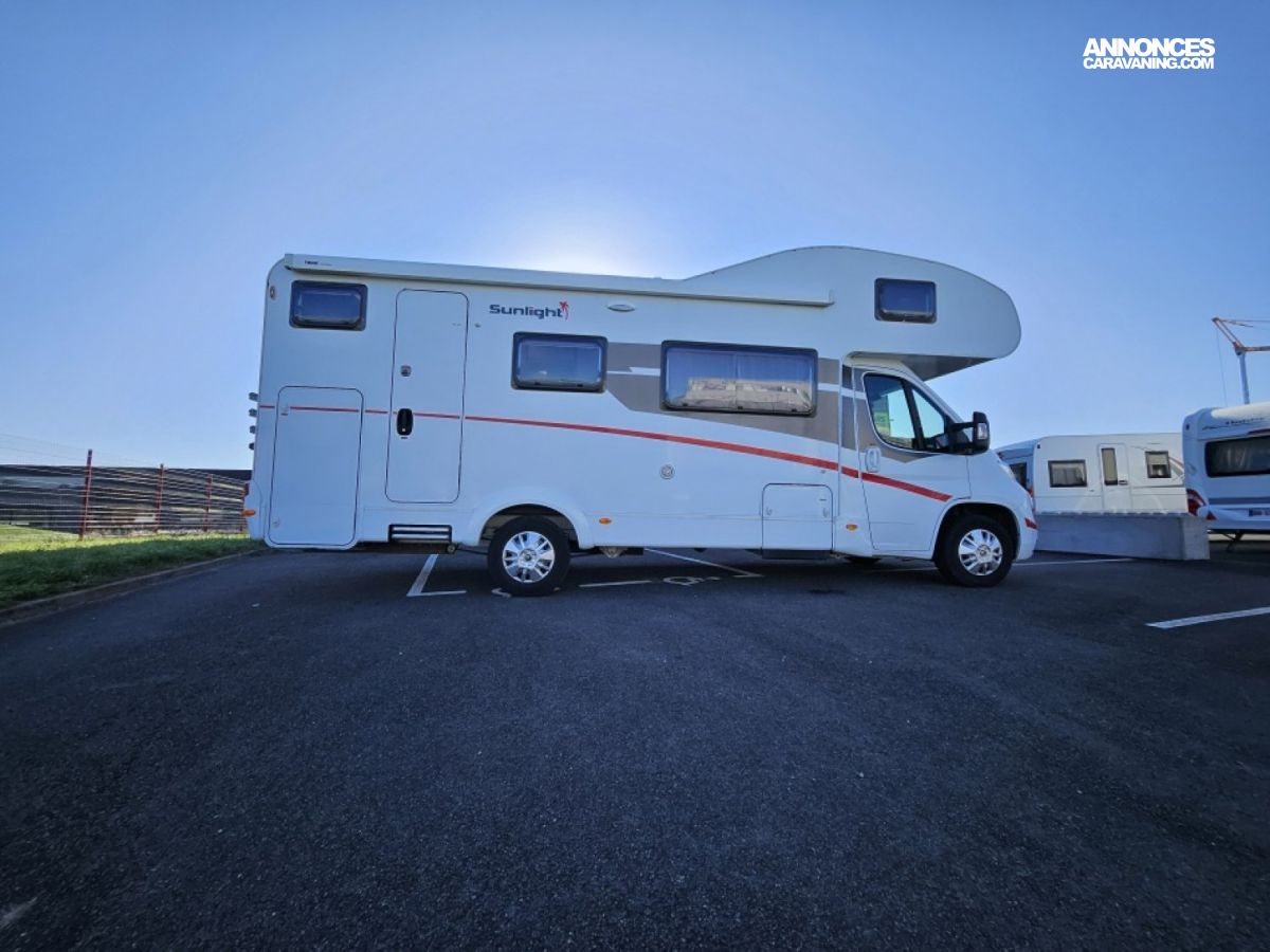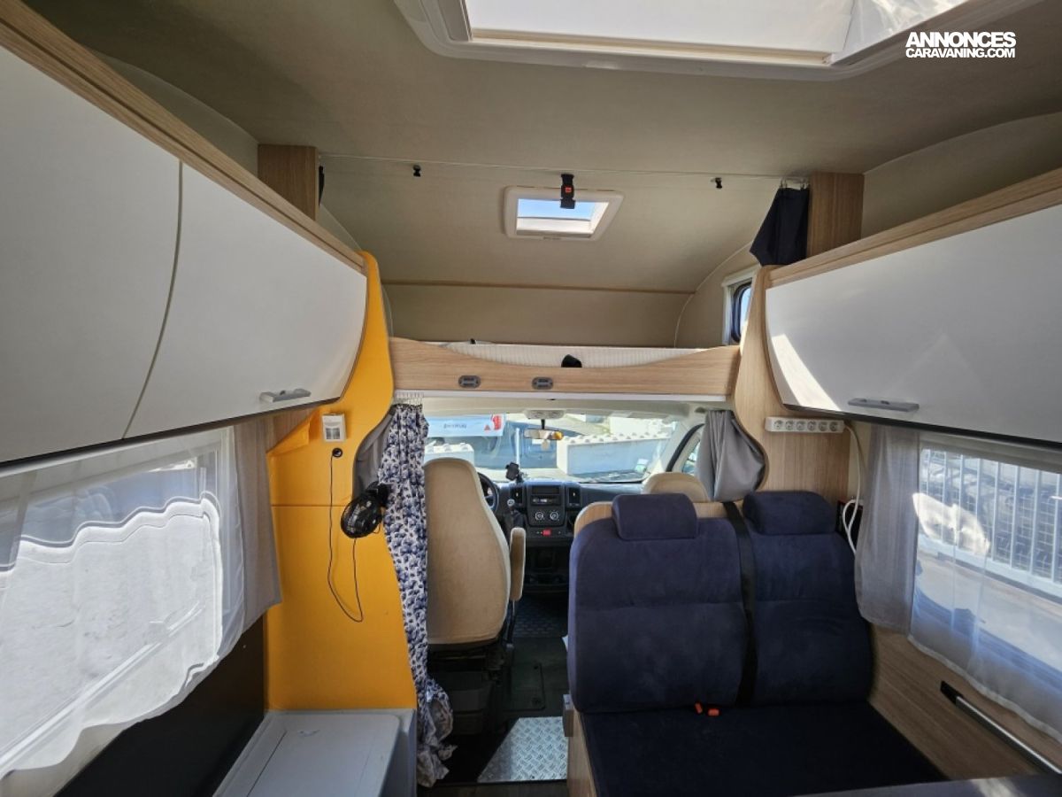 Capucine Sunlight, agencement familiale, 6 couchages, lits superposés modulable en soute, salle de bain modulable, cuisine équipée d’un grand frigo automatique, maxi salon avant avec dinette 4 personnes.