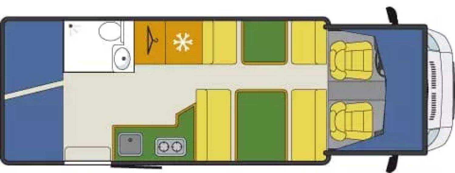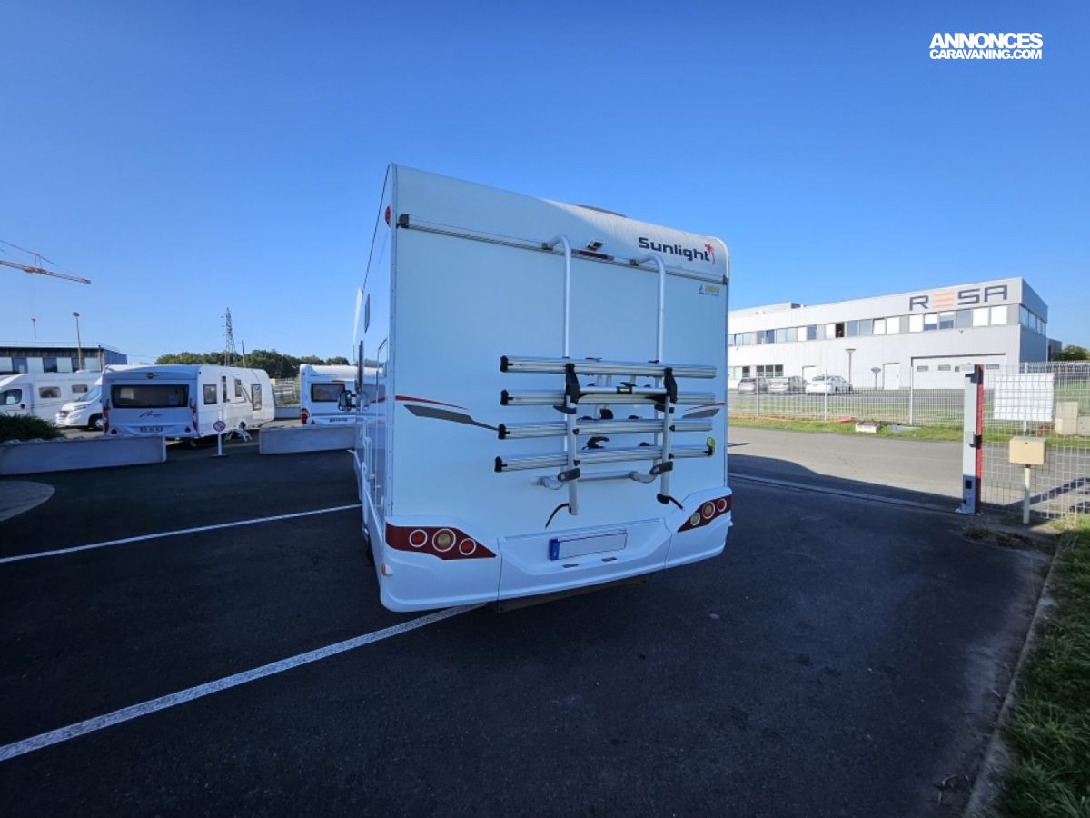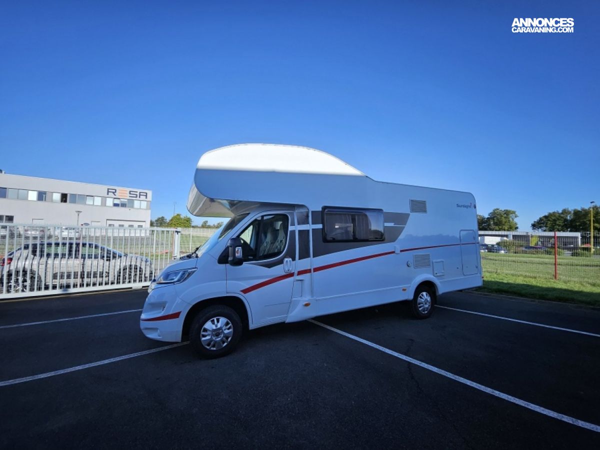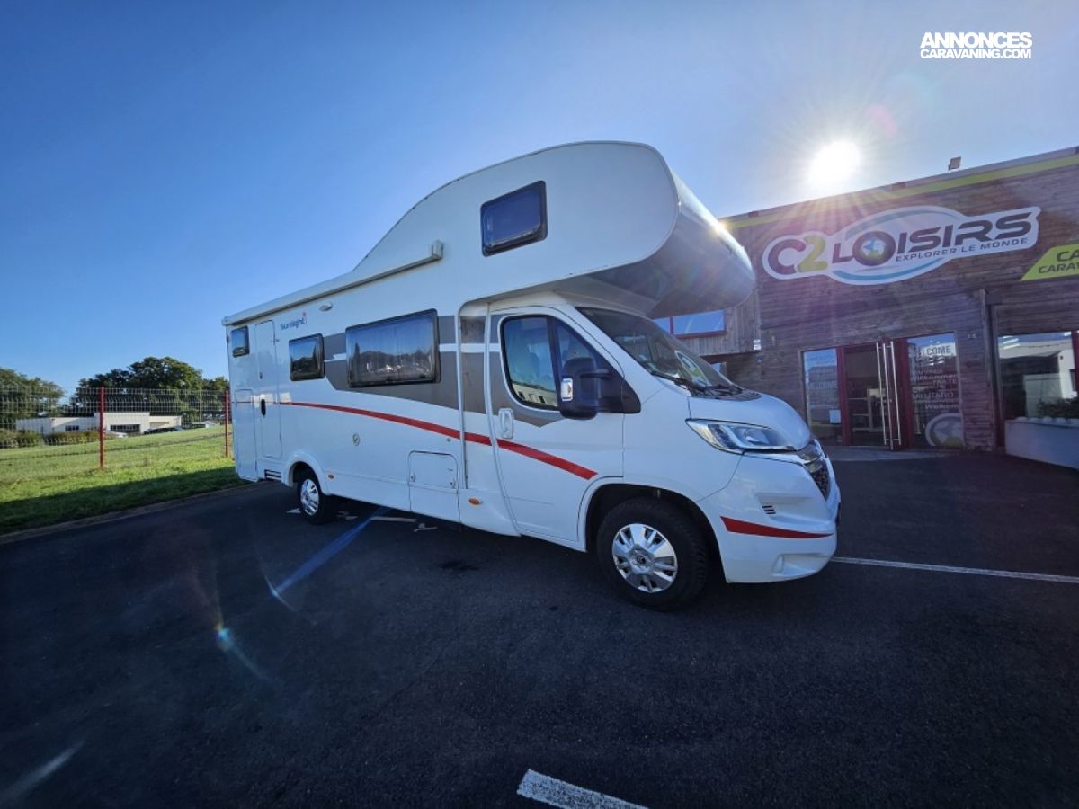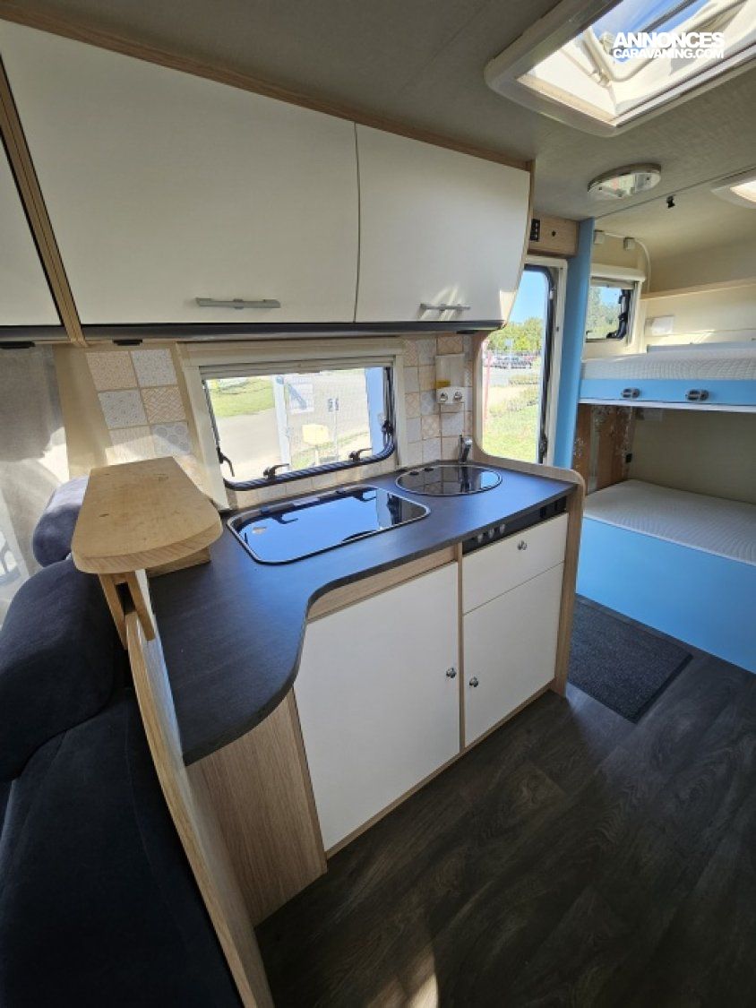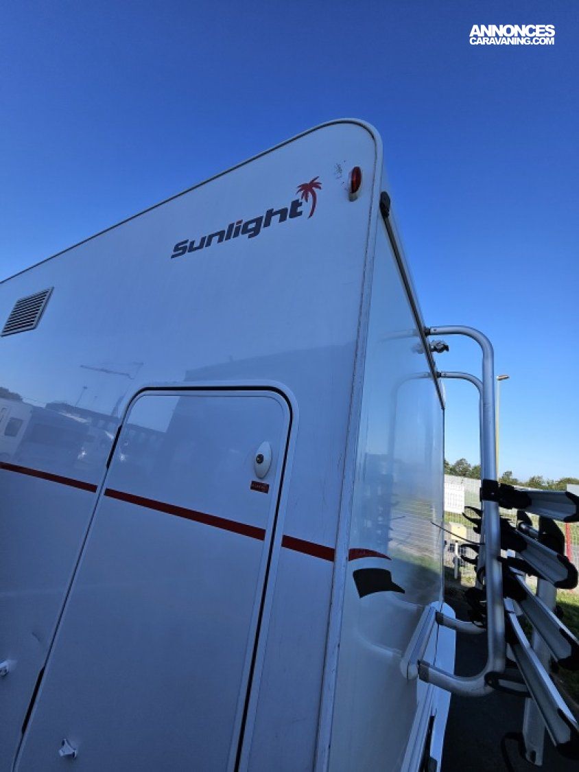 Capucine Sunlight, agencement familiale, 6 couchages, lits superposés modulable en soute, salle de bain modulable, cuisine équipée d’un grand frigo automatique, maxi salon avant avec dinette 4 personnes.