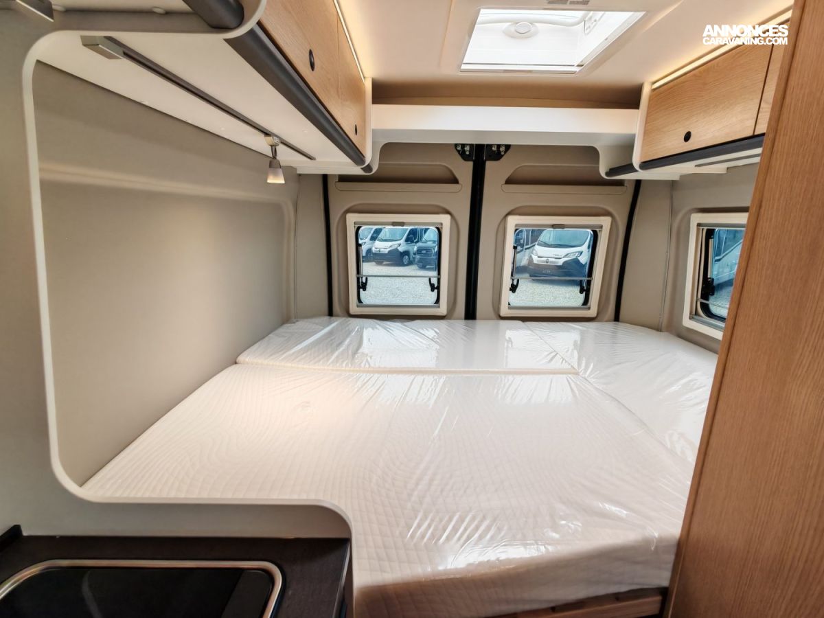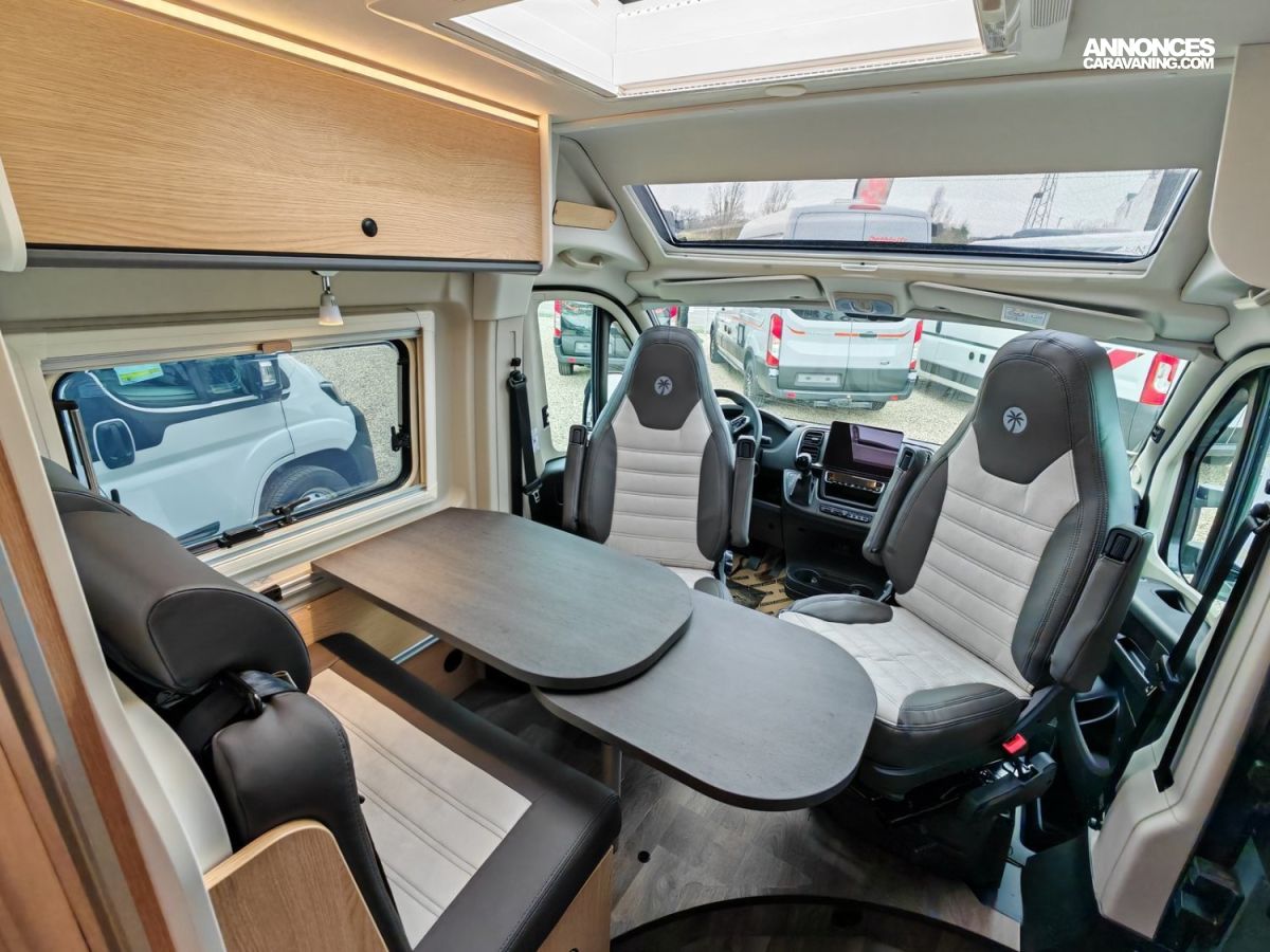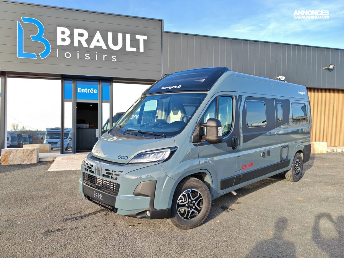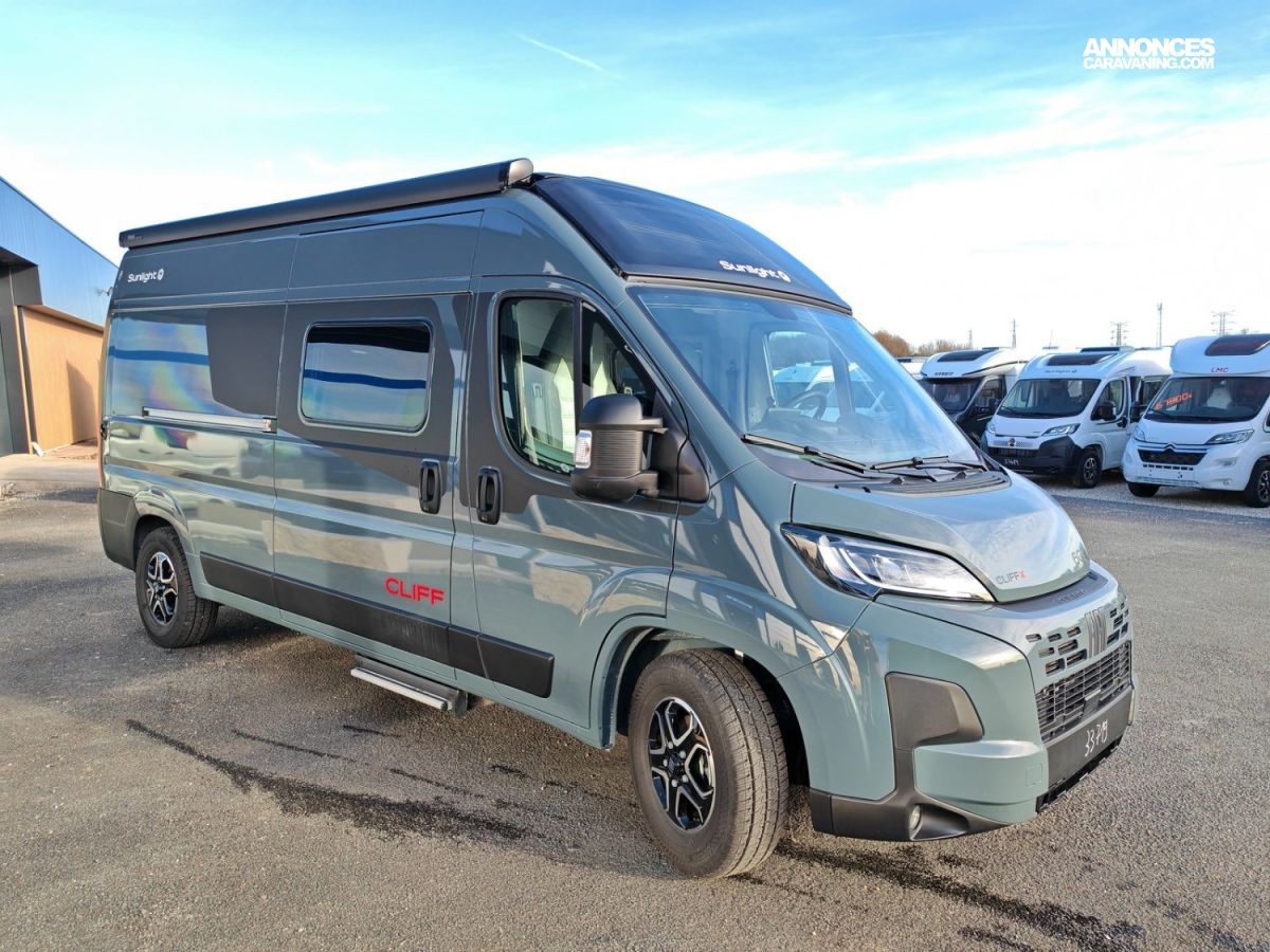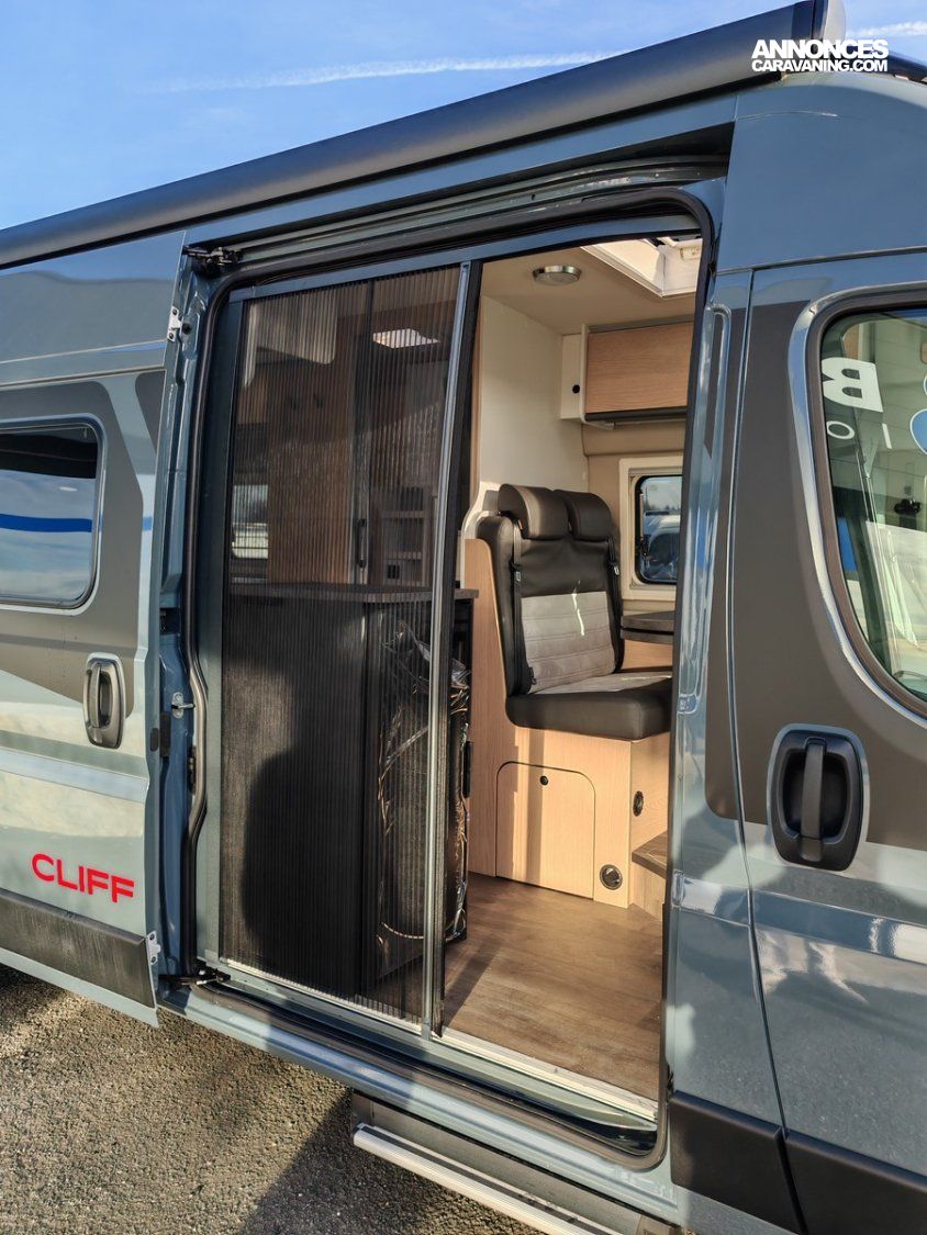 - Pack "Cliff X" (baie dans la salle d'eau, tringle à vêtements dans la salle d'eau, marchepied électrique, rallonge de table dans la dînette, grand lanterneau, pack douche, châssis 3T500, motorisation 140 Cv, stickage et sellerie "Adventure", placard de pavillon avec éclairage LED, placards de pavillon périphériques à l'arrière, lanterneau Skyview de cabine, baies à cadre, store, pare-chocs avant laqué, jupe avant de couleur noire, feux antibrouillard, volant et pommeau de levier de vitesse en cuir, tableau de bord avec finition aluminium "Techno-trim", jantes alu 16" bi-ton),