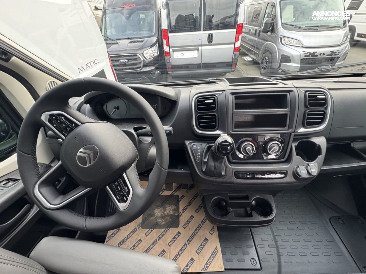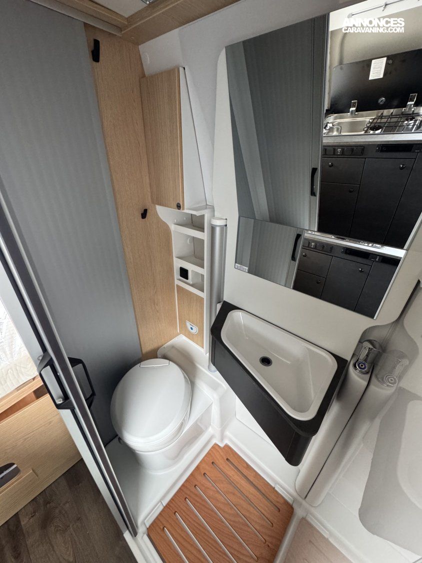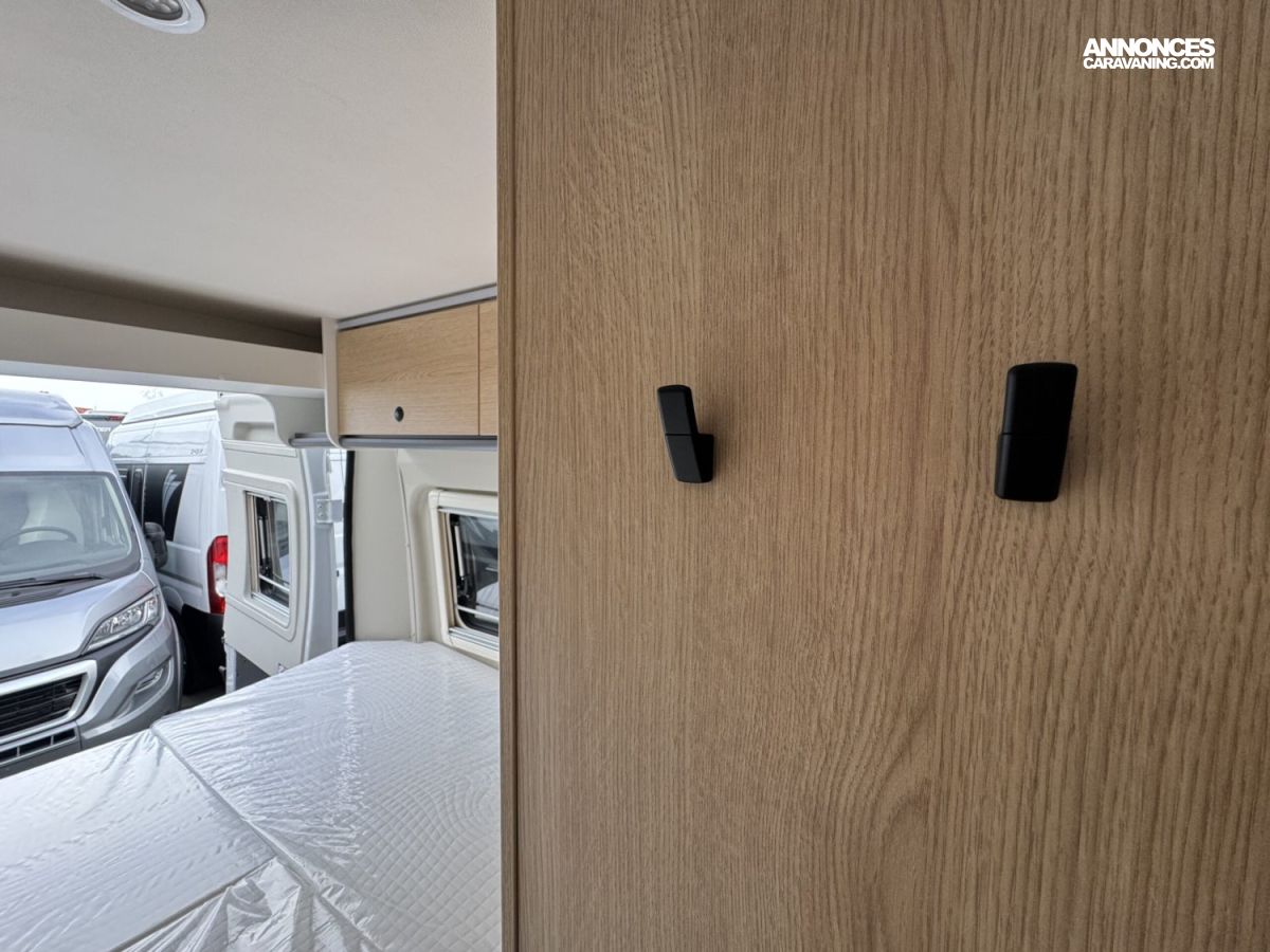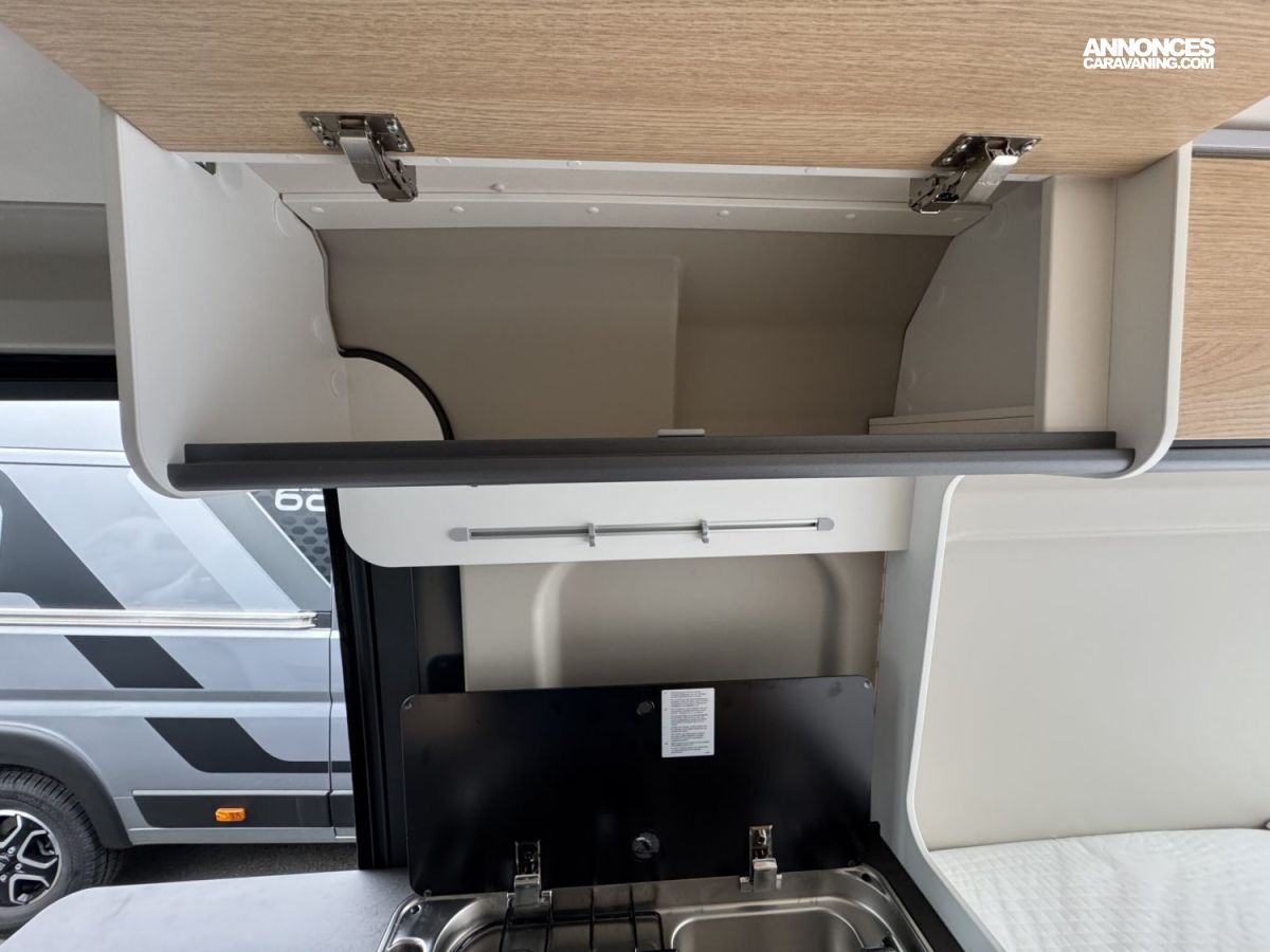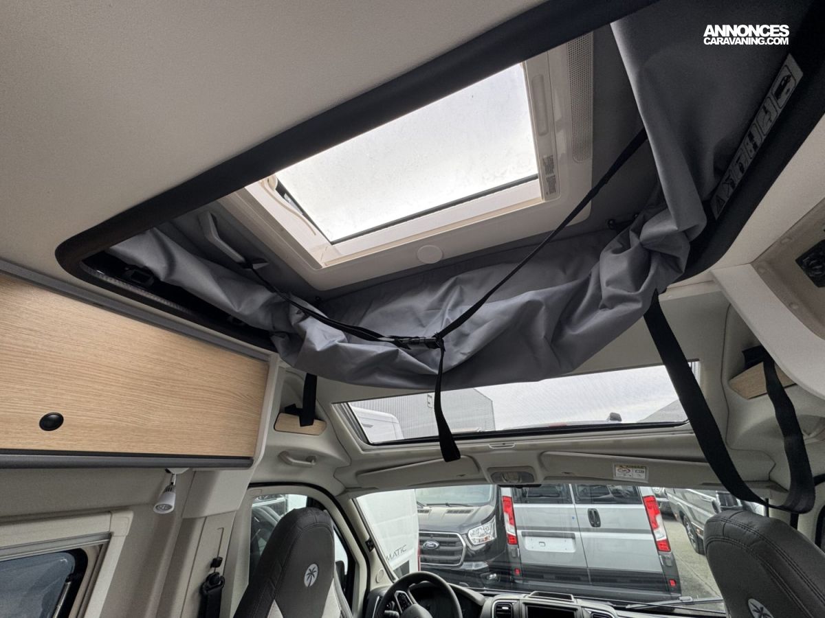 Volant et pommeau du levier de vitesses en cuir, Tableau de bord avec finition aluminium (Techno-Trim), Store Noir, SKYVIEW, Baies à cadre, Douche VARIO, Lanterneau panoramique 70 x 50 cm | Pack Douche | Baie dans le cabinet de toilette | Tringle à vêtements dans la salle d’eau | Large marchepied |Rallonge de table dans la dînette…