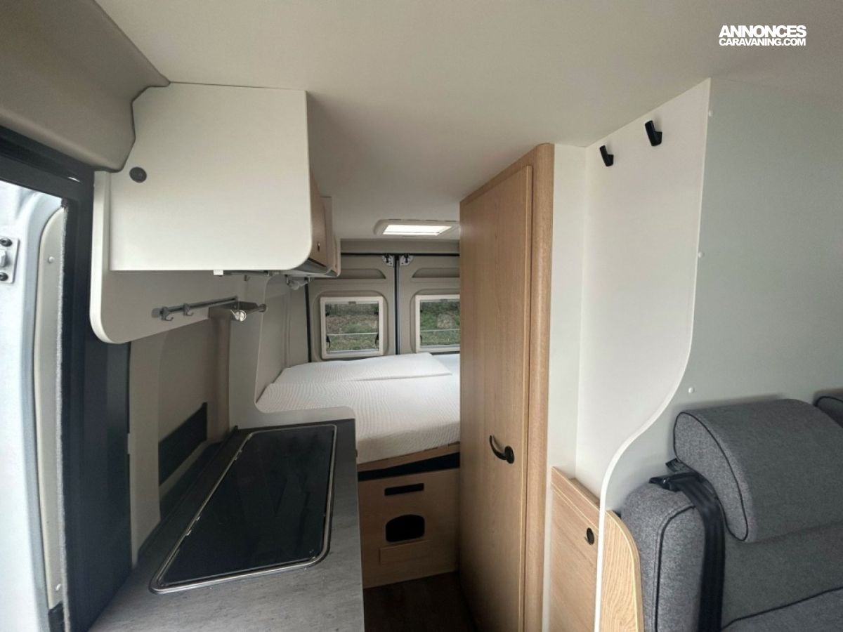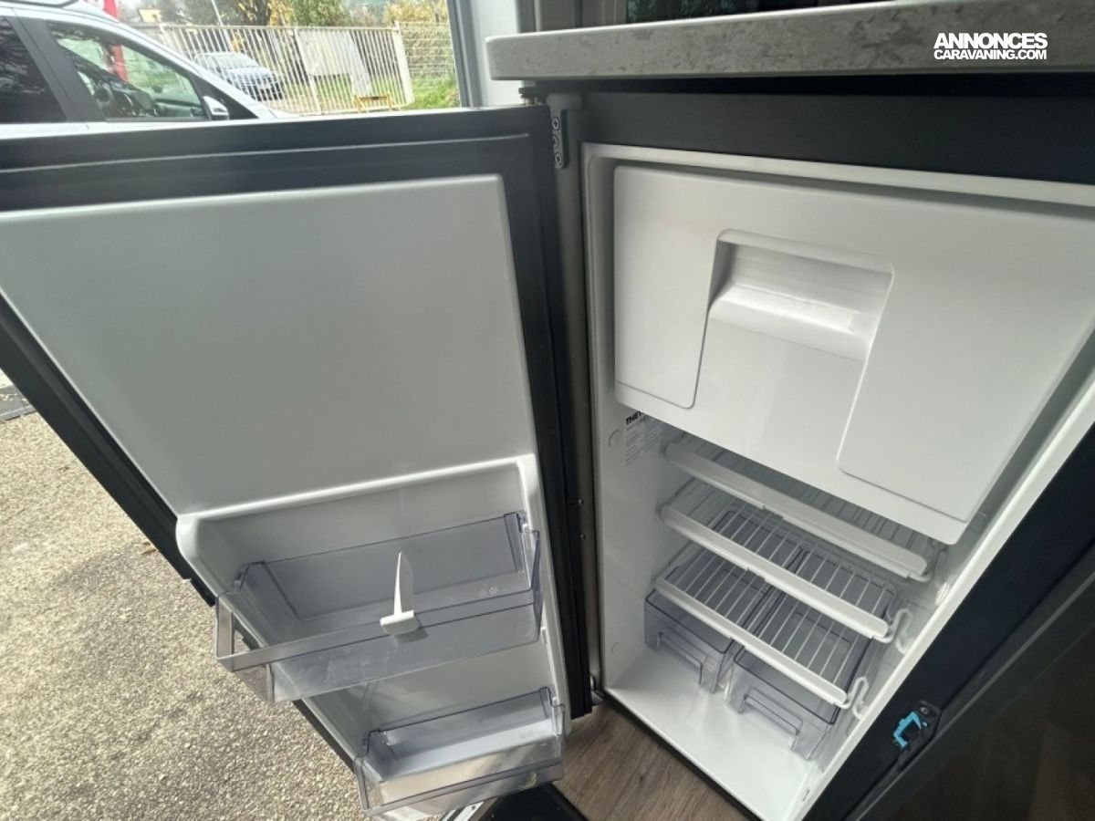 Voyagez confortablement dans ce petit fourgon au design élégant avec lit transversal arrière, cuisine et salle de bain modernes, salon spacieux, rangements modulables et réfrigérateur accessible de l’extérieur