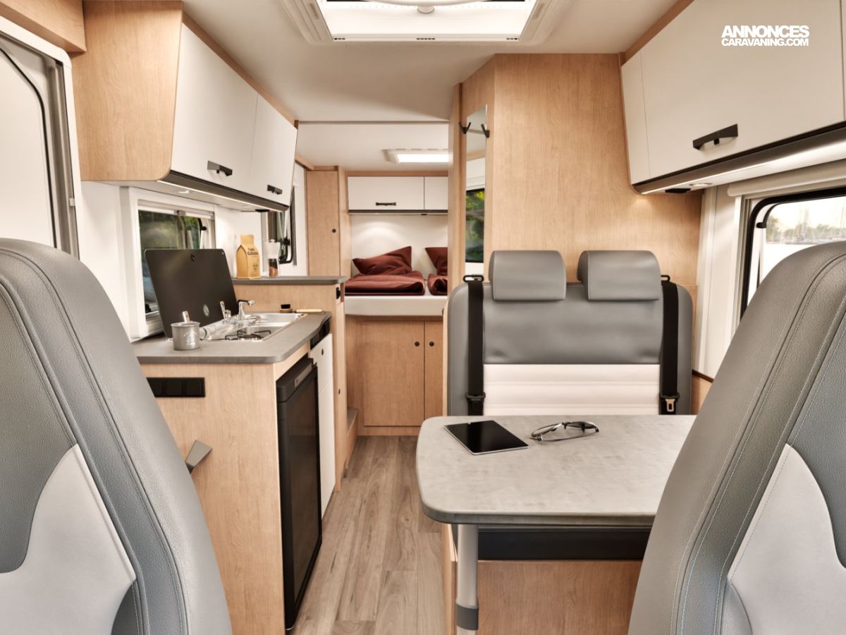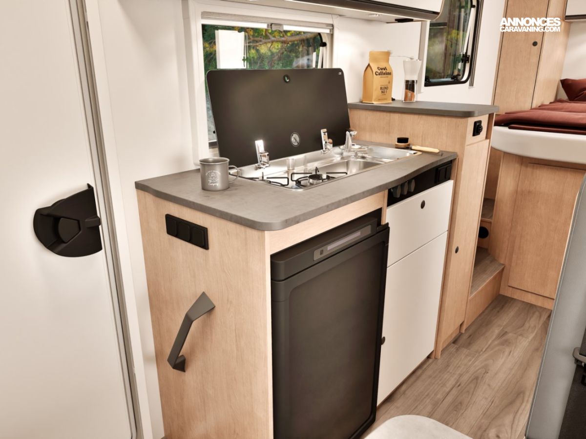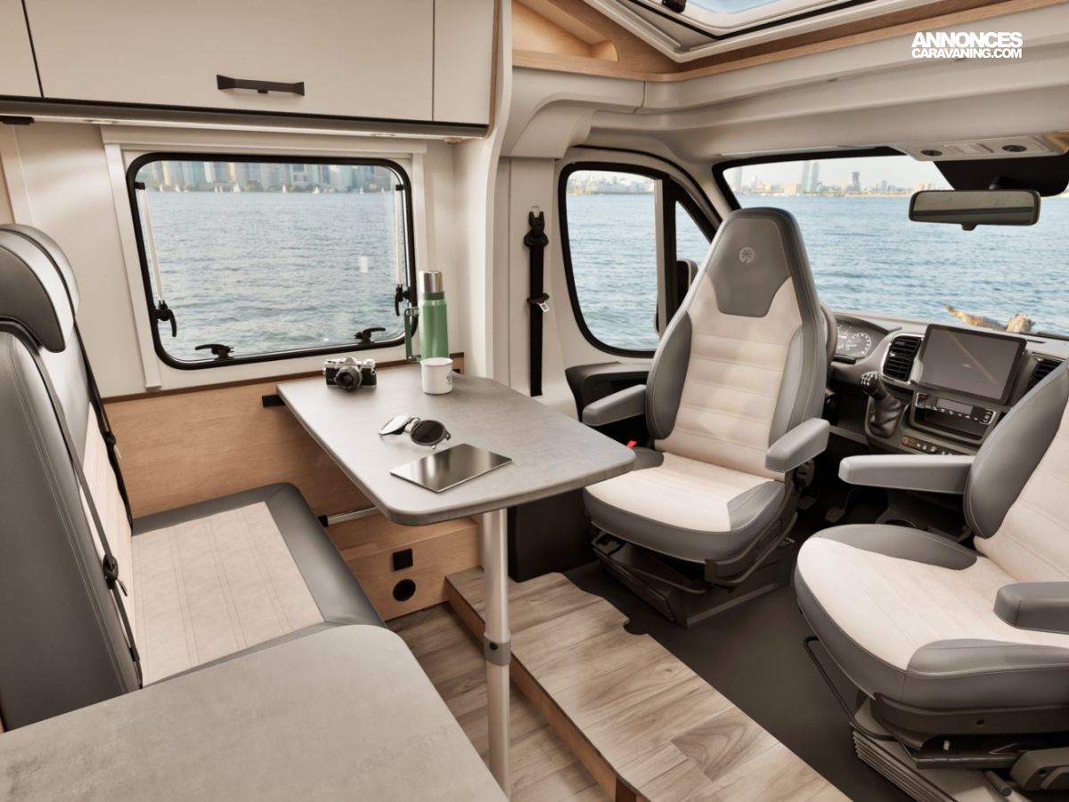 Stickage Adventure, Ambiance intérieure Adventure, Lanterneau panoramique de cabine, Portillon de service côté gauche, Modification des lits jumeaux en lit double, Pack One noir (store extérieur, porte-vélos 3 rails), Bandeau lumineux entre feux arrière, Porte cellule avec moustiquaire, Miroir avec patères, Lanterneau panoramique 70 x 50 cm, Lanterneau transparent 40 x 40 cm, Pare-chocs avant laqué, Jupe du pare-chocs avant de couleur noire, Feux antibrouillard, Jantes aluminium 16″