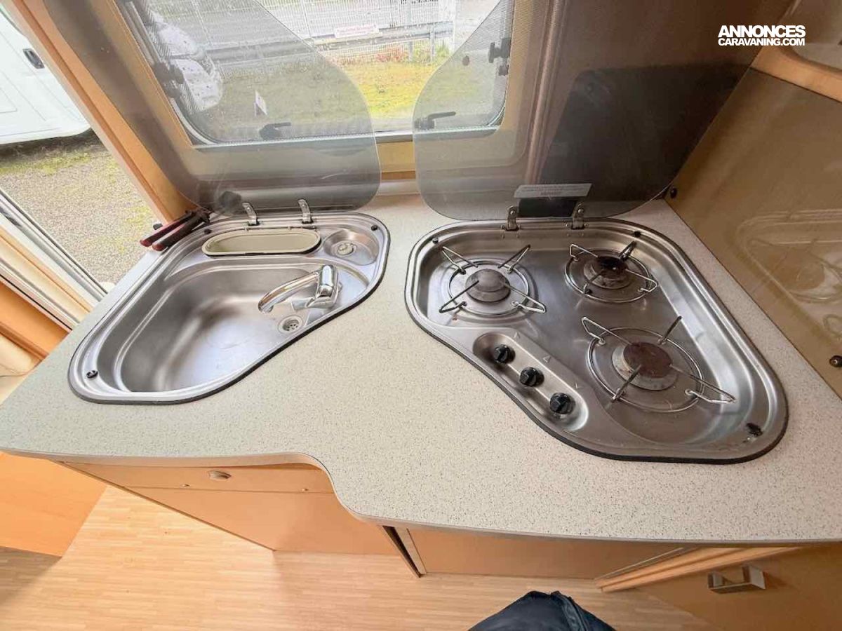 La cuisine présente de nombreux rangements, un réfrigérateur trimixte de 86 L, un réchaud 3 feux, un évier inoxydable et une hotte aspirante.