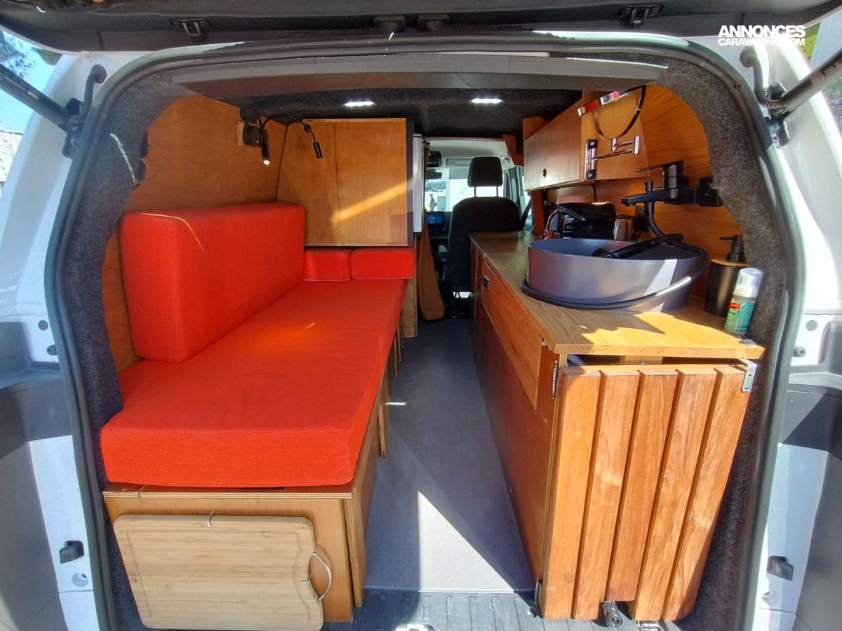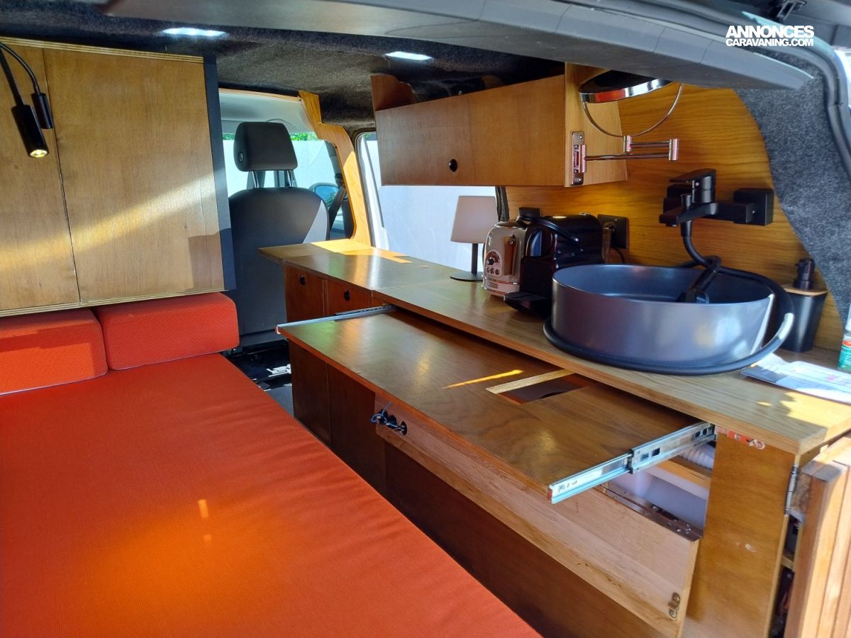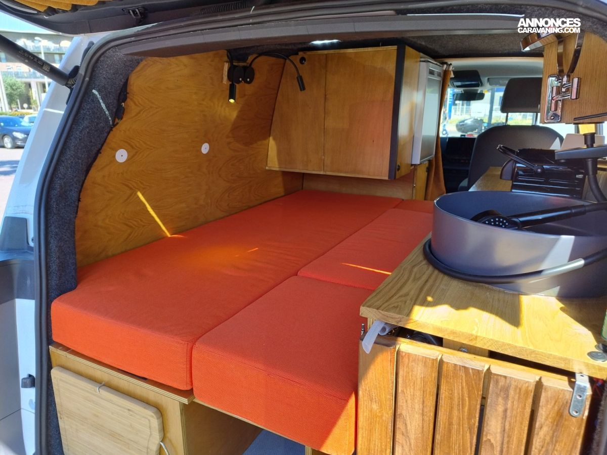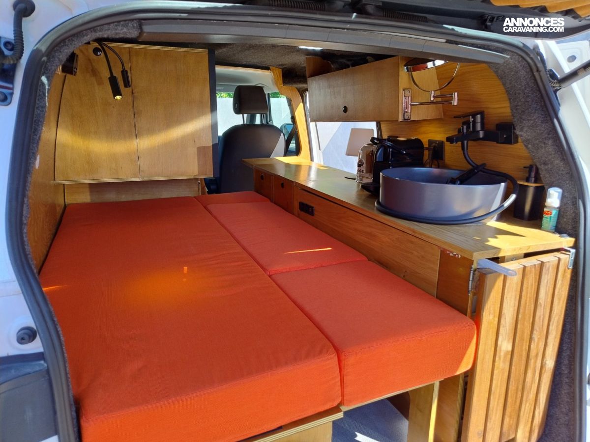 L’intérieur a été aménagé de manière fonctionnelle et chaleureuse, avec un lit peigne 2 couchages, une petite cuisine équipée comprenant un évier, un frigo à compression, machine à café et de très nombreux rangements. Son atout majeur ? Une isolation performante en liège projeté pour une utilisation confortable en toutes saisons !