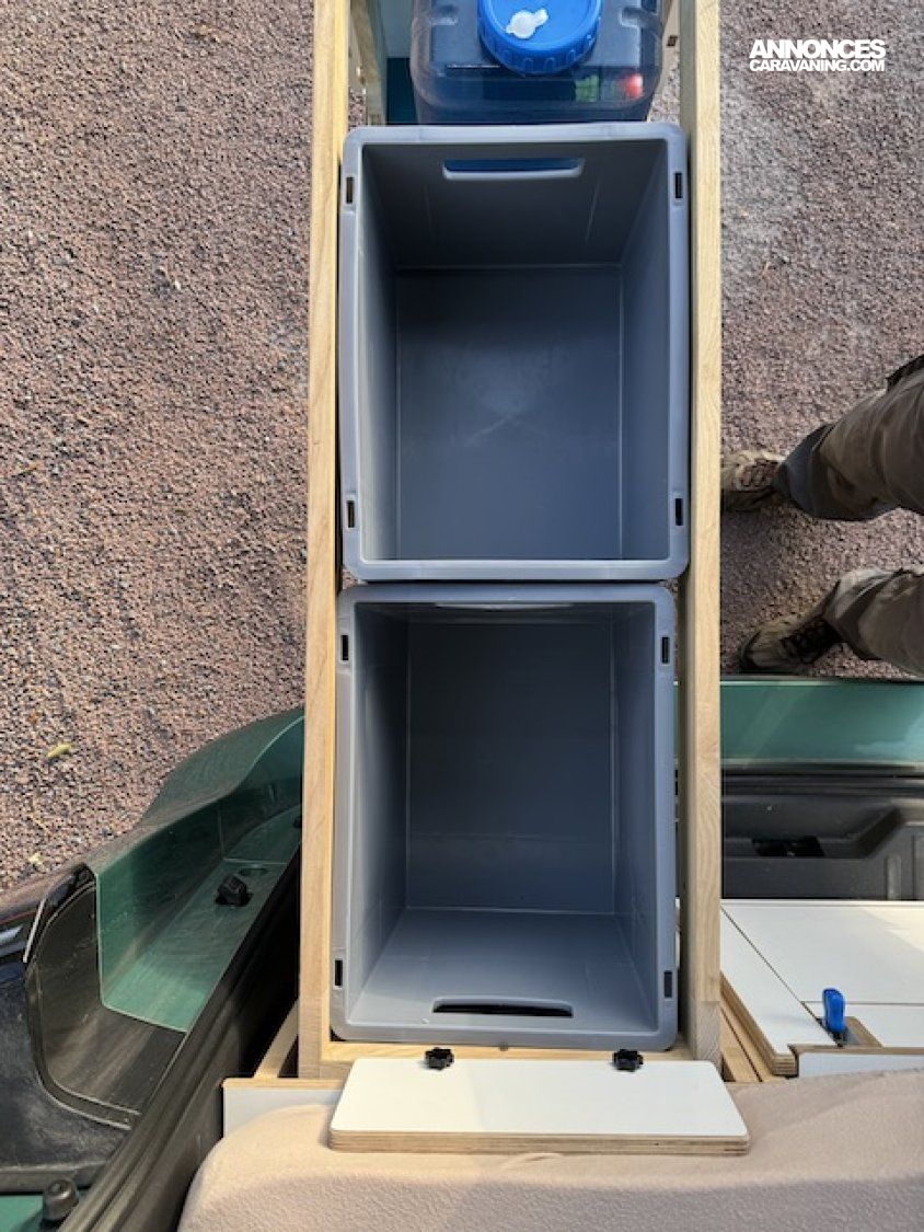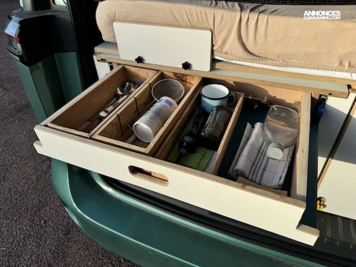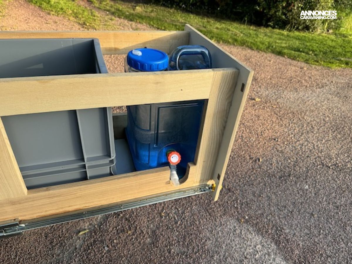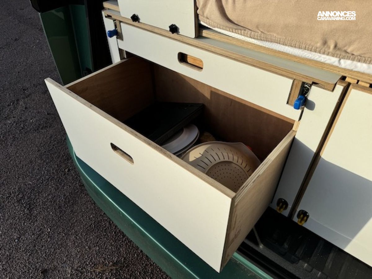 Le van est également équipé d'accessoires: douchette électrique, eau chaude, bac à douche extérieur, stores occultants.