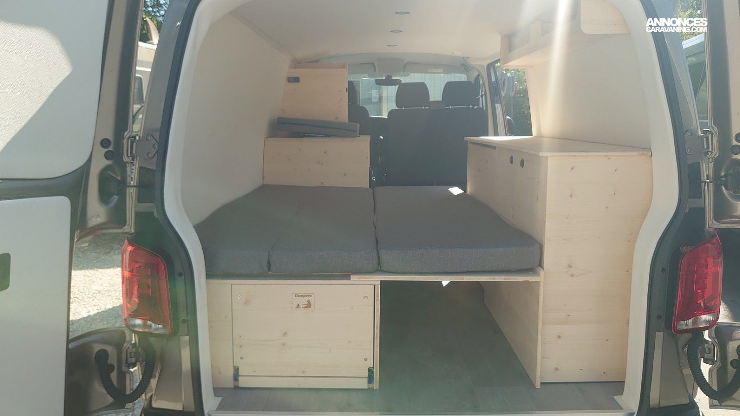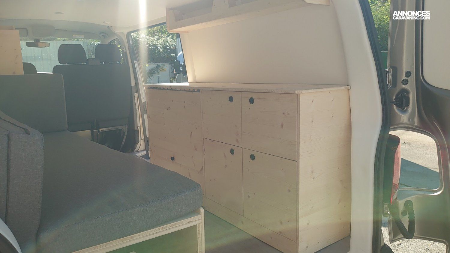 Aménagement robuste et pratique, nombreux rangements, lit de 120x180.