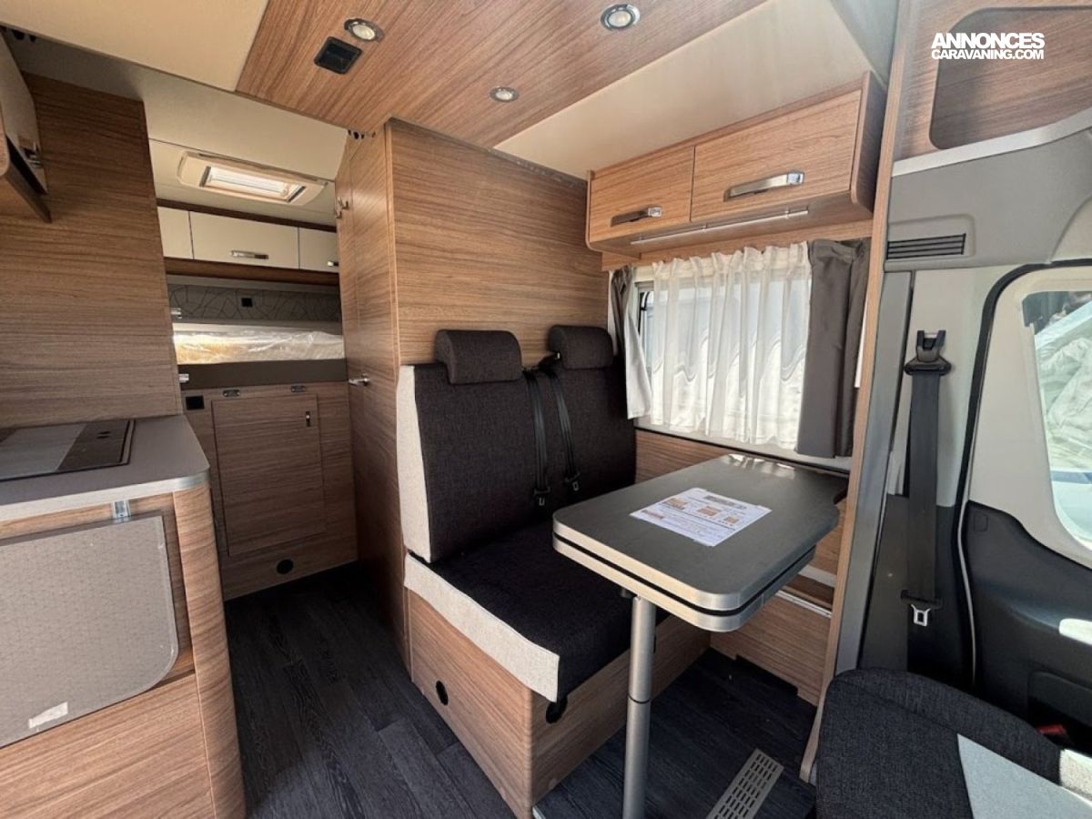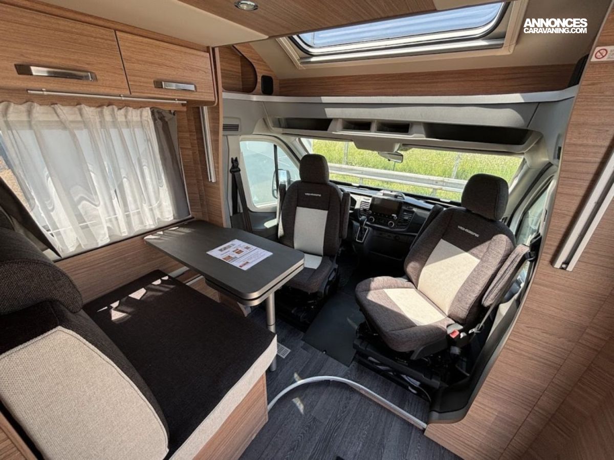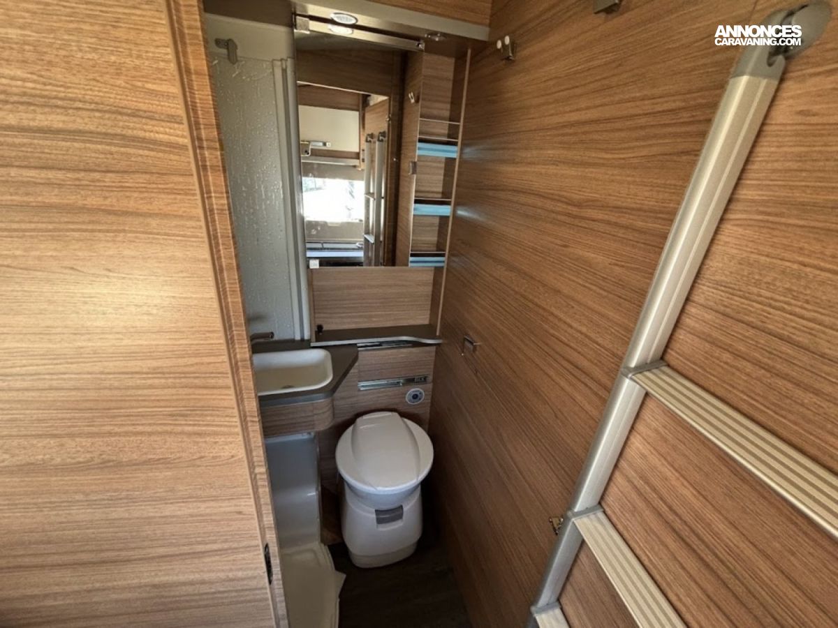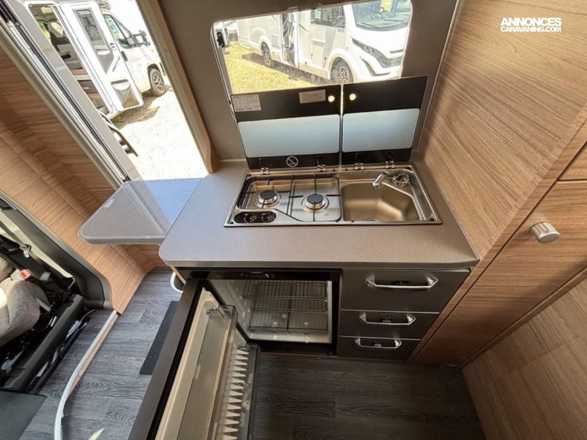 Cuisine en long, Douche à vario, Grande soute, Lit arrière transversal, Salon avant sièges pivotants, WC Cassette.