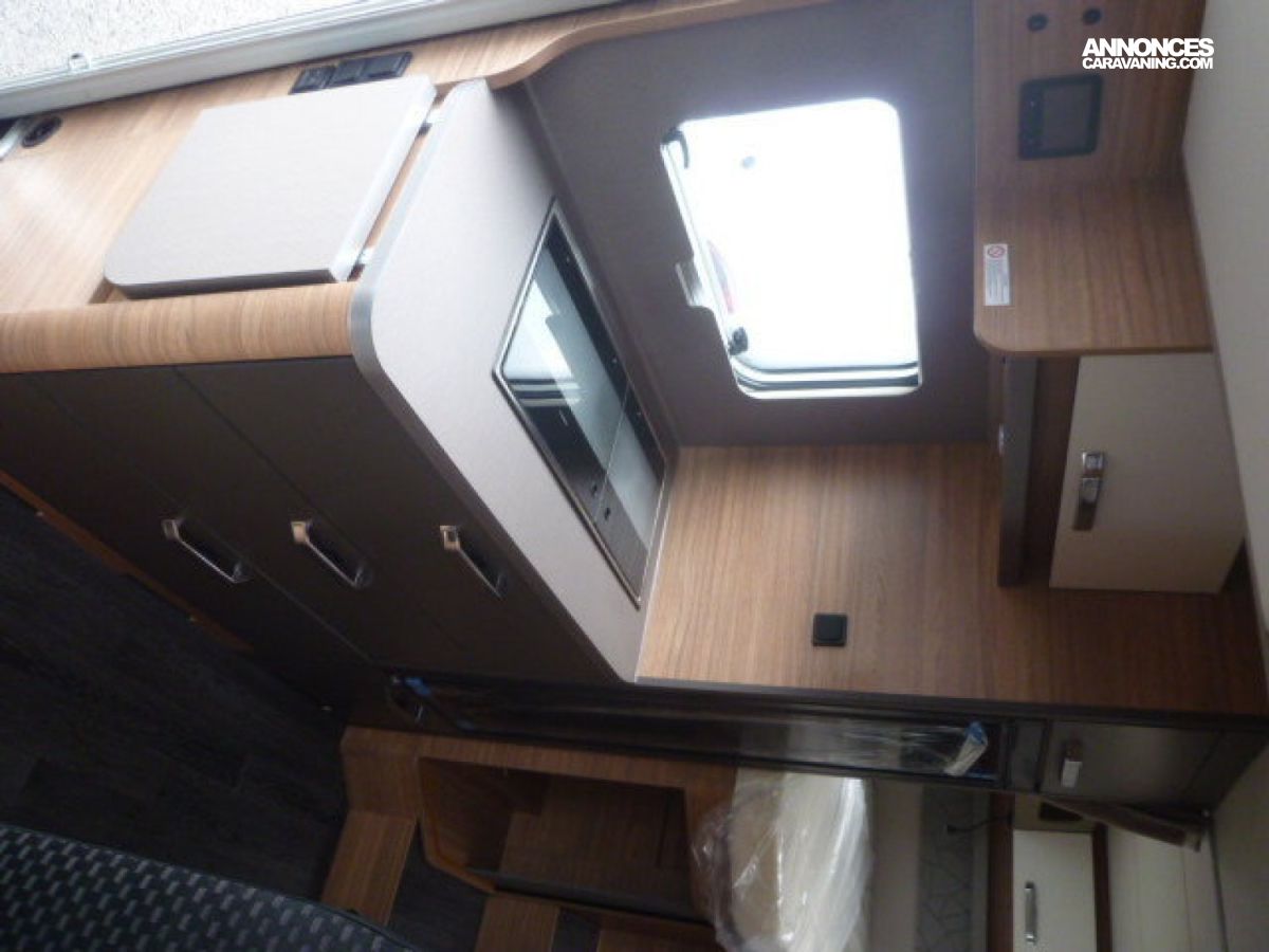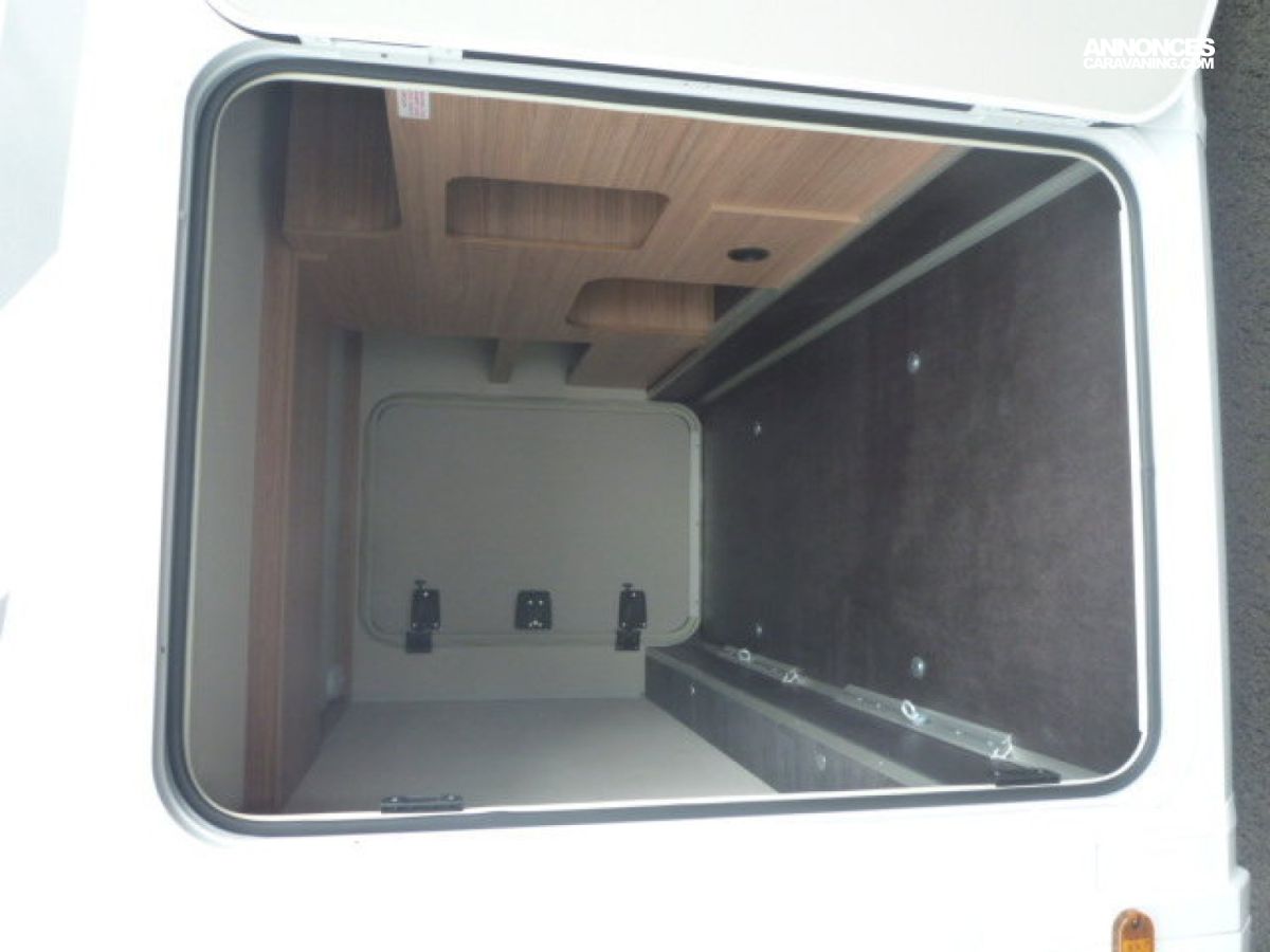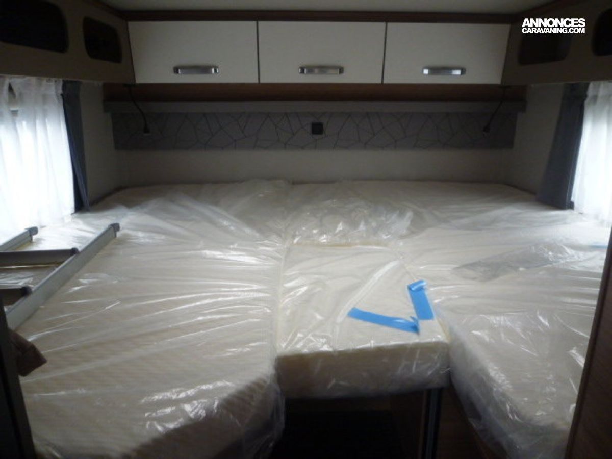 Bac de douche, Cuisine en long, lit jumeaux, lit pavillon, Salon avant sièges pivotants, Soute, WC Cassette.