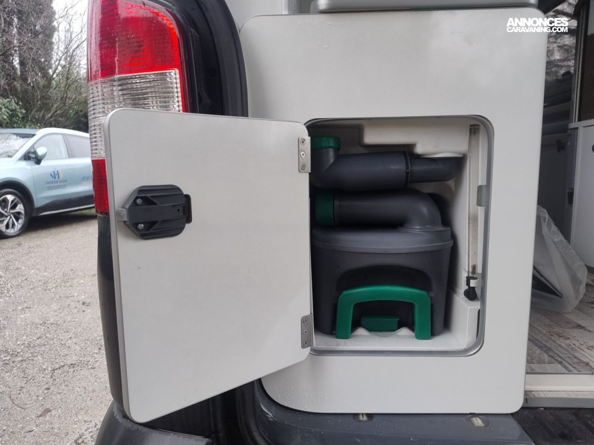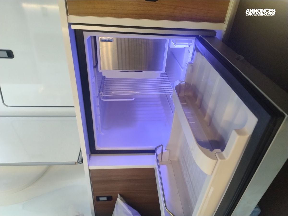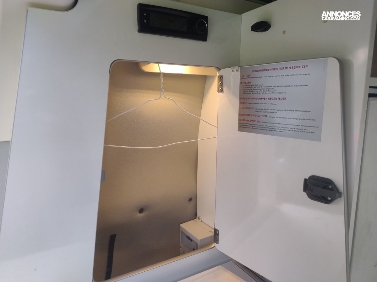 CHAUFFAGE CARBURANT, GAZINIERE 2 FEUX, DOUCHETTE EXTERIEURE, ECLAIRAGE LED, STORES PLISSES DE CABINE, VOLET ISOTHERME INTERIEUR, REFRIGERATEUR 12V A COMPRESSION