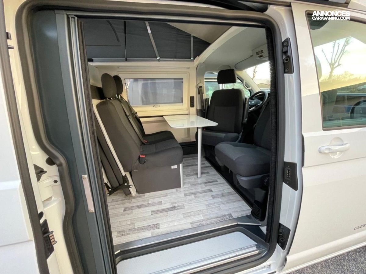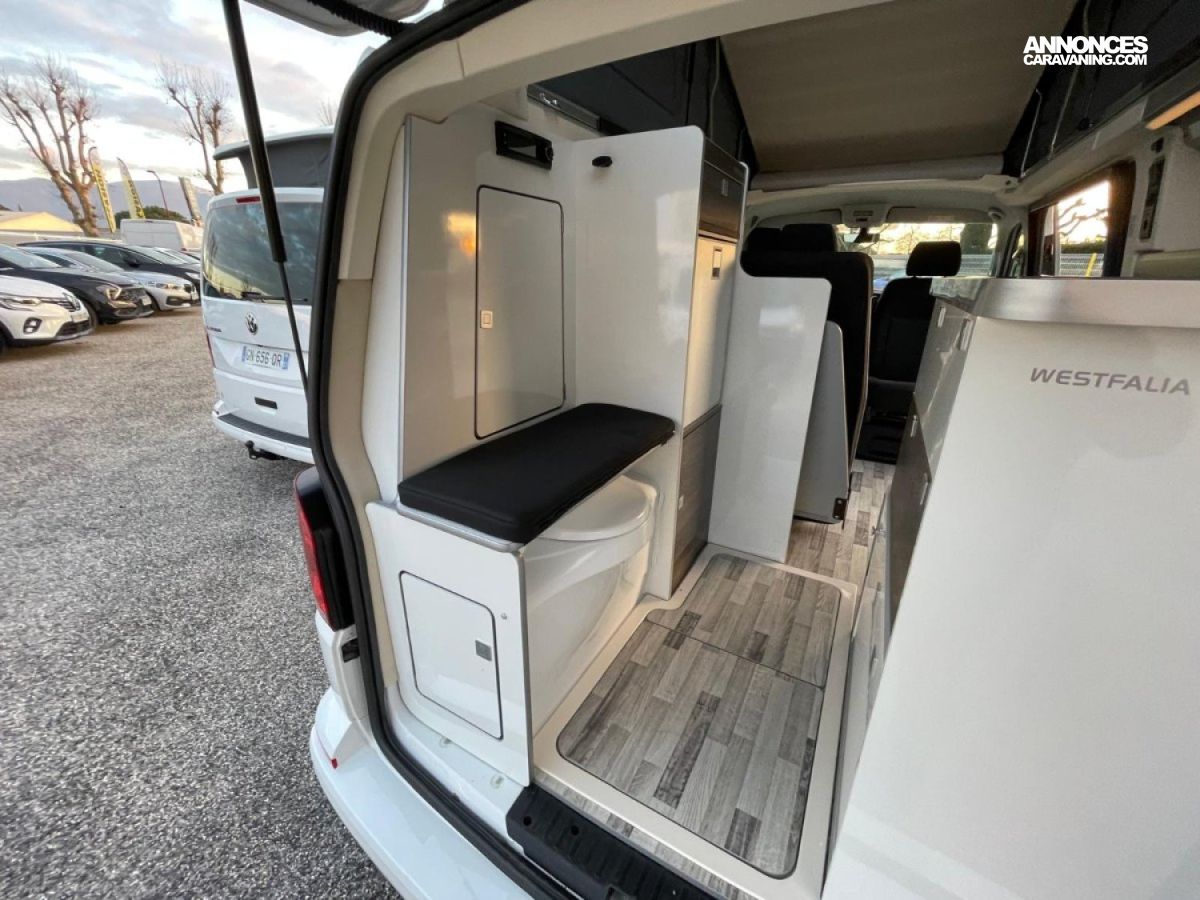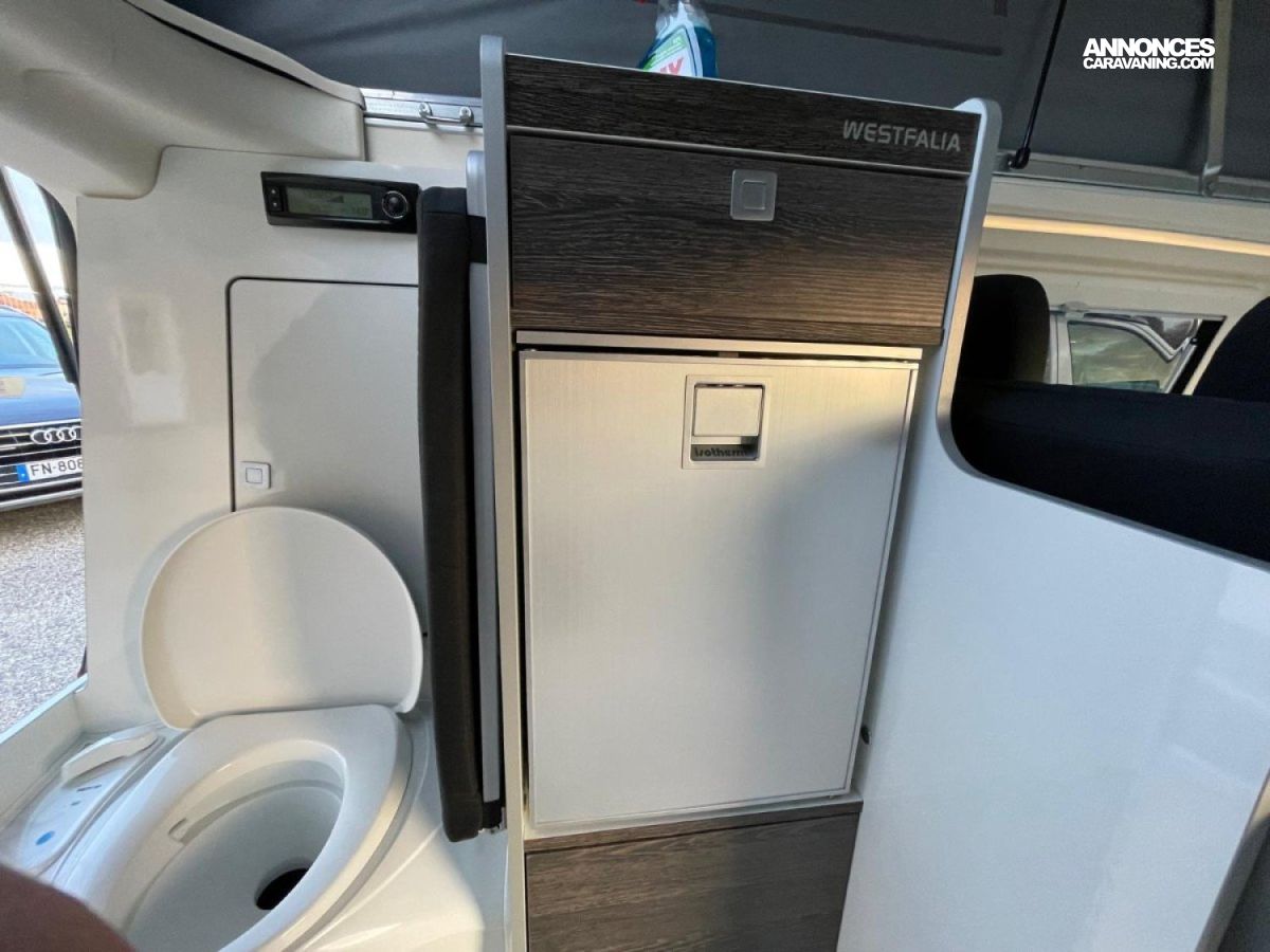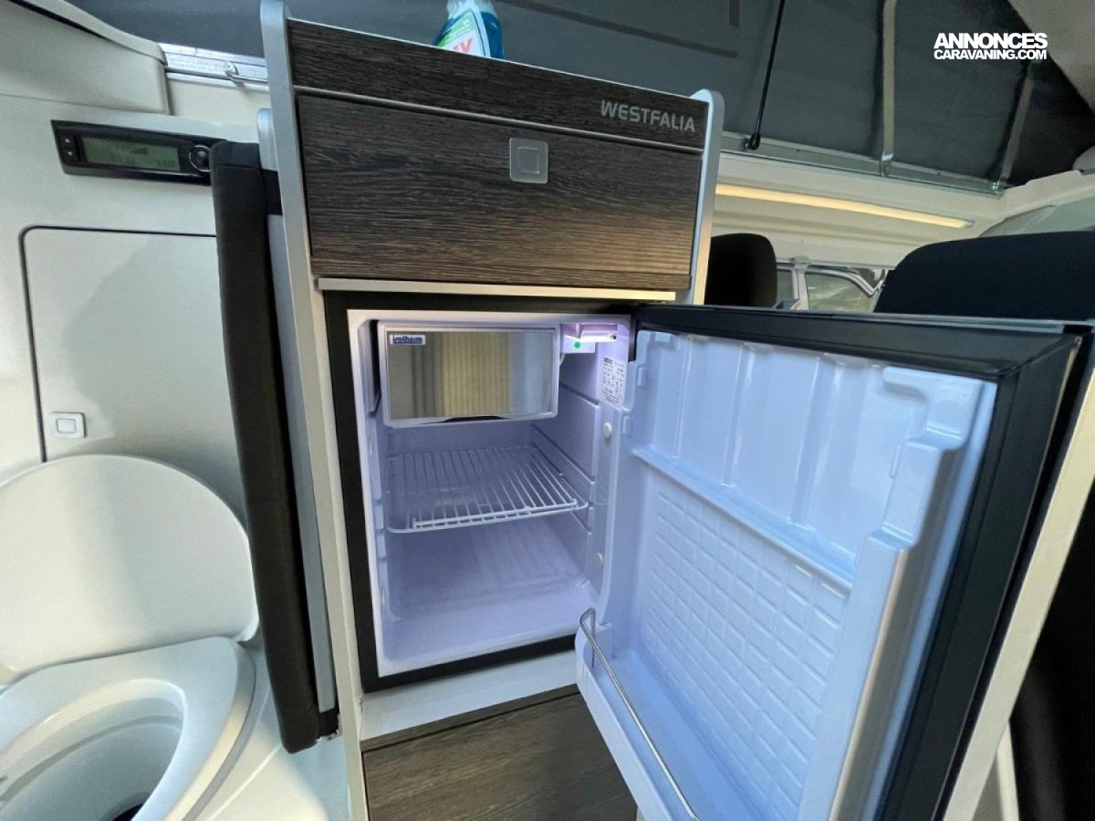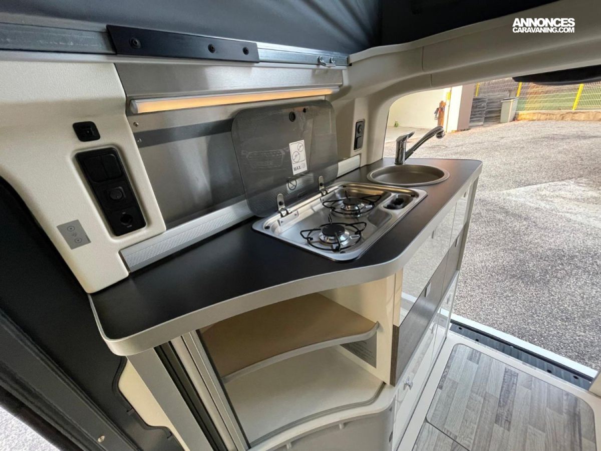 Il propose une implantation polyvalente avec toit relevable, offrant 4 places assises et 3 couchages •Dimensions couchages : Lit de toit (1.30 x 2.00 m), Lit de dînette (90 x 1.80 m) • Longueur du véhicule : 4,89 m • Hauteur du véhicule : 2,00 m • Largeur du véhicule : 1,90m• Coin cuisine tout équipé o Plaque de cuisson deux feux o Évier en inox avec mitigeur o De nombreux rangements pratiques o Réfrigérateur à compression de 49 L • Sanitaires autonomes o Véritable bac à douche avec caillebotis o WC à cassette extractible o Rideau de douche innovant à fixation magnétique • Espace de vie et nuit o Lit double confortable dans le toit relevable o Banquette transformable en couchage d'appoint o Spots LED pour une ambiance chaleureuse • Confort en toute saison o Chauffage Webasto de série pour vos escapades hivernales o Isolation thermique et acoustique signée Westfalia • Vie en extérieur o Auvent pour vous abriter du soleil o Moustiquaire de porte coulissante o Pack extérieur avec deux chaises et un support pour utiliser la table du salon dehors • Conduite sereine avec le régulateur de vitesse o Manœuvres facilitées par l'aide au stationnement avant/arrière et la caméra de recul o Visibilité optimale grâce à l'allumage automatique des feux de route (Light Assist) et aux projecteurs LED o Confort et multimédia o Sièges avant chauffants et pivotants pour transformer l'espace de vie o Système de navigation "Discover Media" avec écran tactile 8 pouces, compatible Apple CarPlay et Android Auto sans fil • jantes en alliage de 17 pouces.