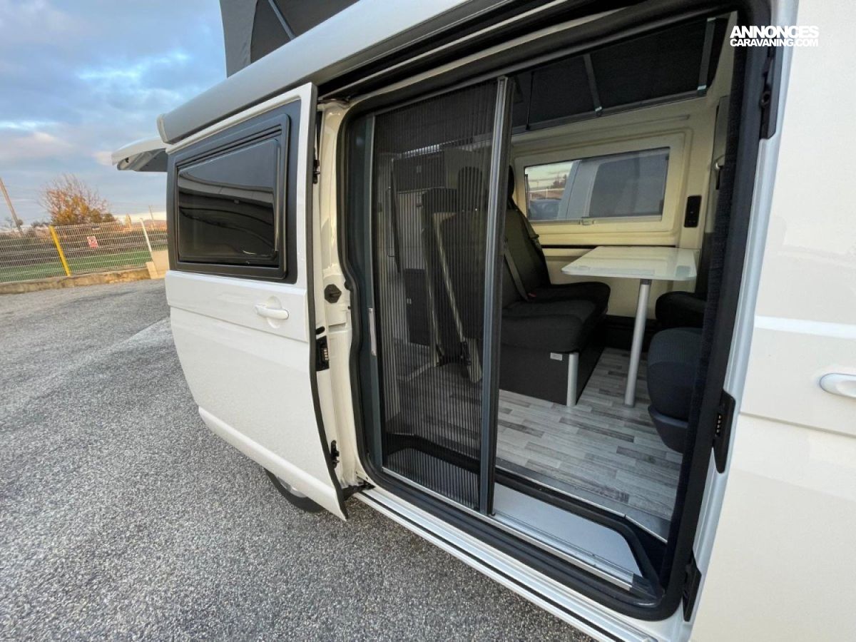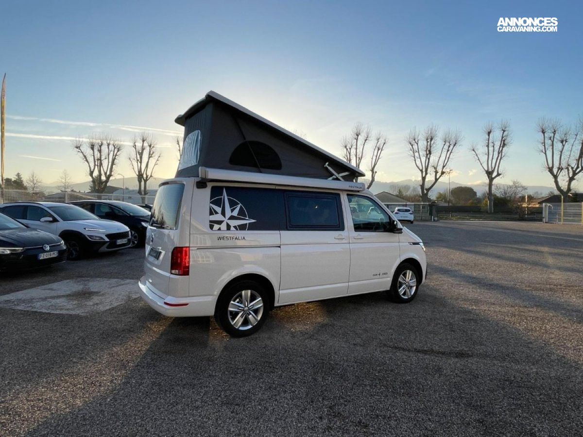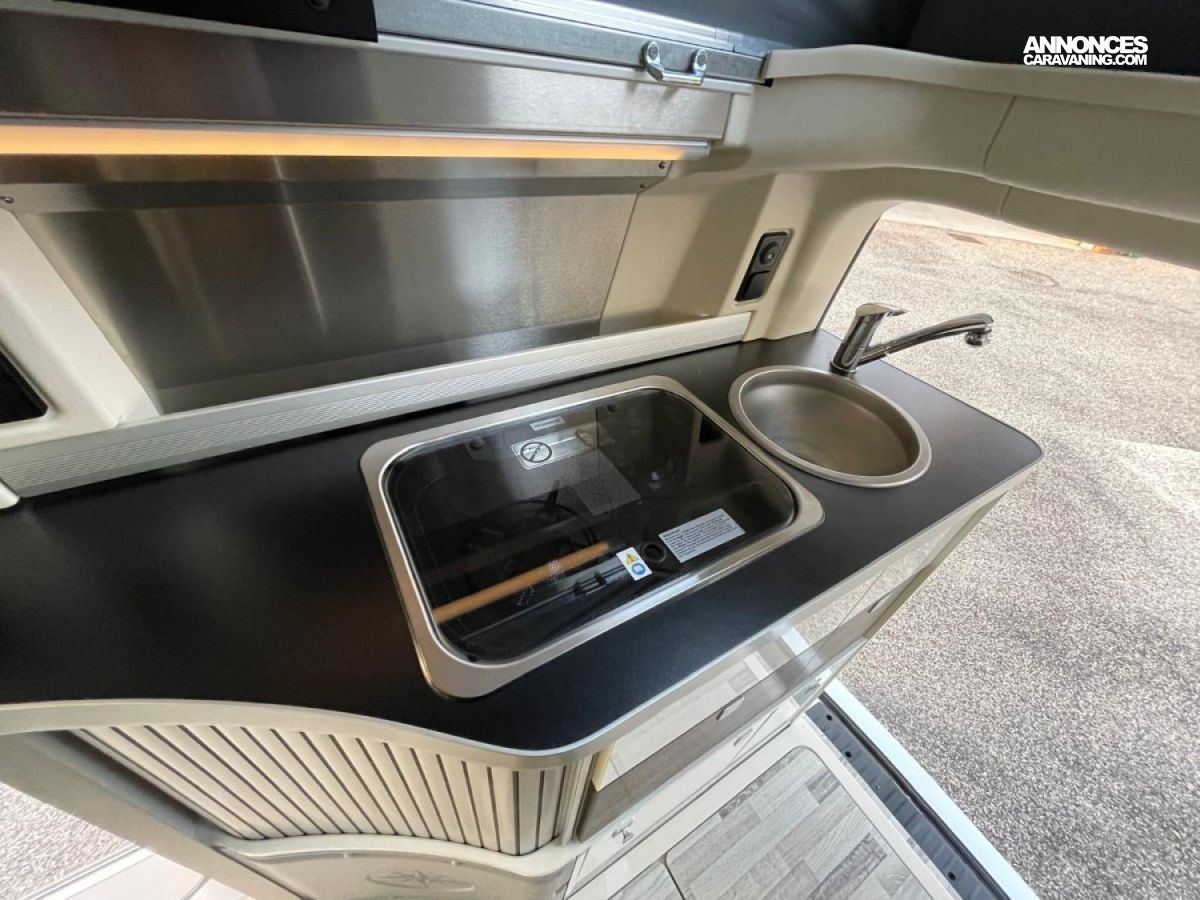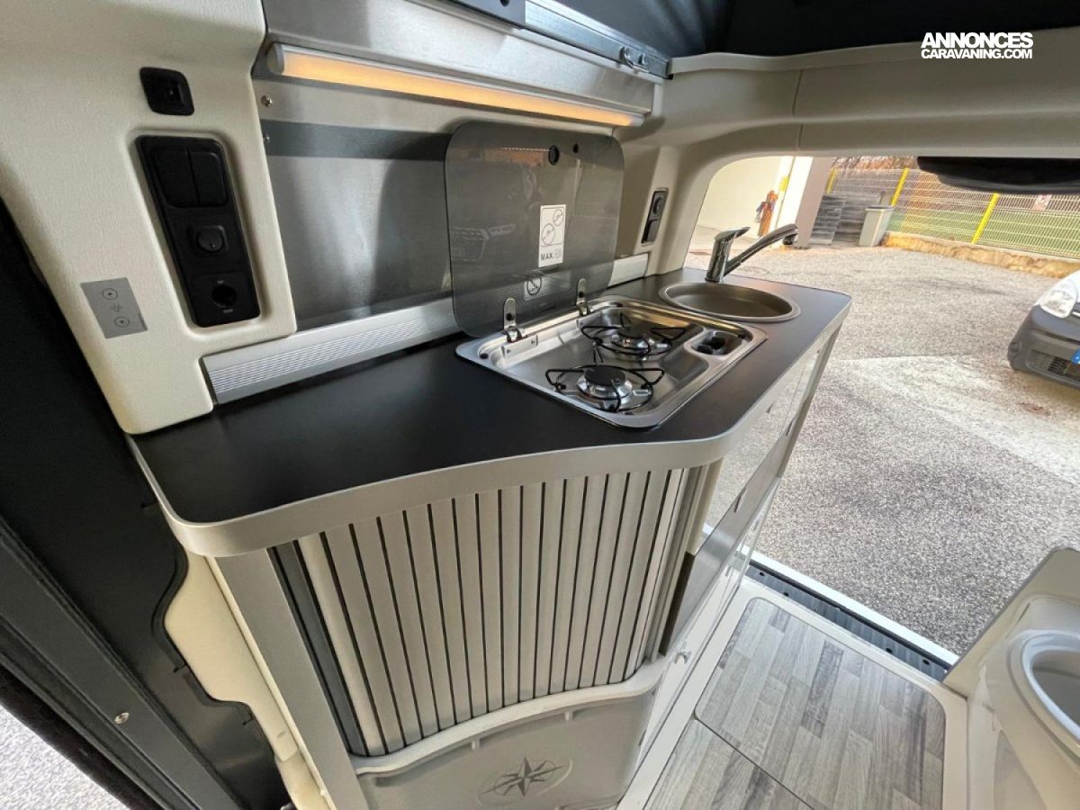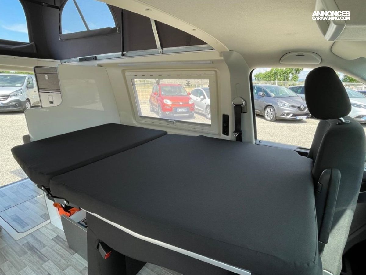 Il propose une implantation polyvalente avec toit relevable, offrant 4 places assises et 3 couchages •Dimensions couchages : Lit de toit (1.30 x 2.00 m), Lit de dînette (90 x 1.80 m) • Longueur du véhicule : 4,89 m • Hauteur du véhicule : 2,00 m • Largeur du véhicule : 1,90m• Coin cuisine tout équipé o Plaque de cuisson deux feux o Évier en inox avec mitigeur o De nombreux rangements pratiques o Réfrigérateur à compression de 49 L • Sanitaires autonomes o Véritable bac à douche avec caillebotis o WC à cassette extractible o Rideau de douche innovant à fixation magnétique • Espace de vie et nuit o Lit double confortable dans le toit relevable o Banquette transformable en couchage d'appoint o Spots LED pour une ambiance chaleureuse • Confort en toute saison o Chauffage Webasto de série pour vos escapades hivernales o Isolation thermique et acoustique signée Westfalia • Vie en extérieur o Auvent pour vous abriter du soleil o Moustiquaire de porte coulissante o Pack extérieur avec deux chaises et un support pour utiliser la table du salon dehors • Conduite sereine avec le régulateur de vitesse o Manœuvres facilitées par l'aide au stationnement avant/arrière et la caméra de recul o Visibilité optimale grâce à l'allumage automatique des feux de route (Light Assist) et aux projecteurs LED o Confort et multimédia o Sièges avant chauffants et pivotants pour transformer l'espace de vie o Système de navigation "Discover Media" avec écran tactile 8 pouces, compatible Apple CarPlay et Android Auto sans fil • jantes en alliage de 17 pouces.