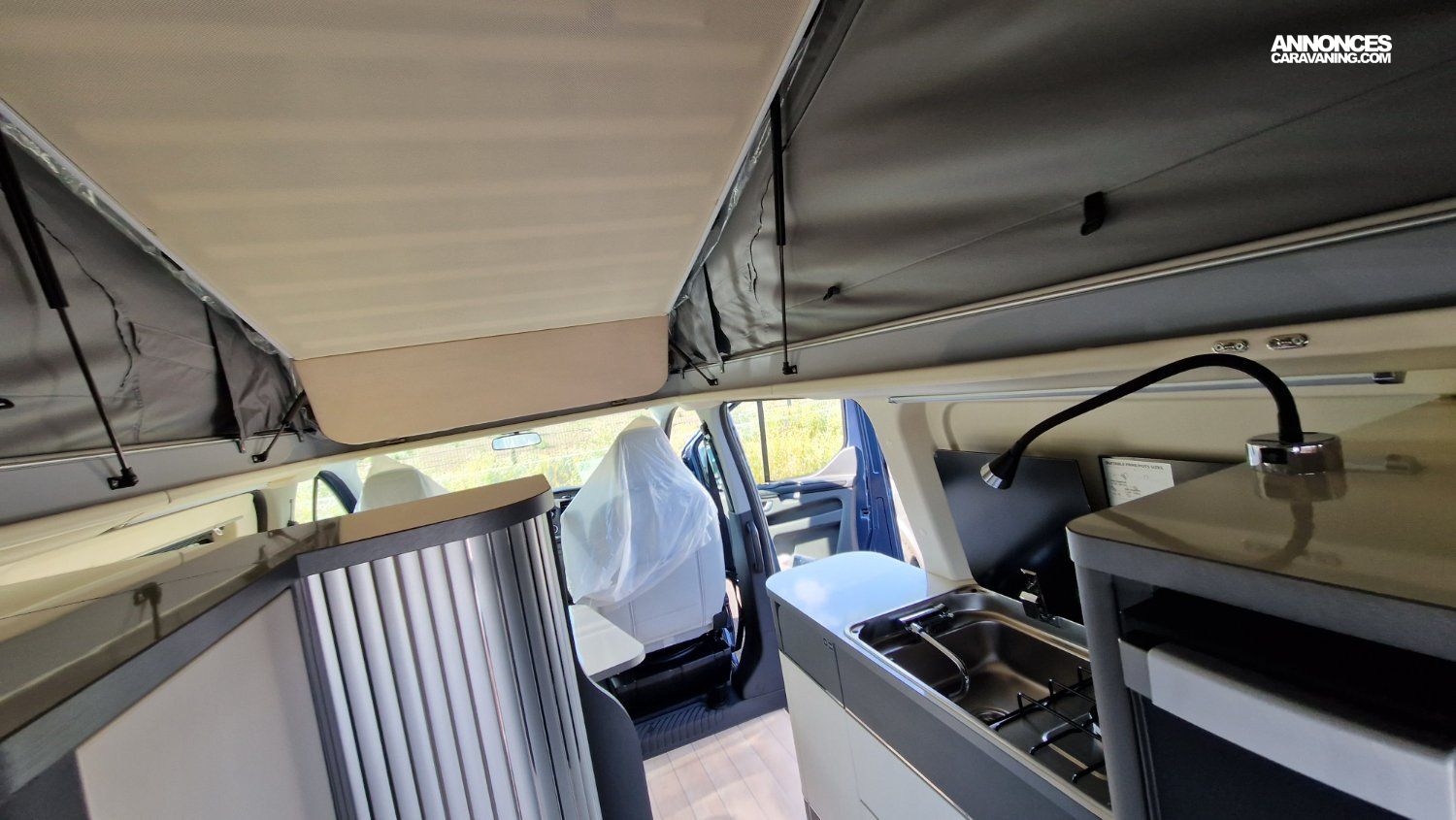 WESTFALIA FORD KELSEY AYANT LA MEME CONFIGURATION QUE LE KEPLER ONE VOLKSWAGEN , de plus grands volumes mais il conserve la douche et les toilettes.