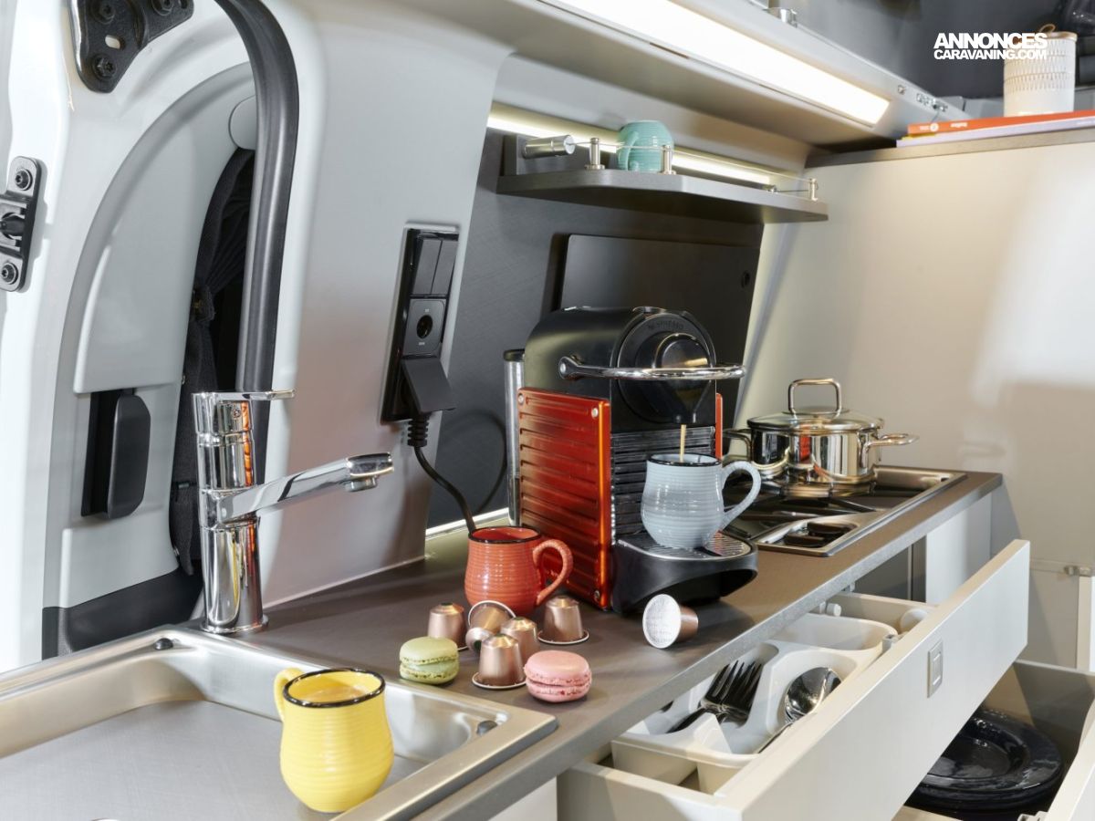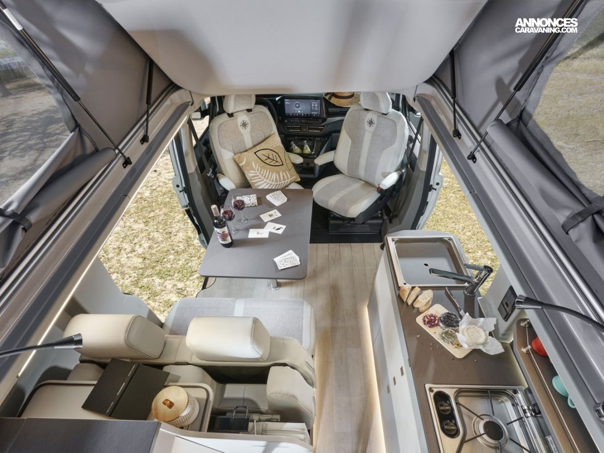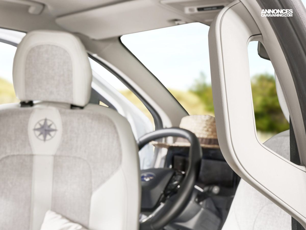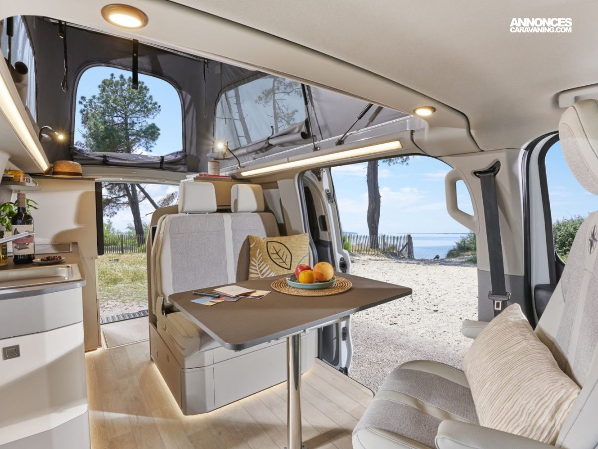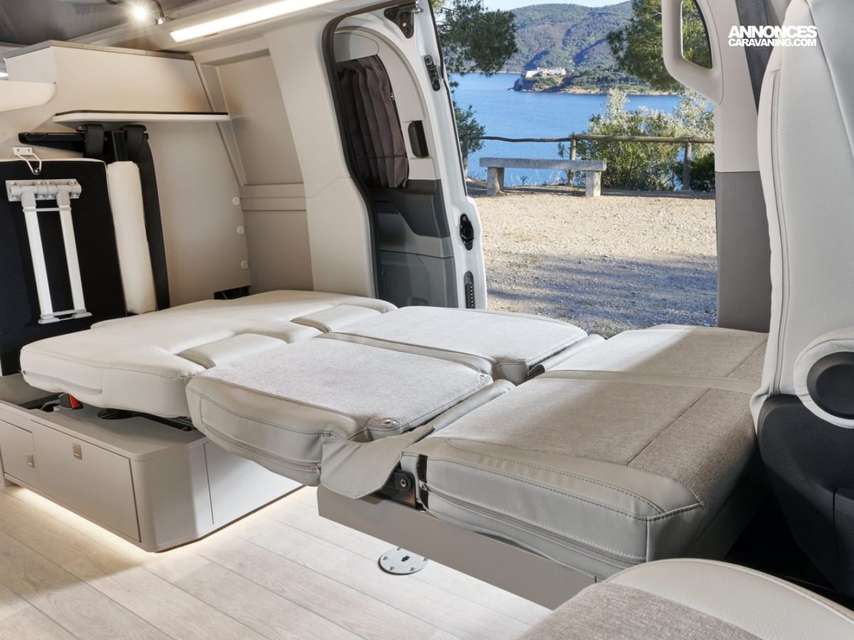 Banquette électrique type BZ, batterie cellule 92 ah AGM, chauffe eau pour évier et douche, Kit outdoor (étui avec 2 sièges de camping et intégration dans le hayon arrière de la table avec 4 pieds ajustables), portes latérales coulissantes droite et gauche, pré-disposition électrique panneau solaire et attelage, rideaux arrière latéraux opacifiants, sellerie bi-matière Missouri, tapis de cabine, variateur d’intensité lumineuse LED