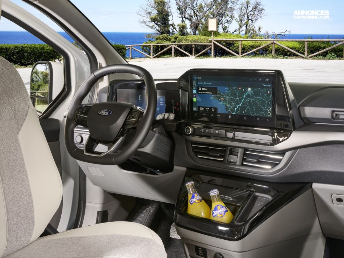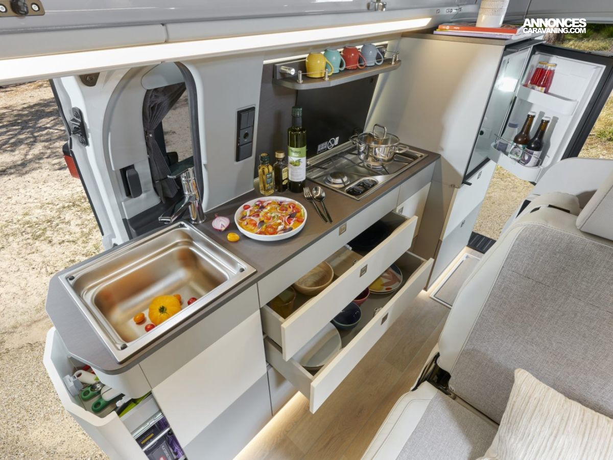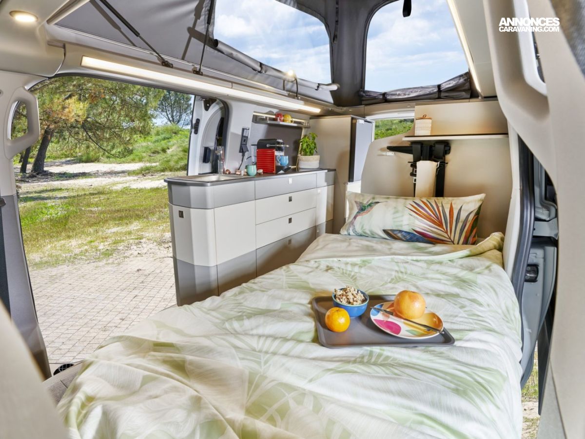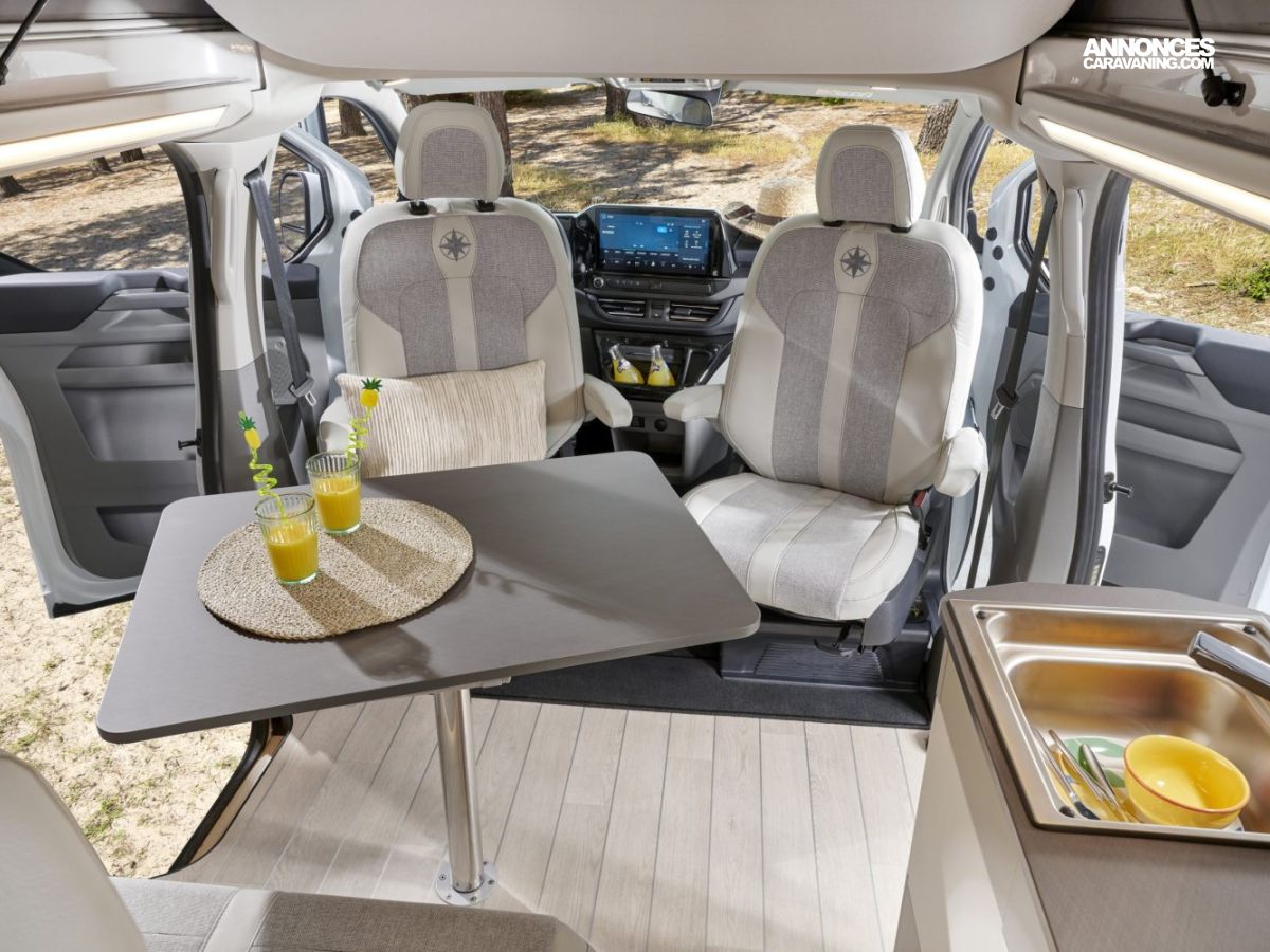 Banquette électrique type BZ, batterie cellule 92 ah AGM, chauffe eau pour évier et douche, Kit outdoor (étui avec 2 sièges de camping et intégration dans le hayon arrière de la table avec 4 pieds ajustables), portes latérales coulissantes droite et gauche, pré-disposition électrique panneau solaire et attelage, rideaux arrière latéraux opacifiants, sellerie bi-matière Missouri, tapis de cabine, variateur d’intensité lumineuse LED