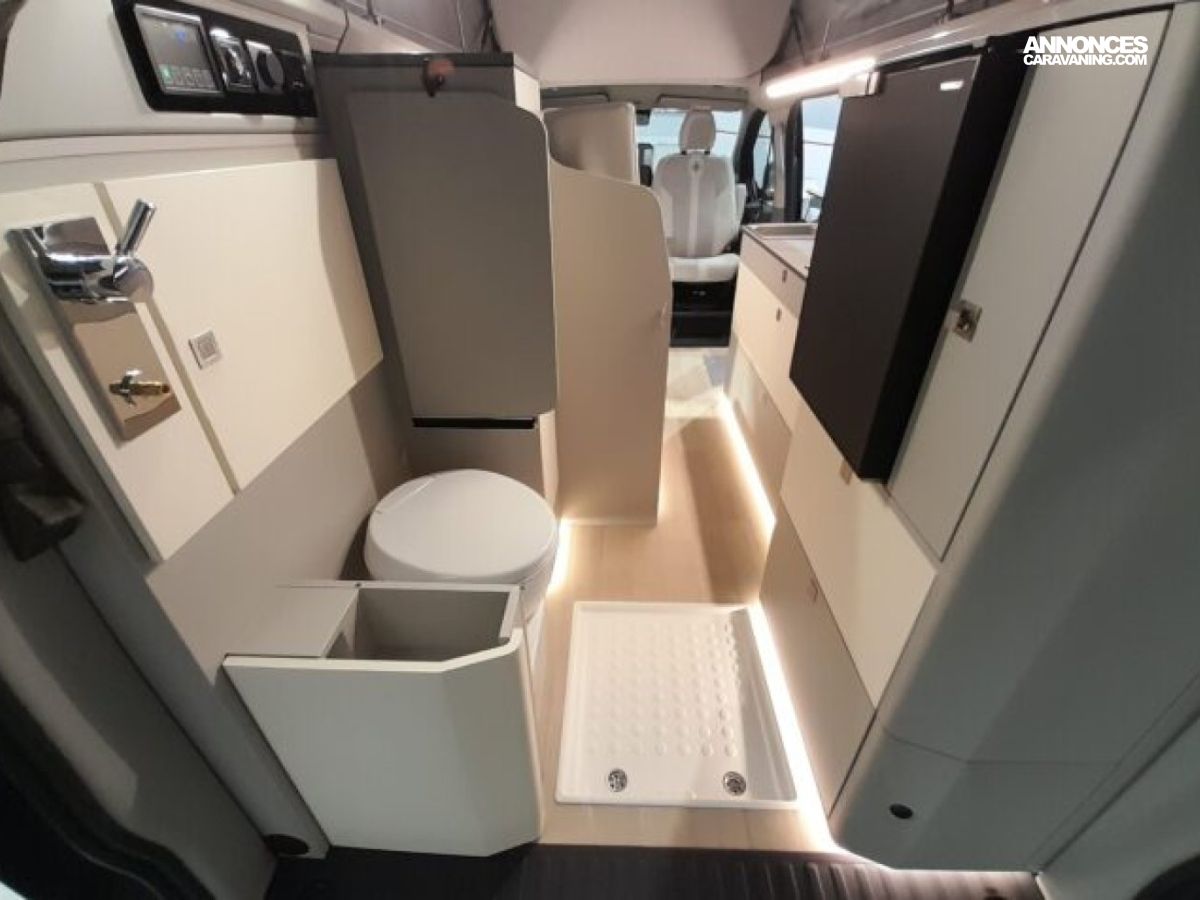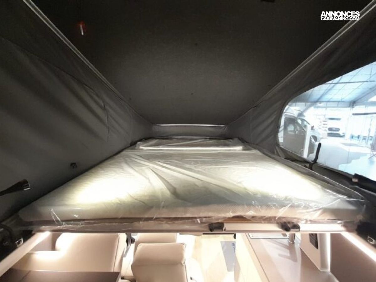 Pack Kelsey (Soit : Batterie cellule AGM 92 Ah, chauffe-eau pour douche et évier, échelle de lit, kit outdoor (tables + 2 chaises de camping), portes latérales coulissantes droite et gauche, pré-disposition électrique panneau solaire, pré-disposition électrique attelage, rideaux arrière latéraux opacifiants, sellerie bi-matière « Missouri », tapis de cabine, variateur d’intensité lumineuse LED)