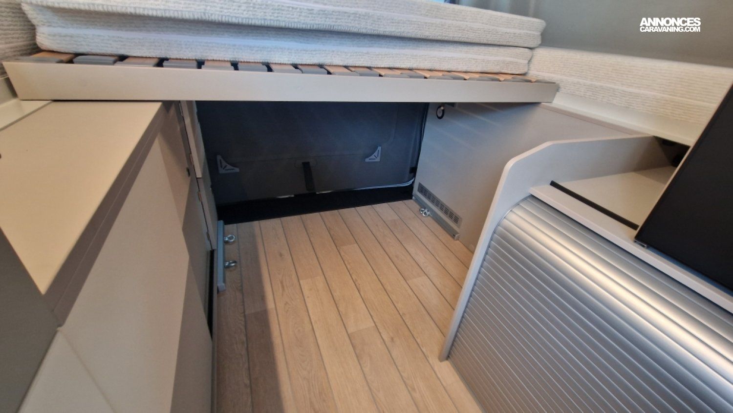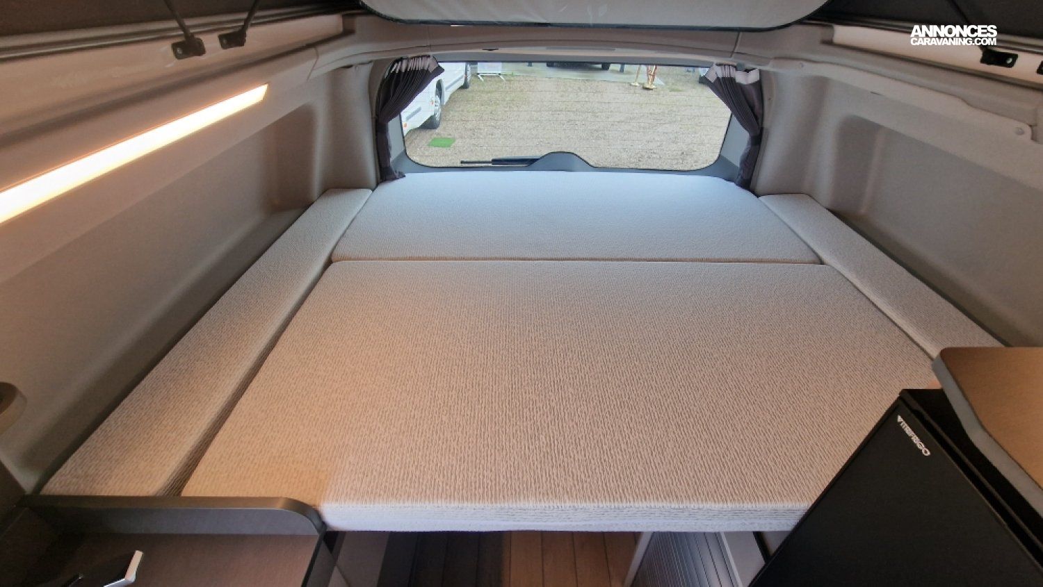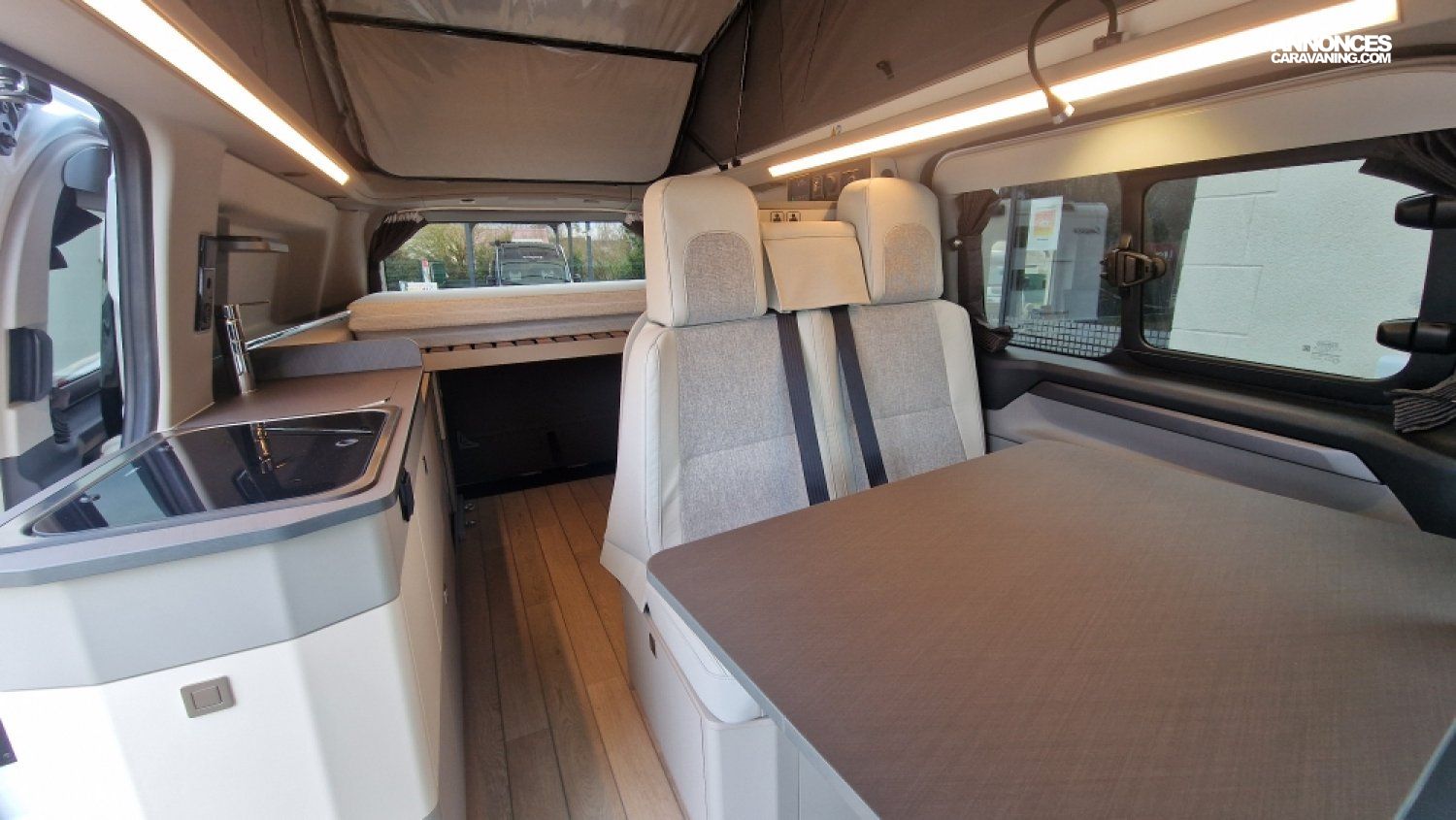 Batterie cellule AGM 92Ah, Chauffe-eau pour douche et évier, Echelle de lit, Kit outdoor (étui avec 2 fauteuils de camping et intégration sur le hayon arrière de la table avec 4 pieds ajustables), Portes latérales coulissantes droite et gauche, Pré-disposition électrique panneau solaire & attelage, Rails latéraux soute avec crochet d'arrimage, Rideaux arrière / latéraux opacifiants, Sellerie bi-matière "Missouri", Variateur d'Intensité lumineuse LED