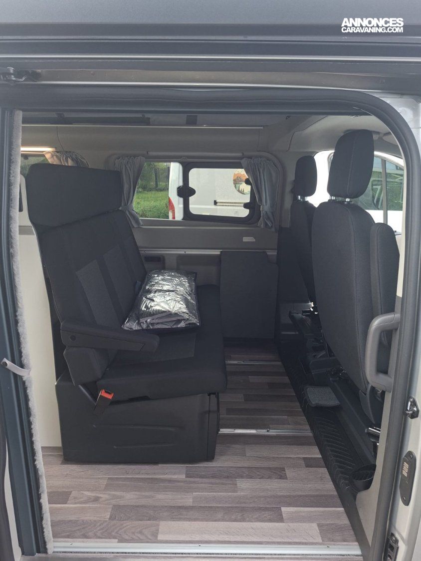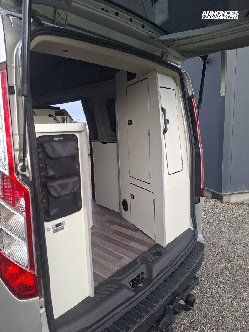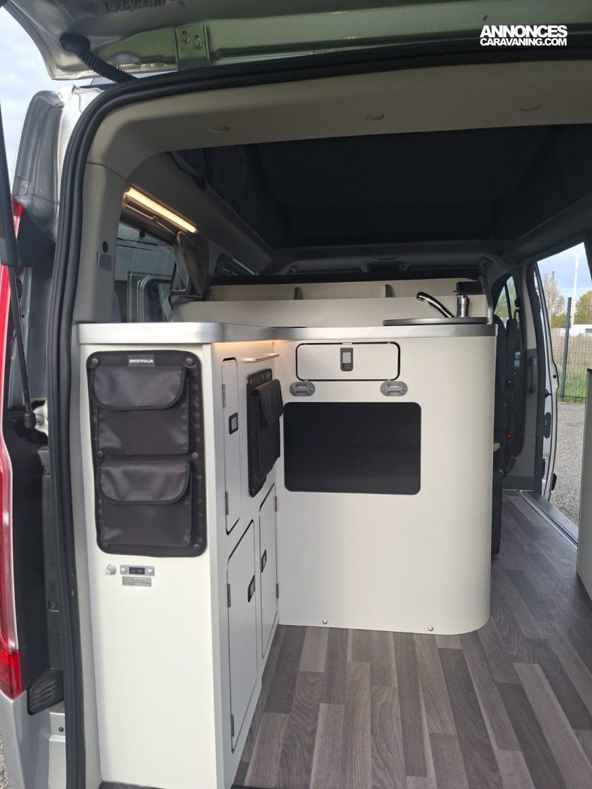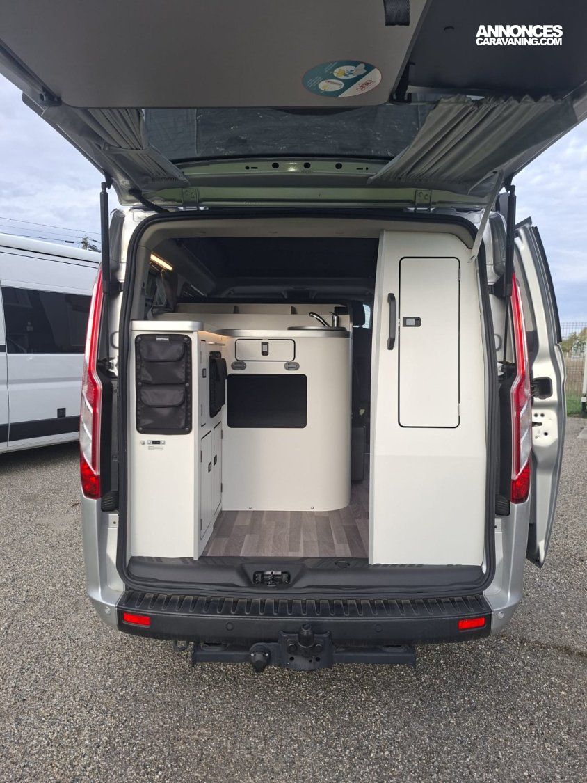 Van à toit relevable en très bon état sur Transit Custom 130 cv Boite automatique avec cuisine en L arrière équipée d'un frigo à compression et d'une plaque de cuisson 2 feux, et salon avant avec sièges pivotants.