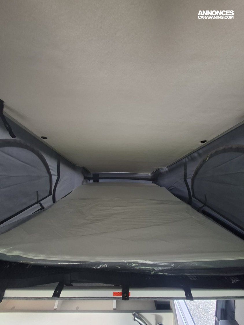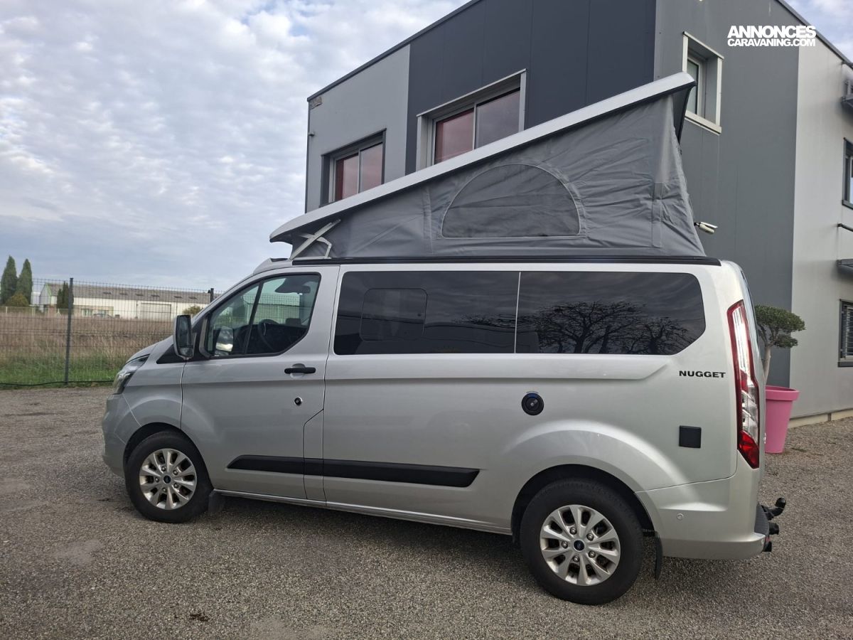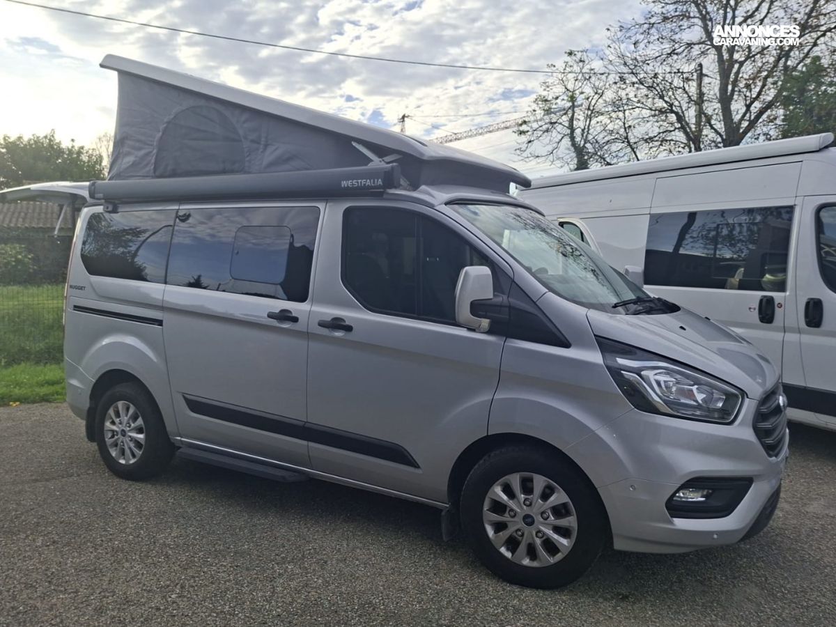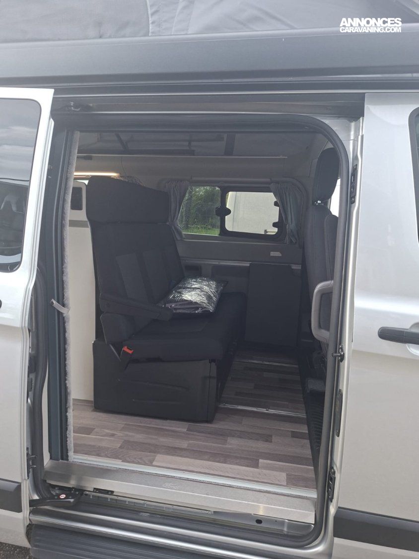 Van à toit relevable en très bon état sur Transit Custom 130 cv Boite automatique avec cuisine en L arrière équipée d'un frigo à compression et d'une plaque de cuisson 2 feux, et salon avant avec sièges pivotants.