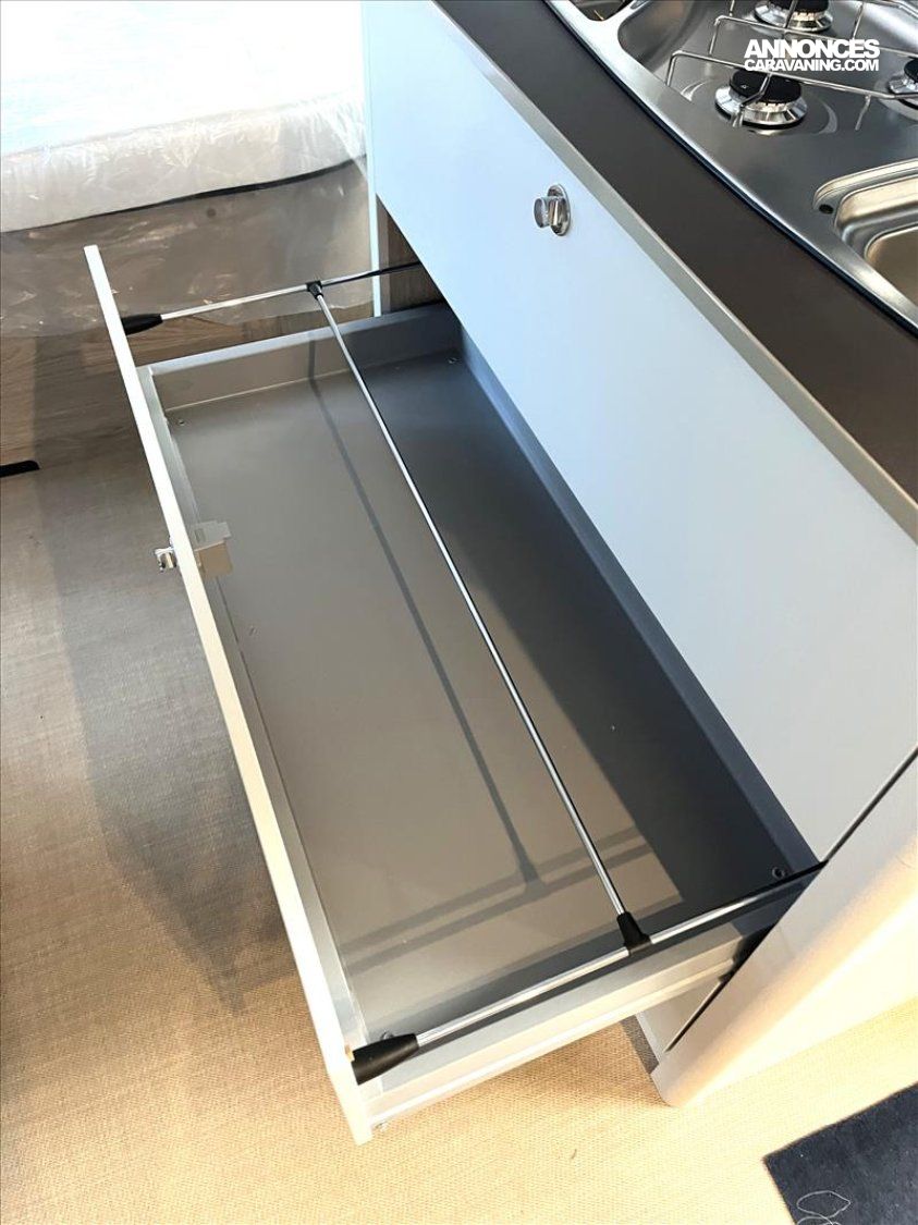 Verins de stabilisation, WC cassette, Porte d'entrée cellule monobloc, Poubelle intégrée à la porte d'entrée, Stabilisateur, Support de roue de secours, Tiroirs de cuisine à rappel automatique, Baies double vitrage ouvrante teintées avec store, Chassis en acier galvanisé ultre-léger, Chauffage S 3004, Détecteur de fumées, Eclairage d'auvent à LED, Evier, cuisinière à gaz 3 feux, Flexible de douche, Isolation du passage de roue