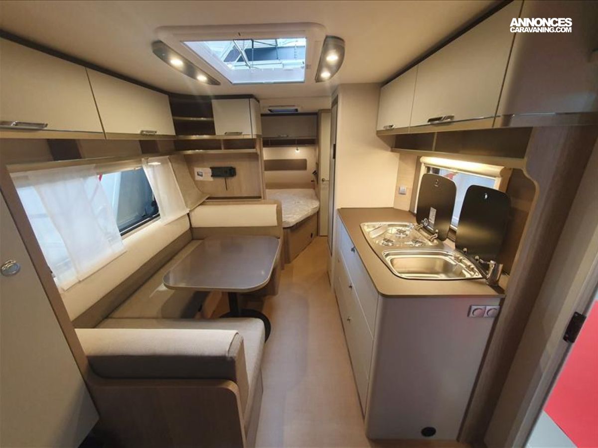 Tiroir de cuisine à rappel automatique, Porte d'entrée monobloc, Stabilisteur, Support de roue de secours dans le coffre à gaz, Poubelle intégrée à la porte d'entrée, Flexible de douche, Isolation du passage de roue, Chassis en acier galvanisé ultra-léger, Chauffage S 5004, Transformateur 350 VA, Vérins de stabilisation, WC cassette, Évier, cuisinière à gaz 3 feux avec allumage électrique, Détecteur de fumée, Eclairage LED 12v / 230 V, Eclairage d'auvent à LED, Baie double vitrage ouvrantes teintées avec store