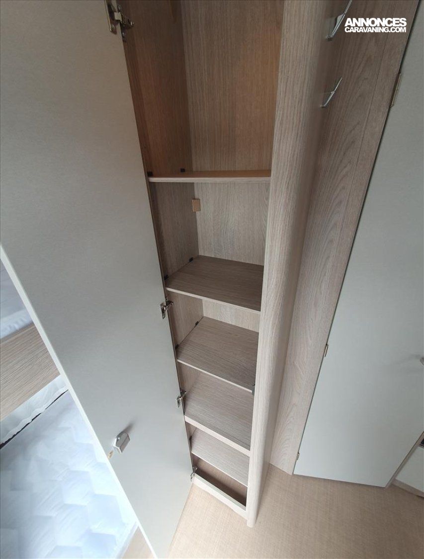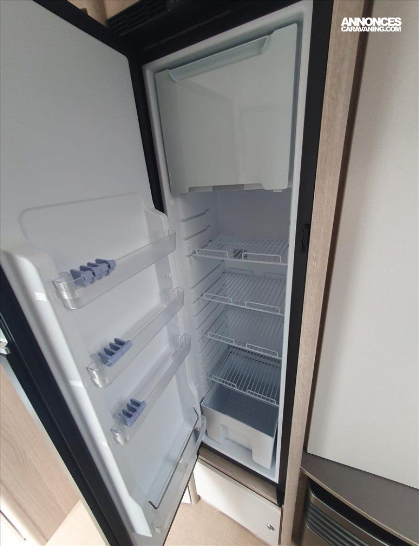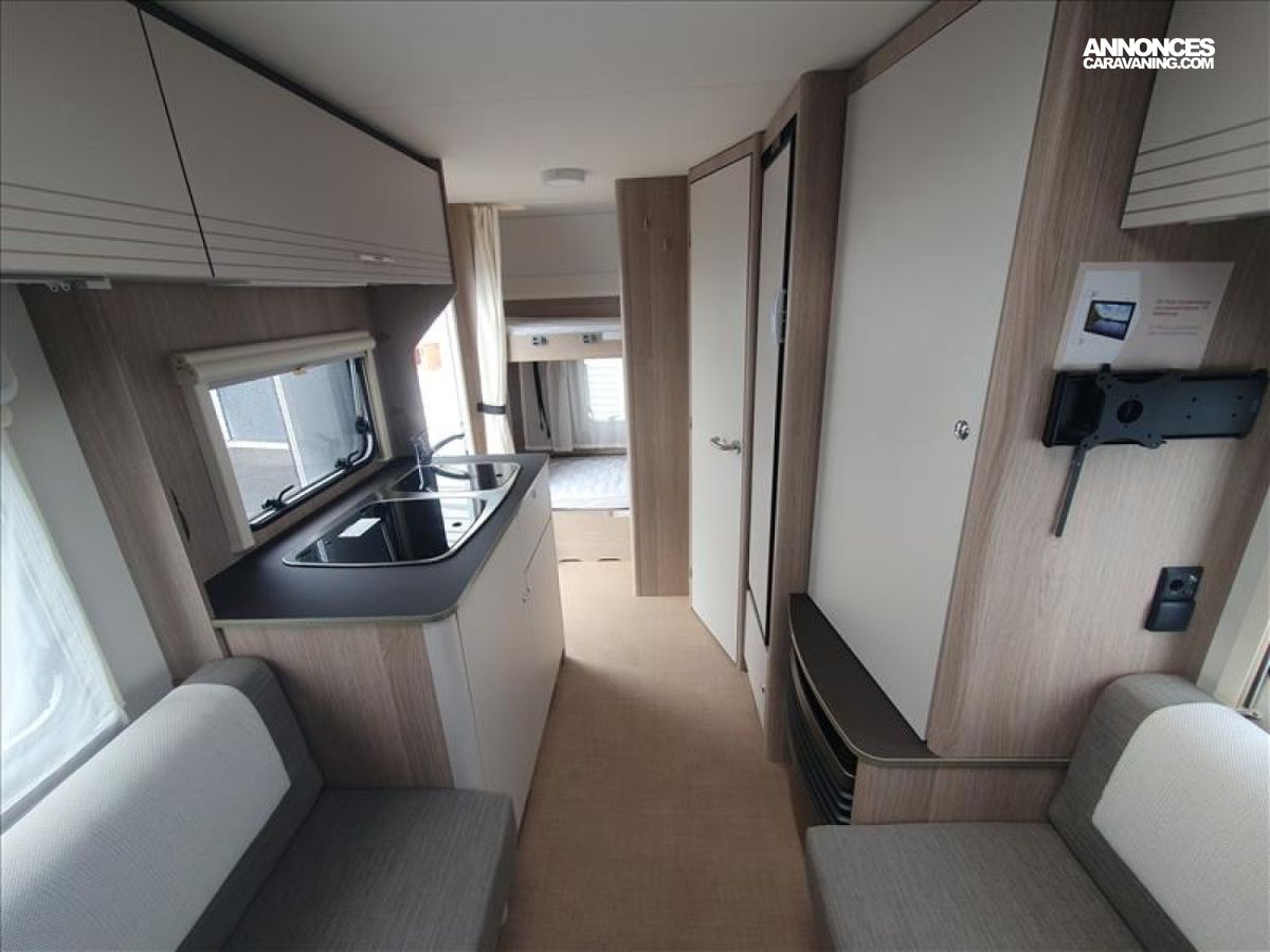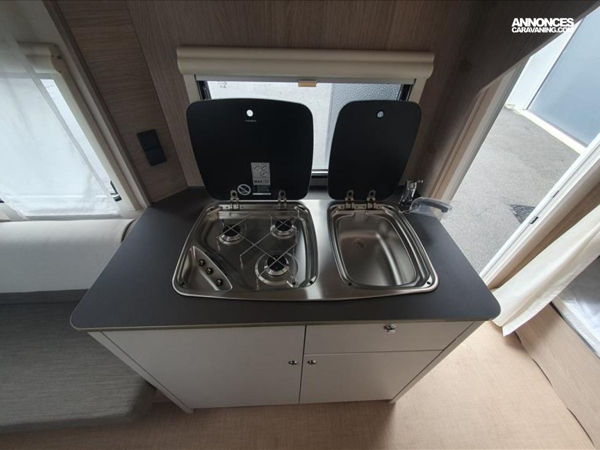 Chasis en acier galvanisé ultra-leger, Chauffage S 3004, Isolation passage de roue, Eclairage LED 12v/230v, Baie double vitrage ouvrantes teintées avec store, Plaque de cuisson à gaz 3 feux et allumage électrique, Prises électriques 230 V, Transformateur 350 VA, Vérins de stabilisation renforcés, WC casette, Tête d'attelage, Eclairage d'auvent à LED