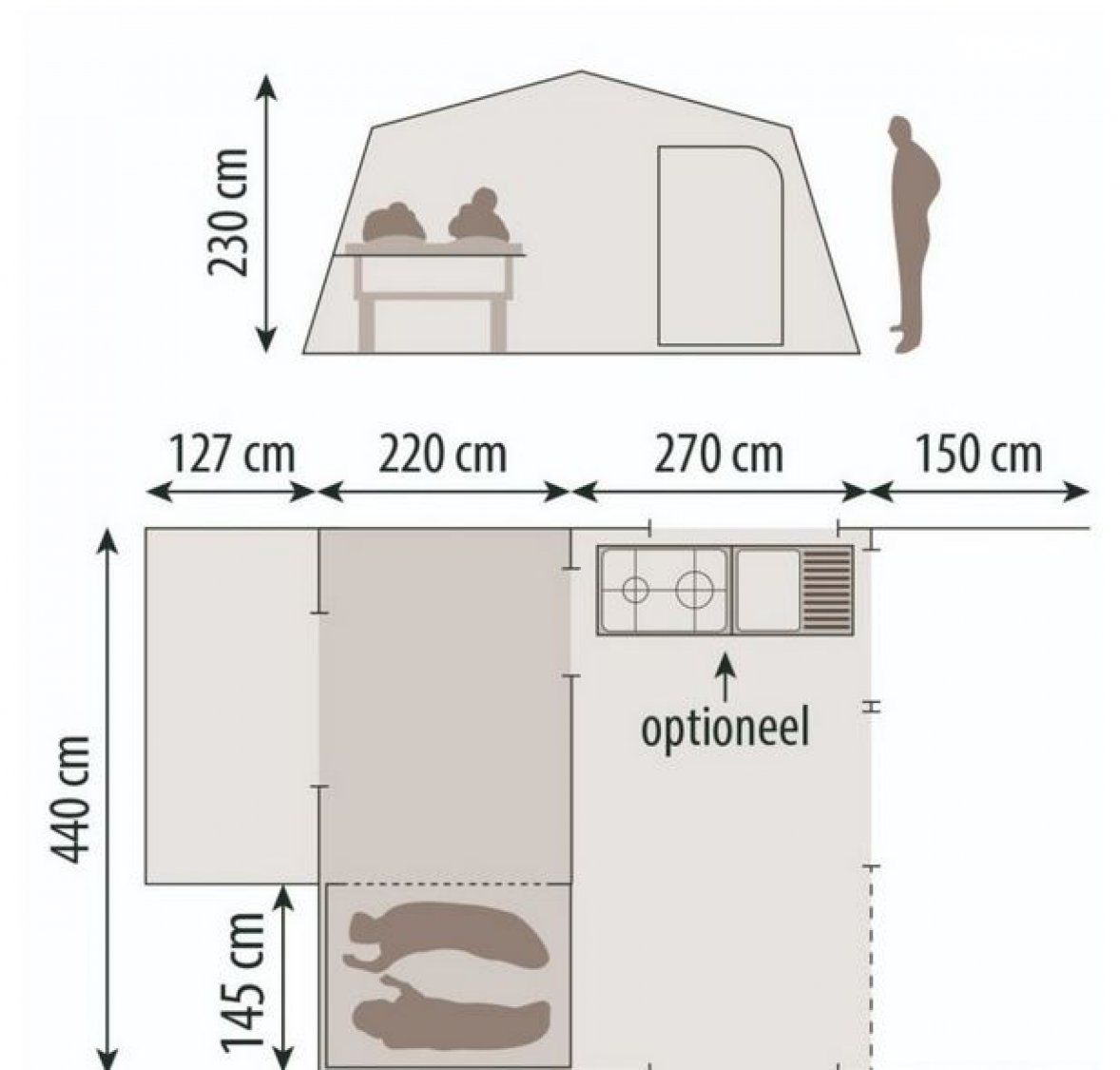Armature en acier inaltérable avec renforts d'angles et points d'haubanage externes répartis selon la forme de la tente, offrant une parfaite stabilité et une grande résistance aux vents. Doubles coutures des toiles et fermetures zippées à grosses mailles renforcées pour une extrême solidité.